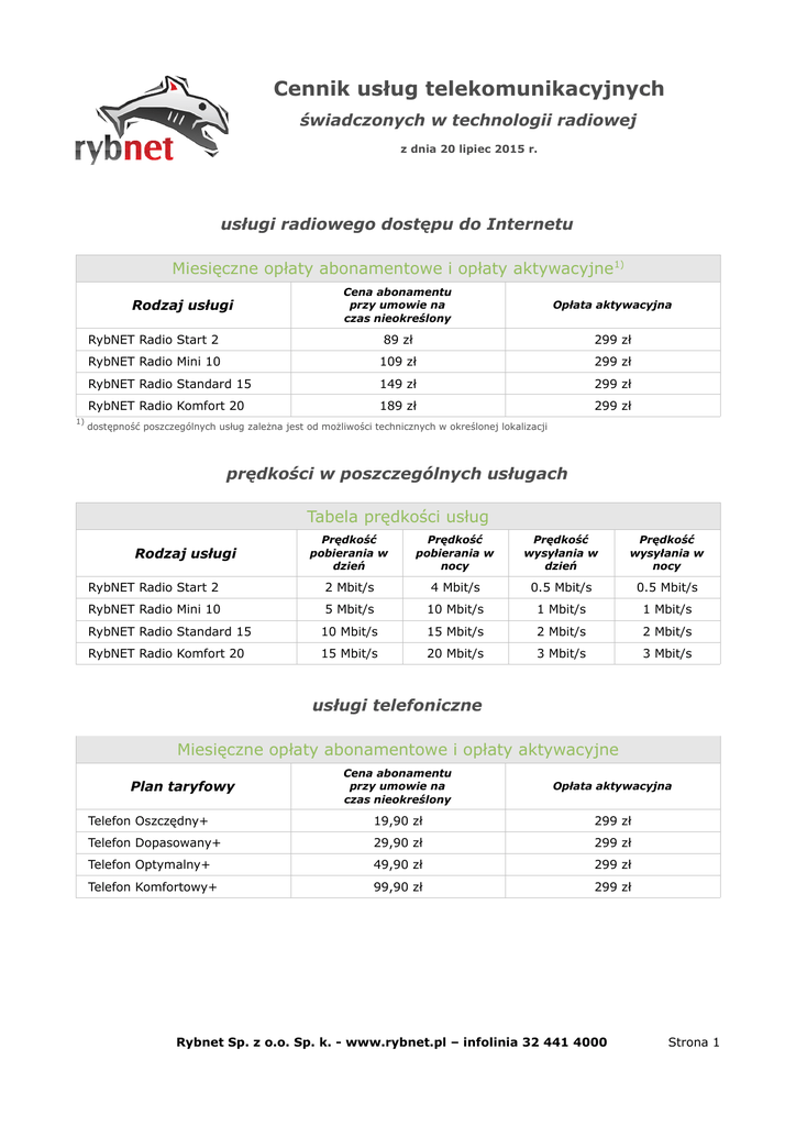 Cennik usług telekomunikacyjnych świadczonych w technologii radiowej z dnia 20 lipiec 2015 r. usługi radiowego dostępu do Internetu Miesięczne opłaty abonamentowe i opłaty aktywacyjne1) Cena abonamentu przy umowie na czas nieokreślony Opłata aktywacyjna RybNET Radio Start 2 89 zł 299 zł RybNET Radio Mini 10 109 zł 299 zł RybNET Radio Standard 15 149 zł 299 zł RybNET Radio Komfort 20 189 zł 299 zł Rodzaj usługi 1) dostępność poszczególnych usług zależna jest od możliwości technicznych w określonej lokalizacji prędkości w poszczególnych usługach Tabela prędkości usług Prędkość pobierania w dzień Prędkość pobierania w nocy Prędkość wysyłania w dzień Prędkość wysyłania w nocy RybNET Radio Start 2 2 Mbit/s 4 Mbit/s 0.5 Mbit/s 0.5 Mbit/s RybNET Radio Mini 10 5 Mbit/s 10 Mbit/s 1 Mbit/s 1 Mbit/s RybNET Radio Standard 15 10 Mbit/s 15 Mbit/s 2 Mbit/s 2 Mbit/s RybNET Radio Komfort 20 15 Mbit/s 20 Mbit/s 3 Mbit/s 3 Mbit/s Rodzaj usługi usługi telefoniczne Miesięczne opłaty abonamentowe i opłaty aktywacyjne Cena abonamentu przy umowie na czas nieokreślony Opłata aktywacyjna Telefon Oszczędny+ 19,90 zł 299 zł Telefon Dopasowany+ 29,90 zł 299 zł Telefon Optymalny+ 49,90 zł 299 zł Telefon Komfortowy+ 99,90 zł 299 zł Plan taryfowy Rybnet Sp. z o.o. Sp. k. - www.rybnet.pl – infolinia 32 441 4000 Strona 1 pozostałe opłaty związane z usługami RybNET Usługi dodatkowe Rodzaj usługi Publiczny adres IP (opłata miesięczna) Cena bez opłat Dzierżawa dodatkowej bramki VoIP obsługującej 2 numery (opłata miesięczna) 15 zł Wizyta serwisowa - na życzenie klienta, konfiguracja routera/komputera 50 zł Wizyta serwisowa - nieuzasadnione wezwanie serwisu/wymiana uszkodzonego okablowania 50 zł Opłaty dodatkowe Rodzaj opłaty Cena Przeniesienie usługi w inna lokalizację 50 zł Zawieszenie usługi (opłata jednorazowa) – możliwe zawieszenie do 6-ciu miesięcy 99 zł Wymiana (w trakcie trwania Umowy) Urządzenia Abonenckiego z usterką bez opłat Urządzenia i usługi Rodzaj urządzenia lub usługi Cena Karta sieciowa LAN 20 zł Karta sieciowa bezprzewodowa N 300 Mbps 2.4 GHz USB 60 zł Karta sieciowa bezprzewodowa AC 1200 Mbps 2.4 GHz/5 GHz USB Switch 8-portowy 130 zł 70 zł Router bezprzewodowy 150Mbps (z konfiguracją) 100 zł Router bezprzewodowy N 300Mbps 2.4 GHz (z konfiguracją) 150 zł Router bezprzewodowy AC 1200Mbps 2.4 GHz/5 GHz (z konfiguracją) 300 zł Bramka VoIP dla dodatkowych usług telefonicznych (z konfiguracją) 250 zł Telefon ze wzmocnieniem dźwięku dla niedosłyszących Plantronics EXL30 Clarity 450 zł Wzmacniacz do słuchawki telefonu stacjonarnego Plantronics CLARITY ECE125 130 zł Wszystkie powyższe ceny są cenami brutto i zawierają podatek VAT Rybnet Sp. z o.o. Sp. k. - www.rybnet.pl – infolinia 32 441 4000 Strona 2