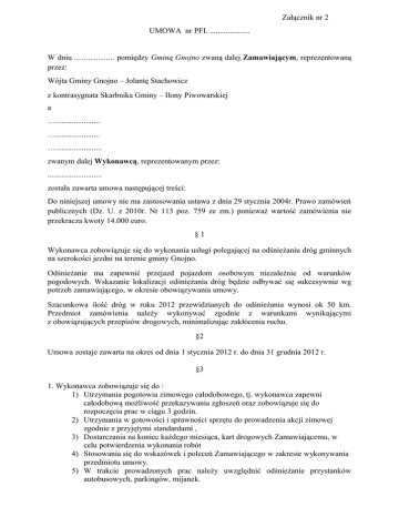 Załącznik nr 2 UMOWA nr PFI. .................... W dniu .................... pomiędzy Gminą Gnojno zwaną dalej Zamawiającym, reprezentowaną przez: Wójta Gminy Gnojno – Jolantę Stachowicz z kontrasygnata Skarbnika Gminy – Ilony Piwowarskiej a …...................... …...................... …....................... zwanym dalej Wykonawcą, reprezentowanym przez: ........................... została zawarta umowa następującej treści: Do niniejszej umowy nie ma zastosowania ustawa z dnia 29 stycznia 2004r. Prawo zamówień publicznych (Dz. U. z 2010r. Nr 113 poz. 759 ze zm.) ponieważ wartość zamówienia nie przekracza kwoty 14.000 euro. §1 Wykonawca zobowiązuje się do wykonania usługi polegającej na odśnieżaniu dróg gminnych na szerokości jezdni na terenie gminy Gnojno. Odśnieżanie ma zapewnić przejazd pojazdom osobowym niezależnie od warunków pogodowych. Wskazanie lokalizacji odśnieżania dróg będzie odbywać się sukcesywnie wg potrzeb zamawiającego, w okresie obowiązywania umowy. Szacunkowa ilość dróg w roku 2012 przewidzianych do odśnieżania wynosi ok 50 km. Przedmiot zamówienia należy wykonywać zgodnie z warunkami wynikającymi z obowiązujących przepisów drogowych, minimalizując zakłócenia ruchu. §2 Umowa zostaje zawarta na okres od dnia 1 stycznia 2012 r. do dnia 31 grudnia 2012 r. §3 1. Wykonawca zobowiązuje się do : 1) Utrzymania pogotowia zimowego całodobowego, tj. wykonawca zapewni całodobową możliwość przekazywania zgłoszeń oraz zobowiązuje się do rozpoczęcia prac w ciągu 3 godzin. 2) Utrzymania w gotowości i sprawności sprzętu do prowadzenia akcji zimowej zgodnie z przyjętymi standardami , 3) Dostarczania na koniec każdego miesiąca, kart drogowych Zamawiającemu, w celu potwierdzenia wykonania robót 4) Stosowania się do wskazówek i poleceń Zamawiającego w zakresie wykonywania przedmiotu umowy. 5) W trakcie prowadzonych prac należy uwzględnić odśnieżanie przystanków autobusowych, parkingów, mijanek. 6) W przypadku awarii sprzętu wykonawca we własnym zakresie zapewni inny sprzęt, a do rozliczeń stosowane będą ceny zgodnie ze złożoną ofertą 2. Wykonawca zapewnia, że wszystkie osoby wyznaczone przez niego do realizacji niniejszej umowy posiadają odpowiednie kwalifikacje oraz przeszkolenia i uprawnienia wymagane przepisami prawa ( w szczególności BHP). 3. Odpowiedzialność cywilna za szkody oraz następstwa nieszczęśliwych wypadków dotyczących pracowników i osób trzecich, a powstałych w związku z wykonywanymi usługami, w tym także ruchem pojazdów i sprzętu, ponosi Wykonawca. 4. Wykonawca ponosi pełna odpowiedzialność za szkody wobec osób trzecich w przypadku nie wykonania usługi zgodnie ze standardem zimowego utrzymania. 5. Wykonawca ponosi odpowiedzialność za bezpieczeństwo ruchu oraz utrudnienia w ruchu związane z wykonywaniem usługi. 6. Wykonawca zobowiązuje się realizować prace określone w §1 umowy zgodnie z obowiązującymi przepisami i normami w zakresie ochrony środowiska. §4 1. Strony ustalają, że obowiązującą ich formą wynagrodzenia, zgodnie z przeprowadzonymi negocjacjami będzie cena jednostkowa tj. stawki za 1km odśnieżania w wysokości: netto …...........zł podatek VAT.............. zł brutto..............zł słownie: …............................... Ceny te są niezmienne przez cały okres obowiązywania umowy. 2. Do odśnieżania będzie użyty następujący sprzęt (wg oferty) – …................. 3. W przypadku zmiany wysokości stawki podatku od towarów i usług (VAT), cena usługi ulega automatycznie zmianie z dniem wejścia w życie właściwych przepisów, poprzez doliczenie do kwoty netto wynagrodzenia, o którym mowa w ust. 1 nowej stawki tego podatku. Powyższa zmiana nie wymaga aneksu do umowy. §5 1. Płatność za wykonywanie usługi następować będzie na podstawie faktur miesięcznych w ciągu 30 dni od dnia ich otrzymania na konto Wykonawcy. 2. Podstawą do wystawienia faktury będą potwierdzone przez sołtysa miejscowości w której wykonywana była usługa karty drogowe. 3. W razie konieczności zwiększenia intensywności usług ze względu na szczególne warunki atmosferyczne dopuszcza się możliwość wystawiania faktur dodatkowych. §6 1. Za każdy przypadek niewykonania usługi, bądź niewłaściwego jej wykonania Zamawiający może potrącić z faktury za dany miesiąc kwotę ryczałtową w wysokości 500 zł. Przez niewłaściwe wykonanie przedmiotu umowy rozumie się brak wykonania robót, ich nienależyte wykonanie oraz niedostosowanie do obowiązujących standardów. 2. Podstawą do stwierdzenia niewykonania lub nienależytego wykonania zadań objętych umowa stanowić będą protokóły sporządzone przez Zamawiającego i przedstawione Wykonawcy. 3. W przypadku niewykonania postanowień niniejszej umowy przez Wykonawcę przez okres dłuższy niż dwa dni, Zamawiającemu przysługuje prawo powierzenia prac osobie trzeciej na koszt i ryzyko Wykonawcy. 4. W razie trzykrotnego braku wykonania przedmiotu zamówienia Zamawiającemu przysługuje prawo odstąpienia od umowy. 5. Wykonawca zapłaci Zamawiającemu karę umowną za odstąpienie od umowy z przyczyn leżących po stronie Wykonawcy w wysokości 2000 zł. 6. Taką samą karę zapłaci Zamawiający Wykonawcy za odstąpienie od umowy z przyczyn leżących po stronie Zamawiającego. 7. Zamawiający zastrzega sobie prawo do odszkodowania uzupełniającego, przewyższającego wysokość kar umownych do rzeczywiście poniesionej szkody. §7 1. Odpowiedzialnym za wykonanie zamówienia ze strony Wykonawcy jest …..................................... tel.......................................... §8 1. W sprawach nie uregulowanych w umowie, mają zastosowanie odpowiednie przepisy kodeksu cywilnego. 2. Wszystkie spory wynikające z wykonania tej umowy, które nie mogą być rozstrzygnięte polubownie, będą przekazywane do rozstrzygania wła