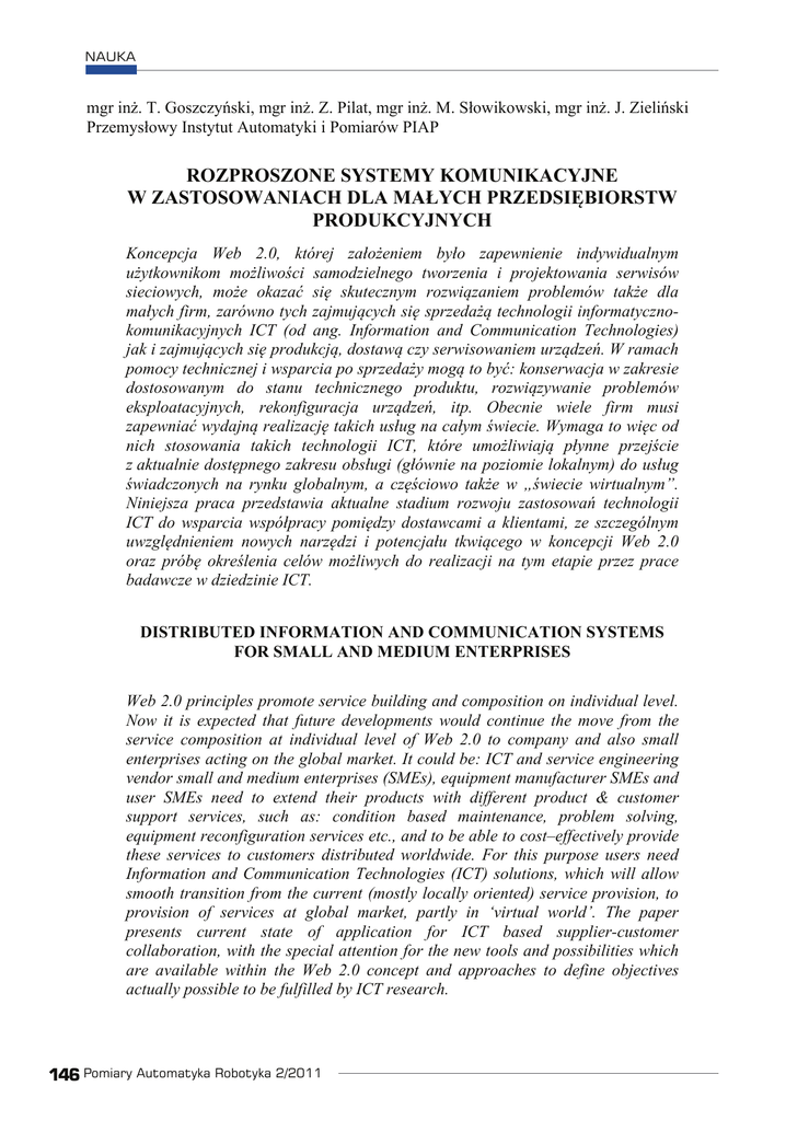 NAUKA mgr inĪ. T. GoszczyĔski, mgr inĪ. Z. Pilat, mgr inĪ. M. Sáowikowski, mgr inĪ. J. ZieliĔski Przemysáowy Instytut Automatyki i Pomiarów PIAP ROZPROSZONE SYSTEMY KOMUNIKACYJNE W ZASTOSOWANIACH DLA MAàYCH PRZEDSIĉBIORSTW PRODUKCYJNYCH Koncepcja Web 2.0, której zaáoĪeniem byáo zapewnienie indywidualnym uĪytkownikom moĪliwoĞci samodzielnego tworzenia i projektowania serwisów sieciowych, moĪe okazaü siĊ skutecznym rozwiązaniem problemów takĪe dla maáych firm, zarówno tych zajmujących siĊ sprzedaĪą technologii informatycznokomunikacyjnych ICT (od ang. Information and Communication Technologies) jak i zajmujących siĊ produkcją, dostawą czy serwisowaniem urządzeĔ. W ramach pomocy technicznej i wsparcia po sprzedaĪy mogą to byü: konserwacja w zakresie dostosowanym do stanu technicznego produktu, rozwiązywanie problemów eksploatacyjnych, rekonfiguracja urządzeĔ, itp. Obecnie wiele firm musi zapewniaü wydajną realizacjĊ takich usáug na caáym Ğwiecie. Wymaga to wiĊc od nich stosowania takich technologii ICT, które umoĪliwiają páynne przejĞcie z aktualnie dostĊpnego zakresu obsáugi (gáównie na poziomie lokalnym) do usáug Ğwiadczonych na rynku globalnym, a czĊĞciowo takĪe w „Ğwiecie wirtualnym”. Niniejsza praca przedstawia aktualne stadium rozwoju zastosowaĔ technologii ICT do wsparcia wspóápracy pomiĊdzy dostawcami a klientami, ze szczególnym uwzglĊdnieniem nowych narzĊdzi i potencjaáu tkwiącego w koncepcji Web 2.0 oraz próbĊ okreĞlenia celów moĪliwych do realizacji na tym etapie przez prace badawcze w dziedzinie ICT. DISTRIBUTED INFORMATION AND COMMUNICATION SYSTEMS FOR SMALL AND MEDIUM ENTERPRISES Web 2.0 principles promote service building and composition on individual level. Now it is expected that future developments would continue the move from the service composition at individual level of Web 2.0 to company and also small enterprises acting on the global market. It could be: ICT and service engineering vendor small and medium enterprises (SMEs), equipment manufacturer SMEs and user SMEs need to extend their products with different product & customer support services, such as: condition based maintenance, problem solving, equipment reconfiguration services etc., and to be able to cost–effectively provide these services to customers distributed worldwide. For this purpose users need Information and Communication Technologies (ICT) solutions, which will allow smooth transition from the current (mostly locally oriented) service provision, to provision of services at global market, partly in ‘virtual world’. The paper presents current state of application for ICT based supplier-customer collaboration, with the special attention for the new tools and possibilities which are available within the Web 2.0 concept and approaches to define objectives actually possible to be fulfilled by ICT research. 146 Pomiary Automatyka Robotyka 2/2011 NAUKA 1. WPROWADZENIE Niniejsza p raca przeds tawia aktu alne stad ium rozwoju zastosowa Ĕ technologii ICT we wspóápracy pom iĊdzy dostawcam i a klientam i m aáych przedsi Ċbiorstw, ze szczególnym uwzglĊdnieniem nowych narzĊdzi i potencjaáu tkwiącego w koncepcji Web 2.0. Do czasu pojawienia siĊ Web 2.0 sieü WWW gáównie rozumiana byáa jako inne, nowe Ĩródáo informacji, gdzie mo ĪliwoĞci u Īytkowników by áy ograniczone tylko do biernego wykorzystywania zaoferowanej im zawarto Ğci. W eb 2.0 z tego rodzaju Ĩródáa „tylko do odczytu” m iaáa by ü stopniowo przekszta ácona do kultury „do odczytu i zapisu” [1], gdzie uĪytkownicy nie tylko konsum owaliby oferowane treĞci, ale równieĪ aktywnie braliby udzia á w tworzeniu i modyfikowaniu zasobów informacyjnych oraz rozwoju sieci Web. 2. TECHNOLOGIA WEB 2.0 Koncepcja Web 2.0 z akáada promowanie projektowania i tworzenia us áug na poziom ie indywidualnym, a w przysz áoĞci najprawdopodobniej prze áoĪy si Ċ to tak Īe na poziom przedsiĊbiorstwa lub grupy. Widoczny jest juĪ wyraĨny trend w kierunku zastosowaĔ jej poza jednostkami i ich niewielkimi grupami, na poziomie caáych organizacji i przedsiĊbiorstw. Jest takĪe bardzo prawdopodobne, Īe d o rozszerzo nych sieci wym iany infor macji i wspó ápracy wáączone zostaną takĪe maszyny, a wspóápraca bĊdzie odbywaü siĊ na masową skalĊ i wedáug globalnych planów. Sz czególny nacisk k áadzie siĊ na us áugi i n arzĊdzia wykorzystywane do wspóápracy, tzn. narz Ċdzia zap ewniające wsparcie wspó ápracy offline lub online: rozwój kluczowych funkcji realizuj ących usáugi oraz ich struktur Ċ, dostosowanie do indywidualnych potrzeb, ak tualizacjĊ, konserwacj Ċ, itp. Ma to na celu „zacieranie granic p omiĊdzy projektowaniem a u Īytkowaniem, z bezpo Ğrednim lub po Ğrednim uwzglĊdnieniem koncepcji Web 2.0” [2]. Dzi Ċki tem u, m oĪliwa b Ċdzie realizacja ostatecznego celu, k tórym jest tworzenie szybszych, ta Ĕszych, bardziej elastycznych i wy Īszej jako Ğci us áug opartych na wspóápracy, a tak Īe budowa modeli stanowi ących Ĩródáo odniesienia dla Ğrodowisk wspóápracy (ang. Collaborative Working Environment, CWE) um oĪliwiających „automatyczne” tworzenie i integ racjĊ podstawowych funkcji realizuj ących te us áugi, z uwzglĊdnieniem Web 2.0. Taka koncepcja zawarto Ğci sieci, wytwarzanej przez tej sieci u Īytkownika, wym usza moĪliwoĞü, zdolnoĞü owego uĪytkownika, by interaktywnie tworzyü i edytowaü tą zawartoĞü. W konsekwencji, dostawcy Internetu online przestawili si Ċ na to, Īe ich gáównym celem jest nie tylko dostarczanie zawarto Ğci, ale te Ī tworzenie m oĪliwoĞci dla u Īytkowników, by m ogli oni tworzyü i publikowaü ich wáasne treĞci. Projekt W EB-2-SME zam ierza propagowa ü to przesuni Ċcie od us áug kierowanych do indywidualnego uĪytkownika do takich samych usáug dla przedsiĊbiorstwa, a szczególnie dla maáych i Ğrednich przedsiĊbiorstw MĝP (ang