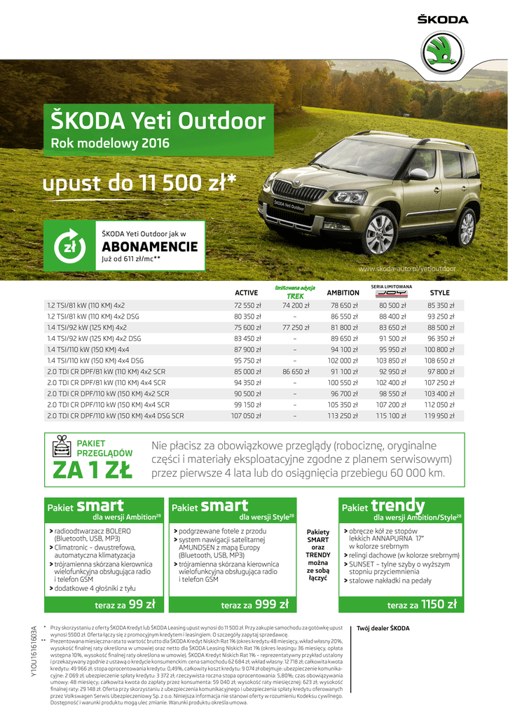 ŠKODA Yeti Outdoor Rok modelowy 2016 upust do 11 500 zł* ŠKODA Yeti Outdoor jak w ABONAMENCIE Już od 611 zł/mc** www.skoda-auto.pl/yetioutdoor ACTIVE TREK AMBITION SERIA LIMITOWANA STYLE 1.2 TSI/81 kW (110 KM) 4x2 72 550 zł 74 200 zł 78 650 zł 80 500 zł 85 350 zł 1.2 TSI/81 kW (110 KM) 4x2 DSG 80 350 zł – 86 550 zł 88 400 zł 93 250 zł 1.4 TSI/92 kW (125 KM) 4x2 75 600 zł 77 250 zł 81 800 zł 83 650 zł 88 500 zł 1.4 TSI/92 kW (125 KM) 4x2 DSG 83 450 zł – 89 650 zł 91 500 zł 96 350 zł 1.4 TSI/110 kW (150 KM) 4x4 87 900 zł – 94 100 zł 95 950 zł 100 800 zł 1.4 TSI/110 kW (150 KM) 4x4 DSG 95 750 zł – 102 000 zł 103 850 zł 108 650 zł 2.0 TDI CR DPF/81 kW (110 KM) 4x2 SCR 85 000 zł 86 650 zł 91 100 zł 92 950 zł 97 800 zł 2.0 TDI CR DPF/81 kW (110 KM) 4x4 SCR 94 350 zł – 100 550 zł 102 400 zł 107 250 zł 2.0 TDI CR DPF/110 kW (150 KM) 4x2 SCR 90 500 zł – 96 700 zł 98 550 zł 103 400 zł 99 150 zł – 105 350 zł 107 200 zł 112 050 zł 107 050 zł – 113 250 zł 115 100 zł 119 950 zł 2.0 TDI CR DPF/110 kW (150 KM) 4x4 SCR 2.0 TDI CR DPF/110 kW (150 KM) 4x4 DSG SCR PAKIET PRZEGLĄDÓW ZA 1 ZŁ Pakiet Nie płacisz za obowiązkowe przeglądy (robociznę, oryginalne części i materiały eksploatacyjne zgodne z planem serwisowym) przez pierwsze 4 lata lub do osiągnięcia przebiegu 60 000 km. smart dla wersji Ambition 28 > radioodtwarzacz BOLERO (Bluetooth, USB, MP3) > Climatronic – dwustrefowa, automatyczna klimatyzacja > trójramienna skórzana kierownica wielofunkcyjna obsługująca radio i telefon GSM > dodatkowe 4 głośniki z tyłu teraz za Y1OU16161603A limitowana edycja 99 zł Pakiet smart dla wersji Style Pakiet 28 > podgrzewane fotele z przodu > system nawigacji satelitarnej AMUNDSEN z mapą Europy (Bluetooth, USB, MP3) > trójramienna skórzana kierownica wielofunkcyjna obsługująca radio i telefon GSM teraz za Pakiety SMART oraz TRENDY można ze sobą łączyć 999 zł *Przy skorzystaniu z oferty ŠKODA Kredyt lub ŠKODA Leasing upust wynosi do 11 500 zł. Przy zakupie samochodu za gotówkę upust wynosi 5500 zł. Oferta łączy się z promocyjnym kredytem i leasingiem. O szczegóły zapytaj sprzedawcę. **Prezentowana miesięczna rata to wartość brutto dla ŠKODA Kredyt Niskich Rat 1% (okres kredytu 48 miesięcy, wkład własny 20%, wysokość finalnej raty określona w umowie) oraz netto dla ŠKODA Leasing Niskich Rat 1% (okres leasingu 36 miesięcy, opłata wstępna 10%, wysokość finalnej raty określona w umowie). ŠKODA Kredyt Niskich Rat 1% – reprezentatywny przykład ustalony i przekazywany zgodnie z ustawą o kredycie konsumenckim: cena samochodu 62 684 zł; wkład własny: 12 718 zł; całkowita kwota kredytu: 49 966 zł; stopa oprocentowania kredytu: 0,49%, całkowity koszt kredytu: 9 074 zł obejmuje: ubezpieczenie komunikacyjne: 2 069 zł, ubezpieczenie spłaty kredytu: 3 372 zł; rzeczywista roczna stopa oprocentowania: 5,80%; czas obowiązywania umowy: 48 miesięcy; całkowita kwota do zapłaty przez konsumenta: 59 040 zł; wysokość raty miesięcznej: 623 zł; wysokość finalnej raty: 29 148 zł. Oferta przy skorzystaniu z ubezpieczenia komunikacyjnego i ubezpieczenia spłaty kredytu oferowanych przez Volkswagen Serwis Ubezpieczeniowy Sp. z o.o. Niniejsza informacja nie stanowi oferty w rozumieniu Kodeksu cywilnego. Dostępność i warunki produktu mogą ulec zmianie. Warunki produktu określa umowa. trendy dla wersji Ambition/Style28 > obręcze kół ze stopów lekkich ANNAPURNA 17” w kolorze srebrnym > relingi dachowe (w kolorze srebrnym) > SUNSET – tylne szyby o wyższym stopniu przyciemnienia > stalowe nakładki na pedały teraz za Twój dealer ŠKODA 1150 zł ŠKODA Yeti Outdoor limitowana edycja SERIA LIMITOWANA ACTIVE TREK AMBITION Poduszka powietrzna dla kierowcy i pasażera Dezaktywacja czołowej poduszki pasażera Boczne poduszki powietrzne z przodu Kurtyny powietrzne 1 600 1 600 Boczne poduszki powietrzne z tyłu z kurtynami powietrznymi 2 900 2 900 1 300 1 300 1 300 Poduszka chroniąca kolana kierowcy 1 000 1 000 Trzypunktowe pasy bezpieczeństwa z przodu (z pirotechnicznymi napinaczami) Trzypunktowe pasy bezpieczeństwa z tyłu Kontrolka niezapiętych pasów kierowcy i pasażera Zagłówki przednie typu WOKS Trzy zagłówki tylne z regulacją wysokości Uchwyty ISOFIX na zewnętrznych fotelach z tyłu Uchwyty ISOFIX na fotelu pasażera z przodu 150 150 150 150 150 ESP (z ABS, EBV, MSR, ASR, EDS, HBA, DSR) Offroad – tryb wspomagania jazdy w trudnym terenie (tylko dla 4x4) 600 600 600 600 TPM – funkcja kontroli ciśnienia w oponach Blokada przeciwuruchomieniowa (immobiliser) 1 200 1 200 1 200 1 200 1 200 200 200 200 200 Funkcja Start Stop i odzyskiwania energii Podpowiedź zmiany biegów Pakiet Comfort dla wersji JOY – biksenonowe reflektory przednie z funkcją adaptacji świateł AFS, podgrzewane fotele z przodu, Light Assistant (Coming Home, Leaving Home, Tunnel Light, Day Light) – – – 3 100 – Przednie światła przeciwmgłowe 400 – 400 400 Elektromechaniczne wspomaganie kierownicy Halogenowe reflektory przednie – 4 400 – 3 700 3 700 Tylne światła wykonane w technologii LED 600 600 600 600 600 Spryskiwacze reflektorów przednich 700 700 Light Assistant (Coming home, Leaving home, Tunnel light, Day light) 300 300 300 300 – – 1 000 1 000 700 STYLE PODRÓŻUJ BEZPIECZNIE HHC – funkcja wspomagania ruszania pod wzniesienia dla systemu ESP21 Alarm z funkcją monitoringu wnętrza i czujnikiem przechyłu + niezależna syrena Funkcja ostrzegania przed zmęczeniem BĄDŹ EKO PO PIERWSZE FUNKCJONALNOŚĆ Przednie światła przeciwmgłowe z funkcją Corner Biksenonowe reflektory przednie z funkcją adaptacji świateł AFS ze spryskiwaczami oraz światłami do jazdy dziennej w technologii LED Światła do jazdy dziennej Light Assistant (Coming home, Leaving home, Tunnel light, Day light) z czujnikiem deszczu i automatycznie ściemniającym się lusterkiem wstecznym Oznaczenia