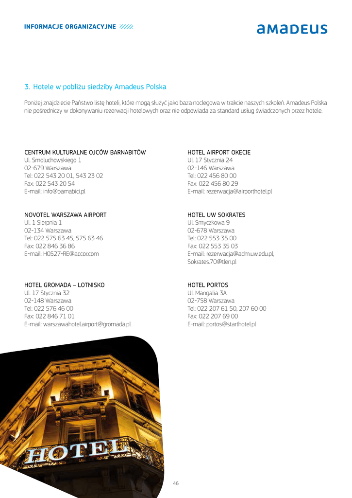 INFORMACJE ORGANIZACYJNE 3. Hotele w pobliżu siedziby Amadeus Polska Poniżej znajdziecie Państwo listę hoteli, które mogą służyć jako baza noclegowa w trakcie naszych szkoleń. Amadeus Polska nie pośredniczy w dokonywaniu rezerwacji hotelowych oraz nie odpowiada za standard usług świadczonych przez hotele. CENTRUM KULTURALNE OJCÓW BARNABITÓW Ul. Smoluchowskiego 1 02-679 Warszawa Tel: 022 543 20 01, 543 23 02 Fax: 022 543 20 54 E-mail: [email protected] HOTEL AIRPORT OKECIE Ul. 17 Stycznia 24 02-146 Warszawa Tel: 022 456 80 00 Fax: 022 456 80 29 E-mail: [email protected] NOVOTEL WARSZAWA AIRPORT Ul. 1 Sierpnia 1 02-134 Warszawa Tel: 022 575 63 45, 575 63 46 Fax: 022 846 36 86 E-mail: [email protected] HOTEL UW SOKRATES Ul. Smyczkowa 9 02-678 Warszawa Tel: 022 553 35 00 Fax: 022 553 35 03 E-mail: [email protected], [email protected] HOTEL GROMADA – LOTNISKO Ul. 17 Stycznia 32 02-148 Warszawa Tel: 022 576 46 00 Fax: 022 846 71 01 E-mail: [email protected] HOTEL PORTOS Ul. Mangalia 3A 02-758 Warszawa Tel: 022 207 61 50, 207 60 00 Fax: 022 207 69 00 E-mail: [email protected] 46 INFORMACJE ORGANIZACYJNE 4. Hotele w pobliżu centrum Warszawy IBIS WARSZAWA CENTRUM Al. Solidarności 165 00-876 Warszawa Tel: 022 520 30 00 E-mail: [email protected] www.ibishotel.com KYRIAD PRESTIGE HOTEL Ul. Towarowa 2 00-811 Warszawa Tel: 022 582 75 00 E-mail: [email protected] www.kyriadprestige.com.pl CAMPANILE Ul. Towarowa 2 00-811 Warszawa Tel: 022 582 72 00 E-mail: [email protected] www.campanile.com.pl PREMIERE CLASS HOTEL Ul. Towarowa 2 00-811 Warszawa Tel: 022 624 08 00 www.premiereclasse.com.pl 47