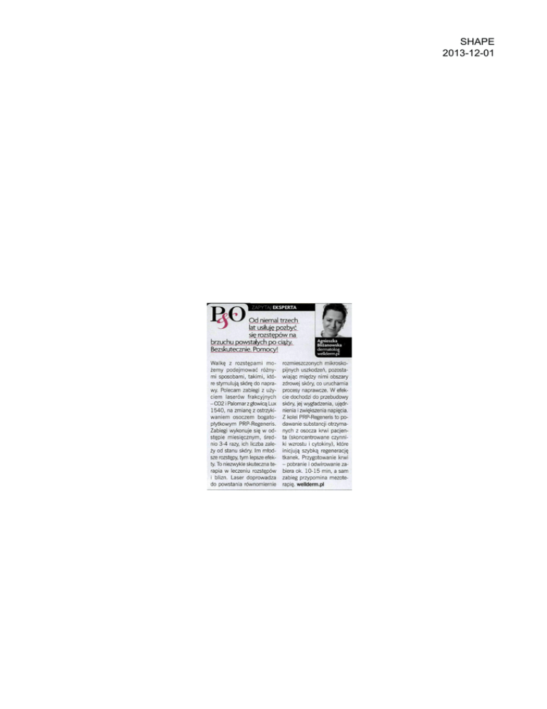 SHAPE 2013-12-01 ąo ZAPYTAJ EKSPERTA Od niemal trzech lat usiłuje pozbyć się rozstępów na brzuchu powstałych po ciąży. Bezskutecznie. Pomocy! Walkę z rozstępami mo żemy podejmować różny mi sposobami, takimi, któ re stymulują skórę do napra wy. Polecam zabiegi z uży ciem laserów frakcyjnych -CO2 i Palomarzgłowicąl_ux 1540, na zmianę z ostrzykiwaniem osoczem bogatopłytkowym PRP-Regeneris. Zabiegi wykonuje się w od stępie miesięcznym, śred nio 3-4 razy, ich liczba zale ży od stanu skóry. Im młod sze rozstępy, tym lepsze efek ty. To niezwykle skuteczna te rapia w leczeniu rozstępów i blizn. Laser doprowadza do powstania równomiernie meszka Blizanowska dermatolog wellderm.pl rozmieszczonych mikrosko pijnych uszkodzeń, pozosta wiając między nimi obszary zdrowej skóry, co uruchamia procesy naprawcze. W efek cie dochodzi do przebudowy skóry, jej wygładzenia, ujędr nienia i zwiększenia napięcia. Z kolei PRP-Regeneris to po dawanie substancji otrzyma nych z osocza krwi pacjen ta (skoncentrowane czynni ki wzrostu i cytokiny), które inicjują szybką regenerację tkanek. Przygotowanie krwi - pobranie i odwirowanie za biera ok. 10-15 min, a sam zabieg przypomina mezoterapię. wellderm.pl