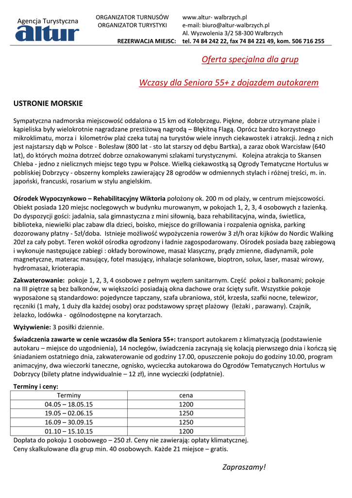 Agencja Turystyczna ORGANIZATOR TURNUSÓW ORGANIZATOR TURYSTYKI www.altur- walbrzych.pl e-mail: [email protected] Al. Wyzwolenia 3/2 58-300 Wałbrzych REZERWACJA MIEJSC: tel. 74 84 242 22, fax 74 84 221 49, kom. 506 716 255 Oferta specjalna dla grup Wczasy dla Seniora 55+ z dojazdem autokarem USTRONIE MORSKIE Sympatyczna nadmorska miejscowość oddalona o 15 km od Kołobrzegu. Piękne, dobrze utrzymane plaże i kąpieliska były wielokrotnie nagradzane prestiżową nagrodą – Błękitną Flagą. Oprócz bardzo korzystnego mikroklimatu, morza i kilometrów plaż czeka tutaj na turystów wiele innych ciekawostek i atrakcji. Jedną z nich jest najstarszy dąb w Polsce - Bolesław (800 lat - sto lat starszy od dębu Bartka), a zaraz obok Warcisław (640 lat), do których można dotrzeć dobrze oznakowanymi szlakami turystycznymi. Kolejna atrakcja to Skansen Chleba - jedno z nielicznych miejsc tego typu w Polsce. Wielką ciekawostką są Ogrody Tematyczne Hortulus w pobliskiej Dobrzycy - obszerny kompleks zawierający 28 ogrodów w odmiennych stylach i różnej treści, m. in. japoński, francuski, rosarium w stylu angielskim. Ośrodek Wypoczynkowo – Rehabilitacyjny Wiktoria położony ok. 200 m od plaży, w centrum miejscowości. Obiekt posiada 120 miejsc noclegowych w budynku murowanym, w pokojach 1, 2, 3, 4 osobowych z łazienką. Do dyspozycji gości: jadalnia, sala gimnastyczna z mini siłownią, baza rehabilitacyjna, winda, świetlica, biblioteka, niewielki plac zabaw dla dzieci, boisko, miejsce do grillowania i rozpalenia ogniska, parking dozorowany płatny - 5zł/doba. Istnieje możliwość wypożyczenia rowerów 3 zł/h oraz kijków do Nordic Walking 20zł za cały pobyt. Teren wokół ośrodka ogrodzony i ładnie zagospodarowany. Ośrodek posiada bazę zabiegową i wykonuje następujące zabiegi : okłady borowinowe, masaż klasyczny, prądy zmienne, diadynamik, pole magnetyczne, materac masujący, fotel masujący, inhalacje solankowe, bioptron, solux, laser, masaż wirowy, hydromasaż, krioterapia. Zakwaterowanie: pokoje 1, 2, 3, 4 osobowe z pełnym węzłem sanitarnym. Część pokoi z balkonami; pokoje na III piętrze są bez balkonów, w większości posiadają okna dachowe oraz ścięty sufit. Wszystkie pokoje wyposażone są standardowo: pojedyncze tapczany, szafa ubraniowa, stół, krzesła, szafki nocne, telewizor, ręczniki (1 mały, 1 duży dla każdej osoby) oraz podstawowy sprzęt plażowy (leżaki , parawany). Czajnik, żelazko, lodówka - ogólnodostępne na korytarzach. Wyżywienie: 3 posiłki dziennie. Świadczenia zawarte w cenie wczasów dla Seniora 55+: transport autokarem z klimatyzacją (podstawienie autokaru – miejsce do uzgodnienia), 14 noclegów, świadczenia zaczynają się kolacją pierwszego dnia i kończą się śniadaniem ostatniego dnia, zakwaterowanie od godziny 17.00, opuszczenie pokoju do godziny 10.00, program animacyjny, dwa wieczorki taneczne, ognisko, wycieczka autokarowa do Ogrodów Tematycznych Hortulus w Dobrzycy (bilety płatne indywidualnie – 12 zł), inne wycieczki (odpłatnie). Terminy i ceny: Terminy cena 04.05 – 18.05.15 1200 19.05 – 02.06.15 1250 16.09 – 30.09.15 1250 01.10 – 15.10.15 1200 Dopłata do pokoju 1 osobowego – 250 zł. Ceny nie zawierają: opłaty klimatycznej. Ceny skalkulowane dla grup min. 40 osobowych. Każde 21 miejsce – gratis. Zapraszamy!