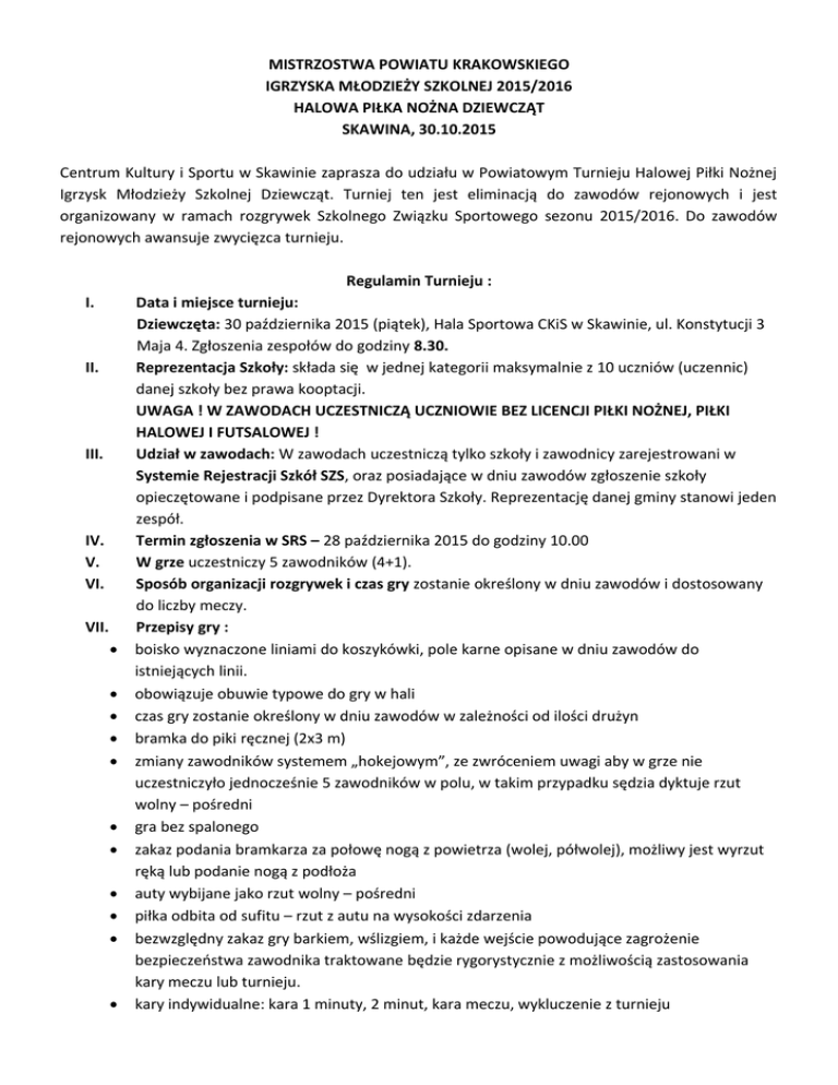 MISTRZOSTWA POWIATU KRAKOWSKIEGO IGRZYSKA MŁODZIEŻY SZKOLNEJ 2015/2016 HALOWA PIŁKA NOŻNA DZIEWCZĄT SKAWINA, 30.10.2015 Centrum Kultury i Sportu w Skawinie zaprasza do udziału w Powiatowym Turnieju Halowej Piłki Nożnej Igrzysk Młodzieży Szkolnej Dziewcząt. Turniej ten jest eliminacją do zawodów rejonowych i jest organizowany w ramach rozgrywek Szkolnego Związku Sportowego sezonu 2015/2016. Do zawodów rejonowych awansuje zwycięzca turnieju. Regulamin Turnieju : I. II. III. IV. V. VI. VII. Data i miejsce turnieju: Dziewczęta: 30 października 2015 (piątek), Hala Sportowa CKiS w Skawinie, ul. Konstytucji 3 Maja 4. Zgłoszenia zespołów do godziny 8.30. Reprezentacja Szkoły: składa się w jednej kategorii maksymalnie z 10 uczniów (uczennic) danej szkoły bez prawa kooptacji. UWAGA ! W ZAWODACH UCZESTNICZĄ UCZNIOWIE BEZ LICENCJI PIŁKI NOŻNEJ, PIŁKI HALOWEJ I FUTSALOWEJ ! Udział w zawodach: W zawodach uczestniczą tylko szkoły i zawodnicy zarejestrowani w Systemie Rejestracji Szkół SZS, oraz posiadające w dniu zawodów zgłoszenie szkoły opieczętowane i podpisane przez Dyrektora Szkoły. Reprezentację danej gminy stanowi jeden zespół. Termin zgłoszenia w SRS – 28 października 2015 do godziny 10.00 W grze uczestniczy 5 zawodników (4+1). Sposób organizacji rozgrywek i czas gry zostanie określony w dniu zawodów i dostosowany do liczby meczy. Przepisy gry : boisko wyznaczone liniami do koszykówki, pole karne opisane w dniu zawodów do istniejących linii. obowiązuje obuwie typowe do gry w hali czas gry zostanie określony w dniu zawodów w zależności od ilości drużyn bramka do piki ręcznej (2x3 m) zmiany zawodników systemem „hokejowym”, ze zwróceniem uwagi aby w grze nie uczestniczyło jednocześnie 5 zawodników w polu, w takim przypadku sędzia dyktuje rzut wolny – pośredni gra bez spalonego zakaz podania bramkarza za połowę nogą z powietrza (wolej, półwolej), możliwy jest wyrzut ręką lub podanie nogą z podłoża auty wybijane jako rzut wolny – pośredni piłka odbita od sufitu – rzut z autu na wysokości zdarzenia bezwzględny zakaz gry barkiem, wślizgiem, i każde wejście powodujące zagrożenie bezpieczeństwa zawodnika traktowane będzie rygorystycznie z możliwością zastosowania kary meczu lub turnieju. kary indywidualne: kara 1 minuty, 2 minut, kara meczu, wykluczenie z turnieju VIII. kary powinny być zastosowane między innymi za: o atak na przeciwnika barkiem, wślizg, zatrzymywanie, blokowanie, atak z tyłu, itp. o rozmyślne zagranie piłki ręką, o popchnięcie powodujące upadek o atak na przeciwnika z tyłu i spowodowanie upadku o powtórne nieprawidłowe wznowienie gry o umyślne symulowanie faulu lub kontuzji o celowe opóźnianie wznowienia gry o niesportowe zachowanie, wulgaryzmy o krytykowanie sędziego o gra na czas, symulowanie faulu o wejście na pole gry bez zezwolenia sędziego w pozostałych przypadkach mają zastosowanie przepisy gry w halową piłkę nożną oraz ustalenia organizatora z opiekunami drużyn w dniu zawodów Punktacja : Za zwycięstwo drużyna otrzymuje 3 pkt, remis 1 pkt, przegrana 0 pkt. O kolejności drużyny decyduje kolejno : - większa liczba zdobytych punktów, - większa liczba zdobytych punktów w meczach pomiędzy zainteresowanymi drużynami, - korzystniejsza różnica bramek zdobytych i straconych w spotkaniach tych zespołów, - lepsza różnica bramek w całym turnieju, - rzuty karne pomiędzy zainteresowanymi zespołami po 3 strzały i następnie do pierwszego rozstrzygnięcia W meczach które muszą przynieść rozstrzygnięcie w przypadku remisu grana jest dogrywka 5 minut, a w przypadku dalszego braku rozstrzygnięcia rzuty karne z odległości 7 metrów po 3 strzały, następne do rozstrzygnięcia. Kontakt oraz informacje – Dział Sportu i Rekreacji CKiS w Skawinie - 12 276 40 56, [email protected]