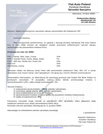 Fiat Auto Poland Dyrekcja Handlowa Sprzedaż Specjalna Warszawa, 19 lipca 2006r. Politechnika Śląska Akademicka 2A 44-100 Gliwice _______________________________ Dotyczy: stałych promocyjnych warunków zakupu samochodów dla Dostawców FAP ___________________________________________________________________________ Szanowni Państwo, Mam przyjemność poinformować, że zgodnie z decyzją Dyrekcji Handlowej Fiat Auto Poland S.A. w roku 2006 wzorem lat ubiegłych zostały przyznane preferencyjne warunki zakupu samochodów dla pracowników Państwa firmy. Promocja na cały rok 2006: FIAT – Panda, Stilo, Idea, Croma FIAT – Grande Punto, Punto, Albea, Doblo FIAT – 600 Van, Panda Van, Punto Van FIAT LCV Alfa Romeo, Lancia 10% 7% 10% 10% 10% Powyższe rabaty nie dotyczą wersji Fresh (dla samochodów osobowych Fiat), Alfy 147 w wersji Impression oraz innych wersji i serii specjalnych i nie łączą się z innymi ofertami promocyjnymi. Jednocześnie informujemy, że alternatywą do powyższej promocji jest kredyt Fiat Bank Polska na poniższych warunkach. W przypadku wyboru przez klienta promocyjnego kredytu z oprocentowaniem 4,9%, rabat zostaje pomniejszony -5%. Warunki kredytu: 1/ maksymalna kwota kredytu: 100% wartości samochodu, 2/ minimalna wpłata własna: 0% wartości samochodu, 3/ okres kredytowania od 12 do 60 miesięcy, 4/ oprocentowanie kredytu zmienne 4,9% dla wszystkich okresów kredytowania, 5/ opłata przygotowawcza: 0%. Pracownicy korzystać mogą również ze specjalnych ofert sprzedaży, które ogłaszane będą odrębnymi pismami przy okazji wprowadzania takich akcji. Powyższe warunki sprzedaży obowiązują do 31 grudnia 2006r. Zapraszając do odwiedzania salonów sprzedaży pozostaję z poważaniem Wojciech Halarewicz Dyrektor Handlowy Fiat Auto Poland SA _______________________________________________________________________________ Fiat Auto Poland, Dyrekcja Handlowa, Sprzedaż Specjalna; Ul Szturmowa 2; 02-678 Warszawa www.fiatflota.pl www.fiatautoexpert.pl