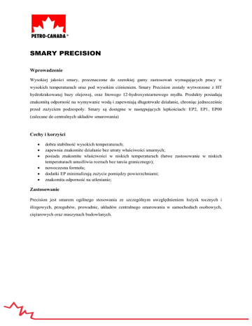 SMARY PRECISION Wprowadzenie Wysokiej jakości smary, przeznaczone do szerokiej gamy zastosowań wymagających pracy w wysokich temperaturach oraz pod wysokim ciśnieniem. Smary Precision zostały wytworzone z HT hydrokrakowanej bazy olejowej, oraz litowego 12-hydroxystearnowego mydła. Produkty posiadają znakomitą odporność na wymywanie wodą i zapewniają długotrwałe działanie, chroniąc jednocześnie przed zużyciem podzespoły. Smary są dostępne w następujących lepkościach: EP2, EP1, EP00 (zalecane do centralnych układów smarowania) Cechy i korzyści dobra stabilność wysokich temperaturach; zapewnia znakomite działanie bez utraty właściwości smarnych; posiada znakomite właściwości w niskich temperaturach (łatwe zastosowanie w niskich temperaturach umożliwia rozruch bez tarcia granicznego); nowoczesna formuła; dodatki EP minimalizują zużycie pomiędzy powierzchniami; znakomita odporność na utlenianie; Zastosowanie Precision jest smarem ogólnego stosowania ze szczególnym uwzględnieniem łożysk tocznych i ślizgowych, przegubów, prowadnic, układów centralnego smarowania w samochodach osobowych, ciężarowych oraz maszynach budowlanych. SMARY PRECISION GENERAL PURPOSE PRECISION GENERAL PURPOSE EP2 Wysokiej jakości smar stworzony z hydrokrakowanej bazy olejowej oraz hydroxystearnowego mydła litowego, znajduje szerokie zastosowanie w motoryzacji. Idealny do smarowania łożysk tocznych i ślizgowych, przegubów, prowadnic w samochodach osobowych, ciężarowych oraz maszynach budowlanych. Szeroki zakres temperatur i znakomita odporność na wymywanie wodą sprawia, że smar znakomicie konserwuje i zabezpiecza wszystkie podzespoły. PRECISION GENERAL PURPOSE MOLY EP2 Wielofunkcyjny smar litowy z dodatkiem dwusiarczku molibdenu, to idealne zabezpieczenie przed wibracjami i udarowym obciążeniem. Rekomendowany do pracy w wysoko obciążonych maszynach przemysłowych oraz sprzęcie pracującym poza utwardzonymi drogami. Smar posiada szeroki zakres temperatury pracy. PRECISION GENERAL PURPOSE EP1 Wysokiej jakości smar litowy powstały w oparciu o hydrokrakowaną bazę olejową oraz system specjalnych antyutleniaczy i dodatków EP. Smar może być stosowany w wysoko obciążonych łożyskach tłocznych i ślizgowych, zarówno w motoryzacji jak również w przemyśle. Charakteryzuje się odpornością na wymywanie wodą a odpowiednia konsystencja umożliwia aplikacje smaru za pomocą pneumatycznych smarownic. PARAMETRY FIZYKO-CHEMICZNE Właściwości Klasa konsystencji NLGI Metoda Testu PRECISION GENERAL PURPOSE EP1 EP2 MOLY EP2 D217 1 2 2 PCM 264 brązowy brązowy szary Temp. kroplenia, °C D2265 191 198 191 Penetracja pracy D217A 310 265 272 Lepkość oleju bazowego cSt 40 °C D445 159 159 159 Test Timkena, Kg/Ib D2509 18/40 18/40 18/40 D2596 250 250 315 Aparat 4-kulkowy, średnica skazy, mm D2266 0,58 0,59 0,56 Wymywanie wodą, %@79°C D1264 9,25 3,8 1,8 -30 do 135 -25 do 135 -25 do 135 Kolor Aparat 4-kulkowy, obciążenie zespawania, Kg Zakres temp. pracy, °C SMARY PRECISION XL PRECISION GENERAL XL EP2 Zalecany jest do smarowania wysoko i średnio obciążonych łożysk o zmiennych prędkościach pracy. Produkt może być stosowany jako zamiennik za Precision XL EP1 w mokrym środowisku pracy, ze względu na odporność przed wymywaniem wodą PRECISION GENERAL XL EP1 Smar zalecany do stosowania w układach centralnego smarowania, obsługujących zarówno duże (urządzenia przemysłowe i górnicze) i średnie obciążenia (łożyska ogólnego przeznaczenia). Produkt może być stosowany jako zamiennik za Precision XL EP2 podczas niskich temperatur. PRECISION GENERAL XL EP00 Jest smarem półpłynnym przeznaczonym do pracy w centralnym układzie smarowania oraz do smarowania napędów zębatych, gdzie wymagany jest wysokolepkościowy olej przekładniowy o dobrej pompowalności w niskich temperaturach. Produkt posiada dodatki poprawiające własności antykorozyjne i antyutleniające. Właściwości Metoda Testu EP00 PRECISION XL EP1 EP2 D217 00 1 2 PCM 264 zielony zielony zielony Temp. kroplenia, °C D2265 191 307 302 Penetracja pracy D217A 401 312 274 Lepkość oleju bazowego cSt 40 °C D445 120 220 220 Test Timkena, Kg/Ib D2509 18/40 27/60 27/60 D2596 250 315 315 Aparat 4-kulkowy, średnica skazy, mm D2266 0,38 0,5 0,5 Wymywanie wodą, %@79°C D1264 - 8,5 3,5 -35 do 100 -25 do 160 -20 do 160 Klasa konsystencji NLGI Kolor Aparat 4-kulkowy, obciążenie zespawania, Kg Zakres temp. pracy, °C Informacje na temat danych technicznych Informacje na temat danych technicznych smarów PRECISION lub innych produktów z asortymentu profesjonalnych środków smarowych Petro-Canada: Lubricants Head Office Petro-Canada 2310 Lakeshore Road West Mississauga, Ontario Canada L5J 1K2 Canada West ……….Tel. 1-800-661-1199 Internet: www.petro-canada.com Dystrybutor: VARIANT S.A. ul. Czerwieńskiego 3B 31-319 Kraków Tel.: 012 636 99 44 Fax: 012 637 26 78 www.variant.pl Niniejsze tłumaczenie oryginalnego dokumentu nie zostało wykonane przez firmę Petro-Canada