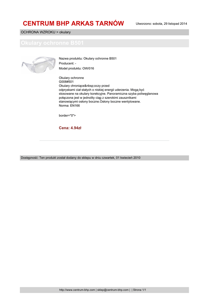 CENTRUM BHP ARKAS TARNÓW Utworzono: sobota, 29 listopad 2014 OCHRONA WZROKU > okulary Okulary ochronne B501 Nazwa produktu: Okulary ochronne B501 Producent: Model produktu: OW/016 Okulary ochronne G008#501 Okulary chroniące oczy przed odpryskami ciał stałych o niskiej energii uderzenia. Mogą być stosowane na okulary korekcyjne. Panoramiczna szyba poliwęglanowa połączona jest w jednolity ciąg z szerokimi zausznikami stanowiącymi osłony boczne.Osłony boczne wentylowane. Norma: EN166 border="0"> Cena: 4.94zł Dostępność: Ten produkt został dodany do sklepu w dniu czwartek, 01 kwiecień 2010 http://www.centrum-bhp.com | [email protected] | | Strona 1/1