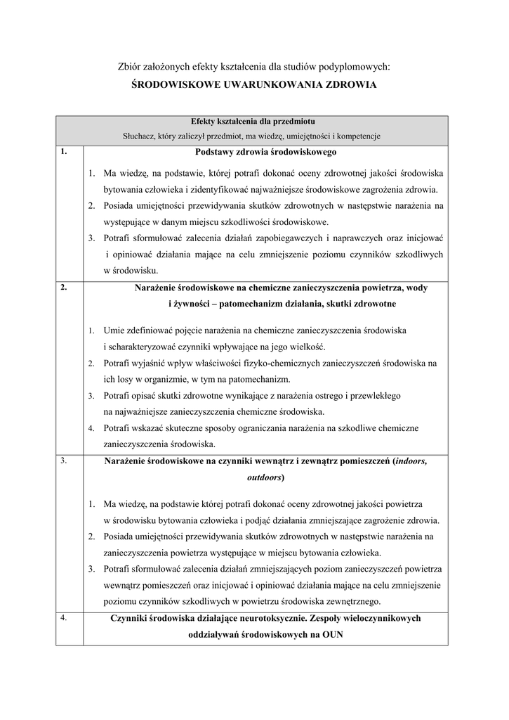 Zbiór założonych efekty kształcenia dla studiów podyplomowych: ŚRODOWISKOWE UWARUNKOWANIA ZDROWIA Efekty kształcenia dla przedmiotu Słuchacz, który zaliczył przedmiot, ma wiedzę, umiejętności i kompetencje Podstawy zdrowia środowiskowego 1. 1. Ma wiedzę, na podstawie, której potrafi dokonać oceny zdrowotnej jakości środowiska bytowania człowieka i zidentyfikować najważniejsze środowiskowe zagrożenia zdrowia. 2. Posiada umiejętności przewidywania skutków zdrowotnych w następstwie narażenia na występujące w danym miejscu szkodliwości środowiskowe. 3. Potrafi sformułować zalecenia działań zapobiegawczych i naprawczych oraz inicjować i opiniować działania mające na celu zmniejszenie poziomu czynników szkodliwych w środowisku. Narażenie środowiskowe na chemiczne zanieczyszczenia powietrza, wody 2. i żywności – patomechanizm działania, skutki zdrowotne 1. Umie zdefiniować pojęcie narażenia na chemiczne zanieczyszczenia środowiska i scharakteryzować czynniki wpływające na jego wielkość. 2. Potrafi wyjaśnić wpływ właściwości fizyko-chemicznych zanieczyszczeń środowiska na ich losy w organizmie, w tym na patomechanizm. 3. Potrafi opisać skutki zdrowotne wynikające z narażenia ostrego i przewlekłego na najważniejsze zanieczyszczenia chemiczne środowiska. 4. Potrafi wskazać skuteczne sposoby ograniczania narażenia na szkodliwe chemiczne zanieczyszczenia środowiska. 3. Narażenie środowiskowe na czynniki wewnątrz i zewnątrz pomieszczeń (indoors, outdoors) 1. Ma wiedzę, na podstawie której potrafi dokonać oceny zdrowotnej jakości powietrza w środowisku bytowania człowieka i podjąć działania zmniejszające zagrożenie zdrowia. 2. Posiada umiejętności przewidywania skutków zdrowotnych w następstwie narażenia na zanieczyszczenia powietrza występujące w miejscu bytowania człowieka. 3. Potrafi sformułować zalecenia działań zmniejszających poziom zanieczyszczeń powietrza wewnątrz pomieszczeń oraz inicjować i opiniować działania mające na celu zmniejszenie poziomu czynników szkodliwych w powietrzu środowiska zewnętrznego. 4. Czynniki środowiska działające neurotoksycznie. Zespoły wieloczynnikowych oddziaływań środowiskowych na OUN 1. Potrafi charakteryzować mechanizmy działania toksycznego ksenobiotyków ze szczególnym uwzględnieniem oddziaływania na OUN. Potrafi omówić związek między odrębnościami fizjologicznymi wieku dziecięcego, a oddziaływaniem ksenobiotyków. 2. Potrafi charakteryzować środowiskowe skażenie ołowiem, jego skutki neurobehawioralne, oraz metodologiczne aspekty badań nad neurotoksycznością ołowiu. 3. Potrafi opisać możliwości prewencji środowiskowego skażenia ołowiem. 4. Potrafi omówić problem globalnego zanieczyszczenia rtęcią, charakteryzować zagadnienie neurotoksyczności rtęci. 5. Potrafi charakteryzować pestycydy i inne związki organiczne i ich oddziaływanie na rozwijający się mózg, z uwzględnieniem aktualnych badań i poglądów. Czynniki środowiskowe o działaniu embriotoksycznym i teratogennym. Kancerogeny 5. środowiskowe 1. Ma wiedzę, na podstawie której potrafi rozróżnić kancerogenne, teratogenne i embriotoksyczne czynniki środowiskowe. 2. Posiada umiejętności przewidywania skutków zdrowotnych w następstwie długotrwałego narażenia na związki kancerogenne występujące w powietrzu, wodzie pitnej i żywności. 3. Potrafi sformułować zalecenia działań zapobiegawczych polegających głównie na świadomym doborze składników diety, ograniczając bądź wykluczając okresowo konsumpcję składników pokarmowych kumulujących duże ilości wymienionych związków. Ryzyko zdrowotne związane z narażeniem na promieniowanie jonizujące 6. i elektromagnetyczne 1. Umie opisać źródła emisji, właściwości oraz biologiczne efekty oddziaływania promieniowania jonizującego i elektromagnetycznego. 2. Potrafi opisać negatywne skutki zdrowotne działania PEM i promieniowania jonizującego. 3. Potrafi wskazać skuteczne sposoby ograniczania narażenia społeczeństwa na PEM i promieniowanie jonizujące. 7. Grupy szczególnego ryzyka w narażeniu środowiskowym; zdrowie środowiskowe dzieci 1. Ma wiedzę, na podstawie której potrafi dokonać oceny jakości środowiska bytowania dzieci oraz potrafi zidentyfikować najważniejsze środowiskowe zagrożenia zdrowia dzieci. 2. Posiada umiejętności przewidywania skutków zdrowotnych w populacji dzieci, w następstwie narażenia na występujące szkodliwości środowiskowe. 3. Potrafi sformułować zalecenia działań zapobiegawczych i naprawczych oraz inicjować i opiniować działania mające na celu zmniejszenie poziomu czynników szkodliwych w środowisku. 8. Szczególne problemy zdrowia środowiskowego. Wpływ składowisk odpadów i spalarni na zdrowie populacji. Skutki zdrowotne narażenia na nanocząstki 1. Ma wiedzę, na temat zagrożeń zdrowia związanych z nieumiejętnym postępowaniem z odpadami niebezpiecznymi , w tym medycznymi. Posiada również wiedzę na temat prawidłowych zachowań w przypadku konieczności utylizacji/zagospodarowania odpadów niebezpiecznych. 2. Posiada umiejętności przewidywania skutków zdrowotnych w następstwie narażenia na skutki uboczne spalania chlorowanych związków organicznych i wie jak im zapobiec. 3. Potrafi sformułować zalecenia działań profilaktycznych oraz podjąć działania mające na celu bezpieczną utylizację odpadów niebezpiecznych Epidemiologia środowiskowa jako narzędzie badawcze w zdrowiu środowiskowym 9. 1. 2. Posiada wiedzę dotyczącą rodzajów badań epidemiologicznych. Potrafi wskazać najważniejsze problemy metodologiczne, występujące w badaniach epidemiologicznych. 3. Potrafi samodzielnie ocenić wyniki badania epidemiologicznego w aspekcie związków przyczynowo-skutkowych. 4. Posiada kompetencje w zakresie samodzielnego programowania badania epidemiologicznego. 5. 10. Umie wykorzys