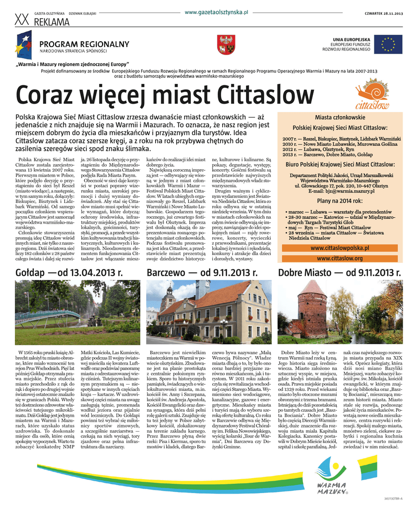XX REKLAMA GAZETA OLSZTYŃSKA DZIENNIK ELBLĄSKI www.gazetaolsztynska.pl CZWARTEK 28.11.2013 „Warmia i Mazury regionem zjednoczonej Europy” Projekt dofinansowany ze środków Europejskiego Funduszu Rozwoju Regionalnego w ramach Regionalnego Programu Operacyjnego Warmia i Mazury na lata 2007-2013 oraz z budżetu samorządu województwa warmińsko-mazurskiego Coraz więcej miast Cittaslow Polska Krajowa Sieć Miast Cittaslow zrzesza dwanaście miast członkowskich — aż jedenaście z nich znajduje się na Warmii i Mazurach. To oznacza, że nasz region jest miejscem dobrym do życia dla mieszkańców i przyjaznym dla turystów. Idea Cittaslow zatacza coraz szersze kręgi, a z roku na rok przybywa chętnych do zasilenia szeregów sieci spod znaku ślimaka. Polska Krajowa Sieć Miast Cittaslow została zarejestrowana 13 kwietnia 2007 roku. Pierwszym miastem w Polsce, które podjęło decyzję o przystąpieniu do sieci był Reszel (miasto wiodące), a następnie, w tym samym roku, dołączyły: Biskupiec, Bisztynek i Lidzbark Warmiński. Od samego początku członkiem wspierającym Cittaslow jest samorząd województwa warmińsko-mazurskiego. Członkowie stowarzyszenia promują ideę Cittaslow wśród innych miast, nie tylko z naszego regionu. Dziś światowa sieć liczy 182 członków z 28 państw całego świata i dalej się rozwi- ja. 26 listopada decyzję o przystąpieniu do Międzynarodowego Stowarzyszenia Cittaslow podjęła Rada Miasta Pasym. Obecność w sieci daje korzyści w postaci poprawy wizerunku miasta, szerokiej promocji i dużej wymiany doświadczeń. Aby stać się Cittaslow miasto musi spełnić wiele wymagań, które dotyczą: ochrony środowiska, infrastruktury miejskiej, produktów lokalnych, gościnności, turystyki, promocji, a przede wszystkim kultywowania tradycji historycznych, kulturowych i kulinarnych. Nieodzownym elementem funkcjonowania Cittaslow jest włączanie miesz- Gołdap —od 13.04.2013 r. W 1565 roku pruski książę Albrecht założył tu miasto obronne, które miało wzmocnić ten rejon Prus Wschodnich. Pięć lat później Gołdap otrzymała prawa miejskie. Przez stulecia miasto przechodziło z rąk do rąk i dopiero po drugiej wojnie światowej ostatecznie znalazło się w granicach Polski. Wtedy też dostrzeżono zdrowotne właściwości tutejszego mikroklimatu. Dziś Gołdap jest jedynym miastem na Warmii i Mazurach, które uzyskało status uzdrowiska. To doskonałe miejsce dla osób, które cenią spokojny wypoczynek. Warto tu zobaczyć konkatedrę NMP Matki Kościoła, Las Kumiecie, gdzie podczas II wojny światowej mieściła się kwatera Luftwaffe oraz podziwiać panoramę miasta z odrestaurowanej wieży ciśnień. Tutejszym kulinarnym przysmakiem są — niespotykane w innych częściach kraju — kartacze. W uzdrowiskowej części miasta na uwagę zasługują tężnie, promenada wzdłuż jeziora oraz pijalnie wód leczniczych. Do Gołdapi powinni też wybrać się miłośnicy sportów zimowych, a szczególnie narciarstwa — czekają na nich wyciągi, tory zjazdowe oraz pełna infrastruktura dla narciarzy. kańców do realizacji idei miast dobrego życia. Największą coroczną imprezą jest — odbywający się wiosną w jednym z miast członkowskich Warmii i Mazur — Festiwal Polskich Miast Cittaslow. W latach ubiegłych organizowały go Reszel, Lidzbark Warmiński i Nowe Miasto Lubawskie. Gospodarzem tegorocznego, już czwartego festiwalu był Olsztynek. Impreza jest doskonałą okazją do zaprezentowania rosnącego potencjału miast członkowskich. Podczas festiwalu promowana jest idea Cittaslow, a przedstawiciele miast prezentują swoje dziedzictwo historycz- ne, kulturowe i kulinarne. Są pokazy, degustacje, występy, koncerty. Gośćmi festiwalu są przedstawiciele najwyższych międzynarodowych władz stowarzyszenia. Drugim ważnym i cyklicznym wydarzeniem jest Światowa Niedziela Cittaslow, która co roku odbywa się w ostatnią niedzielę września. W tym dniu w miastach członkowskich na całym świecie odbywają się imprezy, nawiązujące do idei spokojnych miast — rajdy rowerowe, koncerty, wycieczki z przewodnikami, prezentacje lokalnej żywności i rękodzieła, konkursy i atrakcje dla dzieci i dorosłych, wystawy. Barczewo — od 9.11.2013 r. Barczewo jest niewielkim miasteczkiem na Warmii w powiecie olsztyńskim. Zbudowane jest na planie prostokąta z centralnie położonym rynkiem. Sporo tu historycznych pamiątek, świadczących o wielokulturowości miasta, m.in. kościół św. Anny i Szczepana, kościół św. Andrzeja Apostoła, Kościół Ewangelicki oraz dawna synagoga, która dziś pełni rolę galerii sztuki. Znajduje się tu też jedyny w Polsce zabytkowy kościół, zlokalizowany na terenie zakładu karnego. Przez Barczewo płyną dwie rzeki: Pisa i Kiermas, sporo tu mostów i kładek, dlatego Bar- czewo bywa nazywane „Małą Wenecją Północy“. Władze miasta dbają o to, by było ono coraz bardziej przyjazne zarówno mieszkańcom, jak i turystom. W 2011 roku zakończyła się rewitalizacja wschodniej części Starego Miasta. Wymieniono sieci wodociągowe, kanalizacyjne, gazowe i energetyczne. Mieszkańcy miasta i turyści mają do wyboru szeroką ofertę kulturalną. Co roku w Barczewie odbywa się Międzynarodowy Festiwal Chóralny im. Feliksa Nowowiejskiego, wyścig kolarski „Tour de Warmia“, Dni Barczewa czy Dożynki Gminne. Miasta członkowskie Polskiej Krajowej Sieci Miast Cittaslow: 2007 r. — Reszel, Biskupiec, Bisztynek, Lidzbark Warmiński 2010 r. — Nowe Miasto Lubawskie, Murowana Goślina 2012 r. — Lubawa, Olsztynek, Ryn 2013 r. — Barczewo, Dobre Miasto, Gołdap Biuro Polskiej Krajowej Sieci Miast Cittaslow: Departament Polityki Jakości, Urząd Marszałkowski Województwa Warmińsko-Mazurskiego ul. Głowackiego 17, pok. 220, 10-447 Olsztyn E-mail: [email protected] Plany na 2014 rok: • marzec — Lubawa — warsztaty dla pretendentów • 28-30 marzec — Katowice — udział