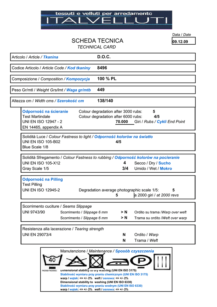 Data / Date SCHEDA TECNICA 09.12.09 TECHNICAL CARD Articolo / Article / Tkanina D.O.C. Codice Articolo / Article Code / Kod tkaniny 8496 Composizione / Composition / Kompozycja 100 % PL Peso Gr/mtl / Weight Grs/lmt / Waga gr/mtb 449 Altezza cm / Width cms / Szerokość cm 138/140 Odporność na ścieranie Test Martindale UNI EN ISO 12947 - 2 EN 14465, appendix A Colour degradation after 3000 rubs: 5 Colour degradation after 6000 rubs: 4/5 70.000 Giri / Rubs / Cykli End Point Solidità Luce / Colour Fastness to light / Odporność kolorów na światło UNI EN ISO 105-B02 4/5 Blue Scale 1/8 Solidità Sfregamento / Colour Fastness to rubbing / Odporność kolorów na pocieranie 4 UNI EN ISO 105-X12 Secco / Dry / Sucho 3/4 Umido / Wet / Mokro Gray Scale 1/5 Odporność na Pilling Test Pilling UNI EN ISO 12945-2 Degradation average photographic scale 1/5: 5 5 a 2000 giri / at 2000 revs Scorrimento cuciture / Seams Slippage UNI 9743/90 Scorrimento / Slippage 6 mm Scorrimento / Slippage 6 mm Resistenza alla lacerazione / Tearing strength UNI EN 29073/4 >N >N N N Ordito su trama /Warp over weft Trama su ordito /Weft over warp Ordito / Warp Trama / Weft Manutenzione / Maintenance / Sposób czyszczenia Note/Notes: Dimensional stability to dry washing (UNI EN ISO 3175) Stabilność wymiaru przy praniu chemicznym (UNI EN ISO 3175) warp / wątek: <= +/- 2% weft / osnowa: <= +/- 2% Dimensional stability to washing (UNI EN ISO 6330) Stabilność wymiaru przy praniu wodnym (UNI EN ISO 6330) warp / wątek: <= +/- 2% weft / osnowa: <= +/- 2% Data / Date SCHEDA TECNICA 09.12.09 TECHNICAL CARD Articolo / Article / Tkanina BARCODE SMALL Codice Articolo / Article Code / Kod tkaniny 8539 Composizione / Composition / Kompozycja 84% PL 16% CO Peso Gr/mtl / Weight Grs/lmt / Waga gr/mtb 657 Altezza cm / Width cms / Szerokość cm 138/140 Odporność na ścieranie Test Martindale UNI EN ISO 12947 - 2 EN 14465, appendix A Colour degradation after 3000 rubs: 4/5 Colour degradation after 6000 rubs: 4 70.000 Giri / Rubs / Cykli End Point Solidità Luce / Colour Fastness to light / Odporność kolorów na światło UNI EN ISO 105-B02 4/5 Blue Scale 1/8 Solidità Sfregamento / Colour Fastness to rubbing / Odporność kolorów na pocieranie 4 UNI EN ISO 105-X12 Secco / Dry / Sucho 3/4 Umido / Wet / Mokro Gray Scale 1/5 Odporność na Pilling Test Pilling UNI EN ISO 12945-2 Degradation average photographic scale 1/5: 4 4 a 2000 giri / at 2000 revs Scorrimento cuciture / Seams Slippage UNI 9743/90 Scorrimento / Slippage 6 mm Scorrimento / Slippage 6 mm Resistenza alla lacerazione / Tearing strength UNI EN 29073/4 >N >N N N Ordito su trama /Warp over weft Trama su ordito /Weft over warp Ordito / Warp Trama / Weft Manutenzione / Maintenance / Sposób czyszczenia Note/Notes: Dimensional stability to dry washing (UNI EN ISO 3175) Stabilność wymiaru przy praniu chemicznym (UNI EN ISO 3175) warp / wątek: <= +/- 2% weft / osnowa: <= +/- 2%