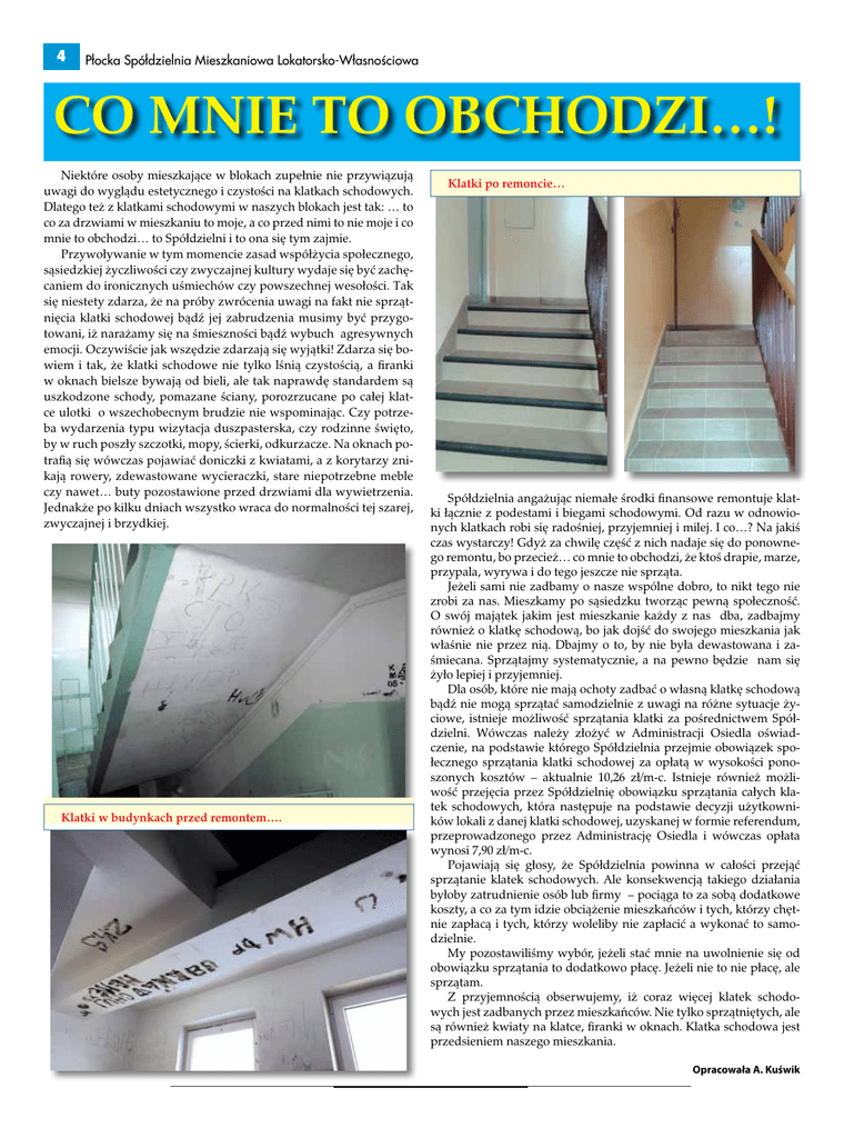 4 Płocka Spółdzielnia Mieszkaniowa Lokatorsko-Własnościowa CO MNIE TO OBCHODZI…! Niektóre osoby mieszkające w blokach zupełnie nie przywiązują uwagi do wyglądu estetycznego i czystości na klatkach schodowych. Dlatego też z klatkami schodowymi w naszych blokach jest tak: … to co za drzwiami w mieszkaniu to moje, a co przed nimi to nie moje i co mnie to obchodzi… to Spółdzielni i to ona się tym zajmie. Przywoływanie w tym momencie zasad współżycia społecznego, sąsiedzkiej życzliwości czy zwyczajnej kultury wydaje się być zachęcaniem do ironicznych uśmiechów czy powszechnej wesołości. Tak się niestety zdarza, że na próby zwrócenia uwagi na fakt nie sprzątnięcia klatki schodowej bądź jej zabrudzenia musimy być przygotowani, iż narażamy się na śmieszności bądź wybuch agresywnych emocji. Oczywiście jak wszędzie zdarzają się wyjątki! Zdarza się bowiem i tak, że klatki schodowe nie tylko lśnią czystością, a firanki w oknach bielsze bywają od bieli, ale tak naprawdę standardem są uszkodzone schody, pomazane ściany, porozrzucane po całej klatce ulotki o wszechobecnym brudzie nie wspominając. Czy potrzeba wydarzenia typu wizytacja duszpasterska, czy rodzinne święto, by w ruch poszły szczotki, mopy, ścierki, odkurzacze. Na oknach potrafią się wówczas pojawiać doniczki z kwiatami, a z korytarzy znikają rowery, zdewastowane wycieraczki, stare niepotrzebne meble czy nawet… buty pozostawione przed drzwiami dla wywietrzenia. Jednakże po kilku dniach wszystko wraca do normalności tej szarej, zwyczajnej i brzydkiej. Klatki w budynkach przed remontem…. Klatki po remoncie… Spółdzielnia angażując niemałe środki finansowe remontuje klatki łącznie z podestami i biegami schodowymi. Od razu w odnowionych klatkach robi się radośniej, przyjemniej i milej. I co…? Na jakiś czas wystarczy! Gdyż za chwilę część z nich nadaje się do ponownego remontu, bo przecież… co mnie to obchodzi, że ktoś drapie, marze, przypala, wyrywa i do tego jeszcze nie sprząta. Jeżeli sami nie zadbamy o nasze wspólne dobro, to nikt tego nie zrobi za nas. Mieszkamy po sąsiedzku tworząc pewną społeczność. O swój majątek jakim jest mieszkanie każdy z nas dba, zadbajmy również o klatkę schodową, bo jak dojść do swojego mieszkania jak właśnie nie przez nią. Dbajmy o to, by nie była dewastowana i zaśmiecana. Sprzątajmy systematycznie, a na pewno będzie nam się żyło lepiej i przyjemniej. Dla osób, które nie mają ochoty zadbać o własną klatkę schodową bądź nie mogą sprzątać samodzielnie z uwagi na różne sytuacje życiowe, istnieje możliwość sprzątania klatki za pośrednictwem Spółdzielni. Wówczas należy złożyć w Administracji Osiedla oświadczenie, na podstawie którego Spółdzielnia przejmie obowiązek społecznego sprzątania klatki schodowej za opłatą w wysokości ponoszonych kosztów – aktualnie 10,26 zł/m-c. Istnieje również możliwość przejęcia przez Spółdzielnię obowiązku sprzątania całych klatek schodowych, która następuje na podstawie decyzji użytkowników lokali z danej klatki schodowej, uzyskanej w formie referendum, przeprowadzonego przez Administrację Osiedla i wówczas opłata wynosi 7,90 zł/m-c. Pojawiają się głosy, że Spółdzielnia powinna w całości przejąć sprzątanie klatek schodowych. Ale konsekwencją takiego działania byłoby zatrudnienie osób lub firmy – pociąga to za sobą dodatkowe koszty, a co za tym idzie obciążenie mieszkańców i tych, którzy chętnie zapłacą i tych, którzy woleliby nie zapłacić a wykonać to samodzielnie. My pozostawiliśmy wybór, jeżeli stać mnie na uwolnienie się od obowiązku sprzątania to dodatkowo płacę. Jeżeli nie to nie płacę, ale sprzątam. Z przyjemnością obserwujemy, iż coraz więcej klatek schodowych jest zadbanych przez mieszkańców. Nie tylko sprzątniętych, ale są również kwiaty na klatce, firanki w oknach. Klatka schodowa jest przedsieniem naszego mieszkania. Opracowała A. Kuświk