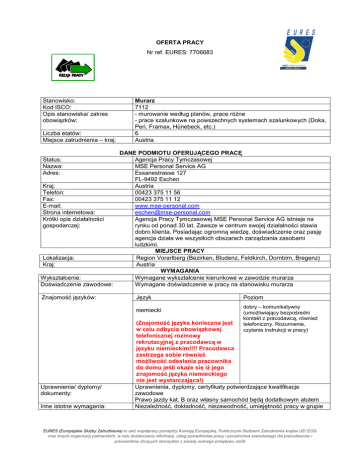 OFERTA PRACY Nr ref. EURES: 7706683 Stanowisko: Kod ISCO: Opis stanowiska/ zakres obowiązków: Liczba etatów: Miejsce zatrudnienia – kraj: Status: Nazwa: Adres: Kraj: Telefon: Fax: E-mail: Strona internetowa: Krótki opis działalności gospodarczej: Lokalizacja: Kraj: Wykształcenie: Doświadczenie zawodowe: Znajomość języków: Murarz 7112 - murowanie według planów, prace różne - prace szalunkowe na powszechnych systemach szalunkowych (Doka, Peri, Framax, Hünebeck, etc.) 6 Austria DANE PODMIOTU OFERUJĄCEGO PRACĘ Agencja Pracy Tymczasowej MSE Personal Service AG Essanestrasse 127 FL-9492 Eschen Austria 00423 375 11 56 00423 375 11 12 www.mse-personal.com [email protected] Agencja Pracy Tymczasowej MSE Personal Service AG istnieje na rynku od ponad 30 lat. Zawsze w centrum swojej działalności stawia dobro klienta. Posiadając ogromną wiedzę, doświadczenie oraz pasję agencja działa we wszystkich obszarach zarządzania zasobami ludzkimi. MIEJSCE PRACY Region Vorarlberg (Bezirken, Bludenz, Feldkirch, Dornbirn, Bregenz) Austria WYMAGANIA Wymagane wykształcenie kierunkowe w zawodzie murarza Wymagane doświadczenie w pracy na stanowisku murarza Język niemiecki Uprawnienia/ dyplomy/ dokumenty: Inne istotne wymagania: Poziom dobry – komunikatywny (umożliwiający bezpośredni kontakt z pracodawcą, również telefoniczny. Rozumienie, czytanie instrukcji w pracy) (Znajomość języka konieczna jest w celu odbycia obowiązkowej telefonicznej rozmowy rekrutacyjnej z pracodawcą w języku niemieckim!!!! Pracodawca zastrzega sobie również możliwość odesłania pracownika do domu jeśli okaże się iż jego znajomość języka niemieckiego nie jest wystarczająca!) Uprawnienia, dyplomy, certyfikaty potwierdzające kwalifikacje zawodowe Prawo jazdy kat. B oraz własny samochód będą dodatkowym atutem Niezależność, dokładność, niezawodność, umiejętność pracy w grupie EURES (Europejskie Służby Zatrudnienia) to sieć współpracy pomiędzy Komisją Europejską, Publicznymi Służbami Zatrudnienia krajów UE/ EOG oraz innych organizacji partnerskich, w celu dostarczania informacji, usług pośrednictwa pracy i poradnictwa zawodowego dla pracodawców i pracowników chcących skorzystać z zasady wolnego przepływu osób WYNAGRODZENIE I WARUNKI ZATRUDNIENIA Wysokość pensji brutto: 13,45 Waluta, w jakiej wypłacana jest Euro pensja: Rodzaj stawki wynagrodzenia: Godzinowa Premie: - 25 dni urlopu - dodatkowe pieniądze w czasie urlopu i w czasie świątecznym Dodatkowe świadczenia: - pełne ubezpieczenie (na wypadek bezrobocia, zdrowotne, od następstw nieszczęśliwych wypadków, emerytalne) - zakwaterowanie jest zapewnione ze strony pracodawcy ale opłacane przez pracownika ok. 300 euro – 350 euro - usługi podatkowe (korekty roczne) - pomoc w załatwianiu wszelkich spraw urzędowych - zakup odzieży ochronnej - dla pracowników karta MSE z wieloma rabatami i ulgami podczas organizacji czasu wolnego od pracy - najlepsze kontakty biznesowe poprzez inne organizacje partnerskie Nazwa firmy, z którą zostanie podpisana umowa: MSE Personal Service AG Rodzaj umowy: Umowa o pracę Wymiar czasu pracy: Pełny wymiar czasu pracy Czas trwania umowy: Umowa na czas nieokreślony Liczba godzin tygodniowo: 40 Zmiany i praca w dni wolne: Tak SPOSÓB SKŁADANIA WNIOSKU CV, List motywacyjny, kserokopie świadectw pracy, certyfikatów, dyplomów, Wymagane dokumenty: referencji ( jeśli są) Język, w którym muszą być sporządzone przedkładane dokumenty: Do kogo należy wysłać dokumenty: Gdzie należy wysłać dokumenty: Niemiecki Do Dolnośląskiego Wojewódzkiego Urzędu Pracy – do doradcy Eures Pani Anny Uznańskiej Pocztą tradycyjną na adres: Anna Uznańska Dolnośląski Wojewódzki Urząd Pracy Filia we Wrocławiu al. Armii Krajowej 54 50-541 Wrocław Pocztą elektroniczną na adres: [email protected] Dane teleadresowe doradcy EURES lub przedstawiciela pracodawcy: z dopiskiem: ‘Austria – murarz’ Anna Uznańska Dolnośląski Wojewódzki Urząd Pracy Filia we Wrocławiu al. Armii Krajowej 54 50-541 Wrocław Tel. 71 39 74 310 e-mail: [email protected] DODATKOWE INFORMACJE UWAGA!!! Informujemy, że pracodawca kontaktuje się z wybranymi kandydatami drogą telefoniczną w języku niemieckim. WAŻNOŚĆ Data publikacji: 24.02.2016 r. Termin przedkładania podań o pracę / zakończenia ważności oferty: Do odwołania 1) Agencja pracy tymczasowej MSE Personal Service AG oświadczyła, że prowadzi działalność zgodnie z przepisami obowiązującymi w Austrii. EURES (Europejskie Służby Zatrudnienia) to sieć współpracy pomiędzy Komisją Europejską, Publicznymi Służbami Zatrudnienia krajów UE/ EOG oraz innych organizacji partnerskich, w celu dostarczania informacji, usług pośrednictwa pracy i poradnictwa zawodowego dla pracodawców i pracowników chcących skorzystać z zasady wolnego przepływu osób 2) Publiczne służby zatrudnienia w Austrii nie posiadają uprawnień do potwierdzenia legalności działania Agencji pracy tymczasowej MSE Personal Service AG. UWAGA: 1. Umowa z zagranicznym pracodawcą zostanie zawarta zgodnie z prawem kraju zatrudnienia. Oznacza to, że wszystkie roszczenia odnośnie do warunków, które obejmuje umowa, można kierować wyłącznie do odpowiedniego sądu w kraju zatrudnienia. Publiczne służby zatrudnienia (EURES) nie mogą pośredniczyć ani reprezentować pracownika w sądzie kraju zatrudnienia w przypadku sporu z pracodawcą. 2. Publiczne służby zatrudnienia (EURES) dokładają wszelkich starań, aby zapewnić rzetelność i wiarygodność ofert pracy zgłoszonych w lokalnym urzędzie pracy. Należy wyjaśnić, że oferta pracy została zgłoszona przez stronę trzecią i EURES nie odpowiada za ewentualne rozbieżności między warunkami pracy określonymi w ofercie pracy i warunkami oferowanymi przez potencjalnego pracodawcę. 3. Publiczne służby zatrudnienia (EURES) informują, że będą zbierać, przetwarzać 