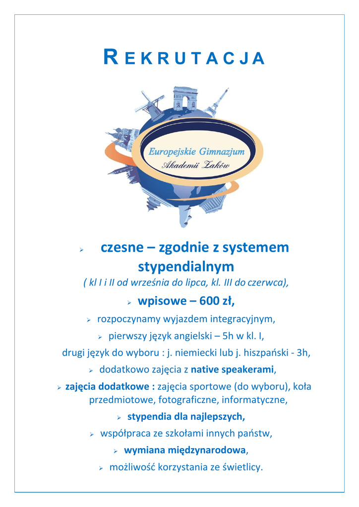 R E K R U T A C JA czesne – zgodnie z systemem stypendialnym ( kl I i II od września do lipca, kl. III do czerwca), wpisowe – 600 zł, rozpoczynamy wyjazdem integracyjnym, pierwszy język angielski – 5h w kl. I, drugi język do wyboru : j. niemiecki lub j. hiszpański - 3h, dodatkowo zajęcia z native speakerami, zajęcia dodatkowe : zajęcia sportowe (do wyboru), koła przedmiotowe, fotograficzne, informatyczne, stypendia dla najlepszych, współpraca ze szkołami innych państw, wymiana międzynarodowa, możliwość korzystania ze świetlicy.