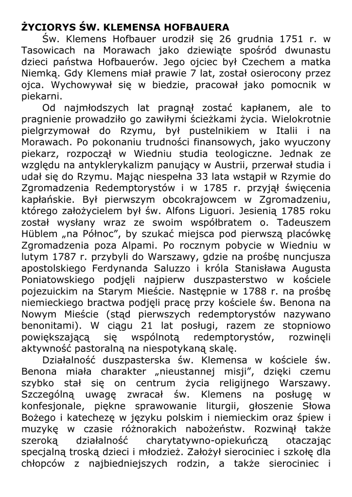 ŻYCIORYS ŚW. KLEMENSA HOFBAUERA Św. Klemens Hofbauer urodził się 26 grudnia 1751 r. w Tasowicach na Morawach jako dziewiąte spośród dwunastu dzieci państwa Hofbauerów. Jego ojciec był Czechem a matka Niemką. Gdy Klemens miał prawie 7 lat, został osierocony przez ojca. Wychowywał się w biedzie, pracował jako pomocnik w piekarni. Od najmłodszych lat pragnął zostać kapłanem, ale to pragnienie prowadziło go zawiłymi ścieżkami życia. Wielokrotnie pielgrzymował do Rzymu, był pustelnikiem w Italii i na Morawach. Po pokonaniu trudności finansowych, jako wyuczony piekarz, rozpoczął w Wiedniu studia teologiczne. Jednak ze względu na antyklerykalizm panujący w Austrii, przerwał studia i udał się do Rzymu. Mając niespełna 33 lata wstąpił w Rzymie do Zgromadzenia Redemptorystów i w 1785 r. przyjął święcenia kapłańskie. Był pierwszym obcokrajowcem w Zgromadzeniu, którego założycielem był św. Alfons Liguori. Jesienią 1785 roku został wysłany wraz ze swoim współbratem o. Tadeuszem Hüblem „na Północ”, by szukać miejsca pod pierwszą placówkę Zgromadzenia poza Alpami. Po rocznym pobycie w Wiedniu w lutym 1787 r. przybyli do Warszawy, gdzie na prośbę nuncjusza apostolskiego Ferdynanda Saluzzo i króla Stanisława Augusta Poniatowskiego podjęli najpierw duszpasterstwo w kościele pojezuickim na Starym Mieście. Następnie w 1788 r. na prośbę niemieckiego bractwa podjęli pracę przy kościele św. Benona na Nowym Mieście (stąd pierwszych redemptorystów nazywano benonitami). W ciągu 21 lat posługi, razem ze stopniowo powiększającą się wspólnotą redemptorystów, rozwinęli aktywność pastoralną na niespotykaną skalę. Działalność duszpasterska św. Klemensa w kościele św. Benona miała charakter „nieustannej misji”, dzięki czemu szybko stał się on centrum życia religijnego Warszawy. Szczególną uwagę zwracał św. Klemens na posługę w konfesjonale, piękne sprawowanie liturgii, głoszenie Słowa Bożego i katechezę w języku polskim i niemieckim oraz śpiew i muzykę w czasie różnorakich nabożeństw. Rozwinął także szeroką działalność charytatywno-opiekuńczą otaczając specjalną troską dzieci i młodzież. Założył sierociniec i szkołę dla chłopców z najbiedniejszych rodzin, a także sierociniec i pierwszą w dziejach polskiej edukacji bezpłatną szkołę zawodową dla dziewcząt. Otaczał opieką duszpasterską prostytutki, chorych i umierających; prowadził apostolat wśród innych grup wyznaniowych, spowiadał i głosił rekolekcje w klasztorach żeńskich. Zorganizował bibliotekę i drukarnię, w której wydawano podręczniki szkolne, książki religijne, katechizmy oraz polskie tłumaczenia dzieł założyciela redemptorystów św. Alfonsa Liguori. Doceniając rolę świeckich w Kościele, założył Stowarzyszenie Oblatów Najświętszego Odkupiciela, skupiające elitę katolików świeckich, prowadzących pogłębione życie religijne i sakramentalne oraz apostolat w swoich środowiskach. Dla kandydatów do Zgromadzenia Klemens otworzył własny nowicjat i seminarium zakonne. Jednak wychowywanie dzieci i młodzieży w duchu chrześcijańskim, duszpasterstwo ogarniające liczne rzesze wiernych oraz działalność świeckich oblatów napotykały na zdecydowany opór wrogów Kościoła. W czerwcu 1808 roku z rozkazu Napoleona został podpisany dekret o wypędzeniu Klemensa z Warszawy i zamknięciu kościoła św. Benona. Klemens wraz z 40 redemptorystami został aresztowany i wywieziony do twierdzy w Kostrzyniu nad Odrą. W więzieniu spędzili cztery tygodnie, po czym zwolniono ich i nakazano udać się do własnych krajów, jednak bez prawa powrotu do Księstwa Warszawskiego. We wrześniu 1808 roku Klemens przybył do Wiednia. W następnym roku, kiedy to wojska napoleońskie atakowały Wiedeń, jako kapelan szpitala opiekował się rannymi żołnierzami. Arcybiskup Wiednia zauważył gorliwość Klemensa i polecił mu, aby zajął się małym, włoskim kościołem w Wiedniu, przy którym pracowali wcześniej franciszkanie. Klemens pracował tam 4 lata a następnie, w 1813 roku, został kapelanem i spowiednikiem Sióstr Urszulanek. Przy kościele św. Urszuli jako jego rektor rozwinął wspaniałą działalność duszpasterską i charytatywną wśród różnych grup społecznych, zwracając szczególną uwagę na studentów i profesorów oraz ludzi ubogich i opuszczonych. Szczególnie duży wpływ wywierał przez piękną liturgię, kazania, posługę w konfesjonale oraz indywidualne rozmowy. Był jednym z inspiratorów odrodzenia życia religijnego w Austrii. Jego dewizą stało się powiedzenie: „Ewangelia winna być głoszona w nowy sposób”. Dzięki osobistym znajomościom wśród uczestników Kongresu Wiedeńskiego, udało mu się zniweczyć plan utworzenia w krajach niemieckich Kościoła narodowego. Klemens Hofbauer zmarł w Wiedniu 15 marca 1820 r. jako ceniony kaznodzieja i spowiednik, opiekun bractw religijnych i apostoł ubogich. Został beatyfikowany w 1888 roku przez papieża Leona XIII, a w 1909 roku papież Pius X ogłosił go świętym Kościoła katolickiego. W 1913 został ogłoszony drugim patronem piekarzy, zaś w 1914 papież przyznał mu tytuł drugiego patrona Wiednia. Nazywany jest też apostołem Warszawy. Jego wspomnienie liturgiczne przypada 15 marca. Za życia św. Klemensa nie udała mu się żadna nowa fundacja. Dopiero po jego śmierci zaczęły powstawać nowe klasztory redemptorystów w Europie, a od 1832 r. w Stanach Zjednoczonych i później stopniowo na innych kontynentach. Do Polski redemptoryści wrócili w 1883 r. za sprawą sługi Bożego ojca Bernarda Łubieńskiego, wielkiego czciciela i propagatora kultu Matki Bożej Nieustającej Pomocy powierzonego redemptorystom w 1866 r. przez błogosławionego papieża Piusa IX. „Jego życie opierało się na miłości Boga, Kościoła świętego i pragnieniu zaprowadzenia dusz do Boga” Ś