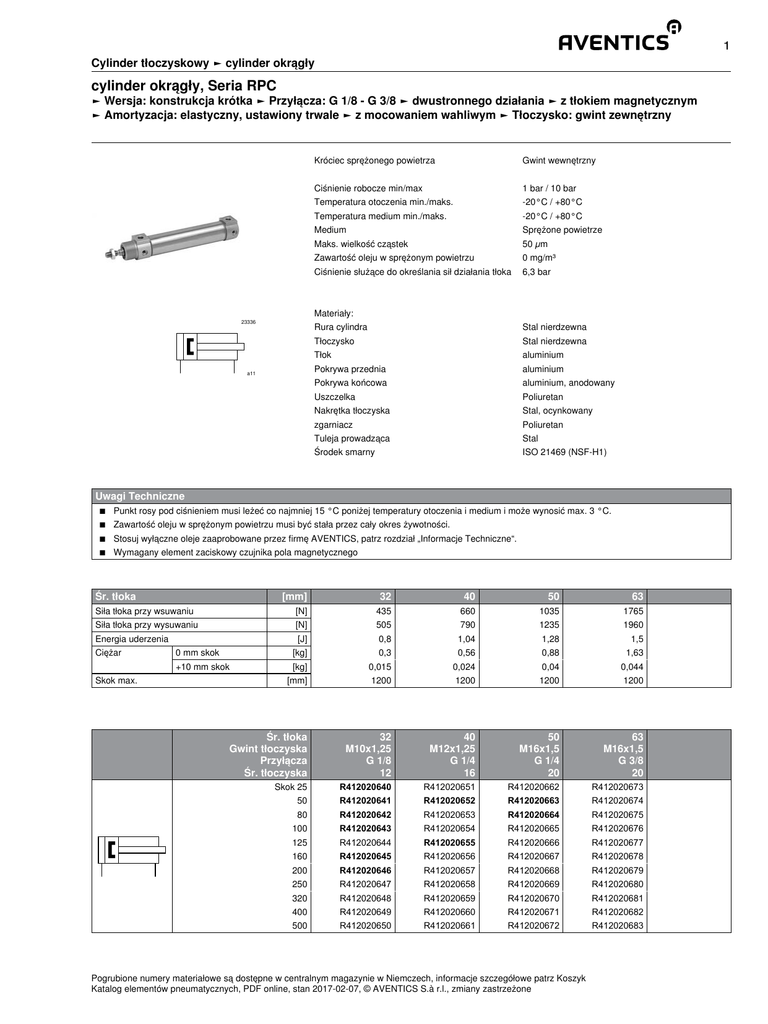 1 Cylinder tłoczyskowy ► cylinder okrągły cylinder okrągły, Seria RPC ► Wersja: konstrukcja krótka ► Przyłącza: G 1/8 - G 3/8 ► dwustronnego działania ► z tłokiem magnetycznym ► Amortyzacja: elastyczny, ustawiony trwale ► z mocowaniem wahliwym ► Tłoczysko: gwint zewnętrzny Króciec sprężonego powietrza Gwint wewnętrzny Ciśnienie robocze min/max 1 bar / 10 bar Temperatura otoczenia min./maks. -20°C / +80°C Temperatura medium min./maks. -20°C / +80°C Medium Sprężone powietrze Maks. wielkość cząstek 50 µm Zawartość oleju w sprężonym powietrzu 0 mg/m³ Ciśnienie służące do określania sił działania tłoka 6,3 bar Materiały: 23336 a11 Rura cylindra Stal nierdzewna Tłoczysko Stal nierdzewna Tłok aluminium Pokrywa przednia aluminium Pokrywa końcowa aluminium, anodowany Uszczelka Poliuretan Nakrętka tłoczyska Stal, ocynkowany zgarniacz Poliuretan Tuleja prowadząca Stal Środek smarny ISO 21469 (NSF-H1) Uwagi Techniczne ■ Punkt rosy pod ciśnieniem musi leżeć co najmniej 15 °C poniżej temperatury otoczenia i medium i może wynosić max. 3 °C. ■ Zawartość oleju w sprężonym powietrzu musi być stała przez cały okres żywotności. ■ Stosuj wyłączne oleje zaaprobowane przez firmę AVENTICS, patrz rozdział „Informacje Techniczne“. ■ Wymagany element zaciskowy czujnika pola magnetycznego Śr. tłoka [mm] Siła tłoka przy wsuwaniu 32 [N] 435 Siła tłoka przy wysuwaniu [N] Energia uderzenia [J] Ciężar 0 mm skok +10 mm skok Skok max. 40 50 63 660 1035 1765 505 790 1235 1960 0,8 1,04 1,28 1,5 [kg] 0,3 0,56 0,88 1,63 [kg] 0,015 0,024 0,04 0,044 [mm] 1200 1200 1200 1200 Śr. tłoka Gwint tłoczyska Przyłącza Śr. tłoczyska Skok 25 32 M10x1,25 G 1/8 12 40 M12x1,25 G 1/4 16 50 M16x1,5 G 1/4 20 63 M16x1,5 G 3/8 20 R412020640 R412020651 R412020662 R412020673 50 R412020641 R412020652 R412020663 R412020674 80 R412020642 R412020653 R412020664 R412020675 100 R412020643 R412020654 R412020665 R412020676 125 R412020644 R412020655 R412020666 R412020677 160 R412020645 R412020656 R412020667 R412020678 200 R412020646 R412020657 R412020668 R412020679 250 R412020647 R412020658 R412020669 R412020680 320 R412020648 R412020659 R412020670 R412020681 400 R412020649 R412020660 R412020671 R412020682 500 R412020650 R412020661 R412020672 R412020683 Pogrubione numery materiałowe są dostępne w centralnym magazynie w Niemczech, informacje szczegółowe patrz Koszyk Katalog elementów pneumatycznych, PDF online, stan 2017-02-07, © AVENTICS S.à r.l., zmiany zastrzeżone 2 Cylinder tłoczyskowy ► cylinder okrągły cylinder okrągły, Seria RPC ► Wersja: konstrukcja krótka ► Przyłącza: G 1/8 - G 3/8 ► dwustronnego działania ► z tłokiem magnetycznym ► Amortyzacja: elastyczny, ustawiony trwale ► z mocowaniem wahliwym ► Tłoczysko: gwint zewnętrzny Konfigurowalny produkt Ten produkt można konfigurować. Należy użyć naszego konfiguratora internetowego lub skontaktować się z najbliższym centrum dystrybucyjnym AVENTICS. Rozmiary ZN + S SW 2 Ø D1 Y2 + S KY E KK ØD2 MR BF KX M2* WF A M1* Y1 EE M BE MM ØH PB + S O EE M1 M2 22818 S=skok Śr. tłoka 32 22 A M30x1,5 BE BF Ø D1 Ø D2 33,5 37 G 1/8 EE ØH 10 M10x1,25* KK KX KY 40 24 M38x1.5 23 45 41,5 45 G 1/4 12 M12x1,25* 19 6 M6x0,5 50 32 M45x1,5 24 55 52,5 55 G 1/4 14 M16x1,5 24 8 M8x0,75 63 32 M45x1,5 26,5 69 64,5 69 G 3/8 16 M16x1,5 24 8 M8x0,75 20 36 E Śr. tłoka Ø MM f8 M1 M1* M2 M2* 10,5 22,5 4,5 40 16 11,5 12 11,5 12,5 25,5 50 20 11,5 10 11,5 12,5 31 63 20 13,5 16 13,5 11,5 37,5 32 12 11 10,5 11 MR O 16 PB SW2 4,5 76 13 7,5 75,5 17 7,5 79 17 36,5 58,5 10 WF 27 M 5 Y1 M6x0,5 Y2 ZN 37,5 99,5 110 32 43 120 132,5 33,5 43,5 122 134,5 52,5 134 145,5 * Należy użyć naszego konfiguratora internetowego, aby zamówić te warianty z gwintem zwykłym M10x1,5 lub M12x1,75. Pogrubione numery materiałowe są dostępne w centralnym magazynie w Niemczech, informacje szczegółowe patrz Koszyk Katalog elementów pneumatycznych, PDF online, stan 2017-02-07, © AVENTICS S.à r.l., zmiany zastrzeżone