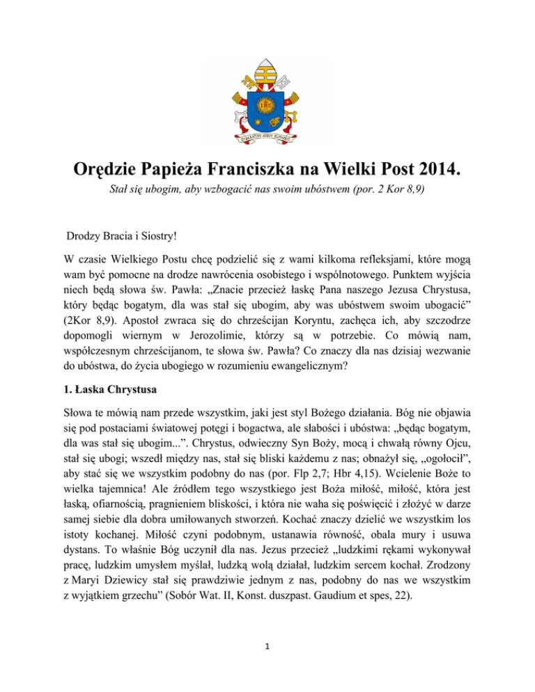 Orędzie Papieża Franciszka na Wielki Post 2014. Stał się ubogim, aby wzbogacić nas swoim ubóstwem (por. 2 Kor 8,9) Drodzy Bracia i Siostry! W czasie Wielkiego Postu chcę podzielić się z wami kilkoma refleksjami, które mogą wam być pomocne na drodze nawrócenia osobistego i wspólnotowego. Punktem wyjścia niech będą słowa św. Pawła: „Znacie przecież łaskę Pana naszego Jezusa Chrystusa, który będąc bogatym, dla was stał się ubogim, aby was ubóstwem swoim ubogacić” (2Kor 8,9). Apostoł zwraca się do chrześcijan Koryntu, zachęca ich, aby szczodrze dopomogli wiernym w Jerozolimie, którzy są w potrzebie. Co mówią nam, współczesnym chrześcijanom, te słowa św. Pawła? Co znaczy dla nas dzisiaj wezwanie do ubóstwa, do życia ubogiego w rozumieniu ewangelicznym? 1. Łaska Chrystusa Słowa te mówią nam przede wszystkim, jaki jest styl Bożego działania. Bóg nie objawia się pod postaciami światowej potęgi i bogactwa, ale słabości i ubóstwa: „będąc bogatym, dla was stał się ubogim...”. Chrystus, odwieczny Syn Boży, mocą i chwałą równy Ojcu, stał się ubogi; wszedł między nas, stał się bliski każdemu z nas; obnażył się, „ogołocił”, aby stać się we wszystkim podobny do nas (por. Flp 2,7; Hbr 4,15). Wcielenie Boże to wielka tajemnica! Ale źródłem tego wszystkiego jest Boża miłość, miłość, która jest łaską, ofiarnością, pragnieniem bliskości, i która nie waha się poświęcić i złożyć w darze samej siebie dla dobra umiłowanych stworzeń. Kochać znaczy dzielić we wszystkim los istoty kochanej. Miłość czyni podobnym, ustanawia równość, obala mury i usuwa dystans. To właśnie Bóg uczynił dla nas. Jezus przecież „ludzkimi rękami wykonywał pracę, ludzkim umysłem myślał, ludzką wolą działał, ludzkim sercem kochał. Zrodzony z Maryi Dziewicy stał się prawdziwie jednym z nas, podobny do nas we wszystkim z wyjątkiem grzechu” (Sobór Wat. II, Konst. duszpast. Gaudium et spes, 22). 1 Jezus stał się ubogi nie dla ubóstwa samego w sobie, ale – jak pisze św. Paweł – po to, „aby was ubóstwem swoim ubogacić”. To nie jest gra słów czy tylko efektowna figura retoryczna! Przeciwnie, to synteza Bożej logiki, logiki miłości, logiki Wcielenia i Krzyża. Bóg nie chciał, by zbawienie spadło na nas z wysoka, niczym jałmużna udzielona przez litościwego filantropa, który dzieli się czymś, co mu zbywa. Nie taka jest miłość Chrystusa! Kiedy Jezus zanurza się w wodach Jordanu i przyjmuje chrzest z rąk Jana Chrzciciela, nie dlatego to czyni, że potrzebuje pokuty czy nawrócenia; czyni to, aby stanąć pośród ludzi potrzebujących przebaczenia, pośród nas grzeszników, i wziąć na swoje barki brzemię naszych grzechów. Taką wybrał drogę, aby nas pocieszyć, zbawić, uwolnić od naszej nędzy. Zastanawiają nas słowa Apostoła, że zostaliśmy wyzwoleni nie przez bogactwo Chrystusa, ale przez Jego ubóstwo. A przecież św. Paweł dobrze zna „niezgłębione bogactwo Chrystusa” (Ef 3,8), „dziedzica wszystkich rzeczy” (por. Hbr 1,2). Czym zatem jest ubóstwo, którym Jezus nas wyzwala i ubogaca? Jest nim właśnie sposób, w jaki Jezus nas kocha, w jaki staje się naszym bliźnim, niczym Dobry Samarytanin, który pochyla się nad półżywym człowiekiem, porzuconym na skraju drogi (por. Łk 10,25 nn). Tym, co daje nam prawdziwą wolność, prawdziwe zbawienie i prawdziwe szczęście, jest Jego miłość współczująca, tkliwa i współuczestnicząca. Chrystus ubogaca nas swoim ubóstwem przez to, że staje się ciałem, bierze na siebie nasze słabości, nasze grzechy, udzielając nam nieskończonego miłosierdzia Bożego. Ubóstwo Chrystusa jest Jego największym bogactwem: Jezus jest bogaty swoim bezgranicznym zaufaniem do Boga Ojca, swoim bezustannym zawierzeniem Ojcu, bo zawsze szuka tylko Jego woli i Jego chwały. Jest bogaty niczym dziecko, które czuje się kochane, samo kocha swoich rodziców i ani na chwilę nie wątpi w ich miłość i czułość. Bogactwo Jezusa polega na tym, że jest Synem. Jedyna w swoim rodzaju więź z Ojcem to najwyższy przywilej tego ubogiego Mesjasza. Jezus wzywa nas, byśmy wzięli na siebie Jego „słodkie jarzmo”, to znaczy byśmy wzbogacili się Jego „bogatym ubóstwem” albo „ubogim bogactwem”, byśmy wraz z Nim mieli udział w Jego Duchu synowskim i braterskim, stali się synami w Synu, braćmi w pierworodnym Bracie (por. Rz 8,29). Znane jest powiedzenie, że jedyny prawdziwy smutek to nie być świętym (L. Bloy); moglibyśmy też powiedzieć, że istnieje jedna tylko prawdziwa nędza: nie żyć jak synowie Boga i bracia Chrystusa. 2. Nasze świadectwo Moglibyśmy pomyśleć, że taka „droga” ubóstwa była odpowiednia dla Jezusa, my natomiast, którzy przychodzimy po Nim, możemy zbawić świat odpowiednimi środkami 2 ludzkimi. Tak nie jest. W każdym czasie i miejscu Bóg nadal zbawia ludzi i świat poprzez ubóstwo Chrystusa, bo On staje się ubogi w sakramentach, w Słowie i w swoim Kościele, który jest ludem ubogich. Bogactwo Boga nie może się udzielać poprzez nasze bogactwo, ale zawsze i wyłącznie poprzez nasze ubóstwo, osobiste i wspólnotowe, czerpiące moc z Ducha Chrystusa. Na wzór naszego Nauczyciela jesteśmy jako chrześcijanie powołani do tego, aby dostrzegać różne rodzaje nędzy trapiącej naszych braci, dotykać ich dłonią, brać je na swoje barki i starać się je łagodzić przez konkretne działania. Nędza to nie to samo co ubóstwo; nędza to ubóstwo bez wiary w przyszłość, bez solidarności, bez nadziei. Możemy wyróżnić trzy typy nędzy. Są to: nędza materialna, nędza moralna i nędza duchowa. Nędza materialna to ta, którą potocznie nazywa się biedą, i która dotyka osoby żyjące w warunkach niegodnych ludzkich istot, pozbawione podstawowych praw i dóbr pierwszej potrzeby, takich jak żywność, woda, higiena, praca, szanse na rozwój i p