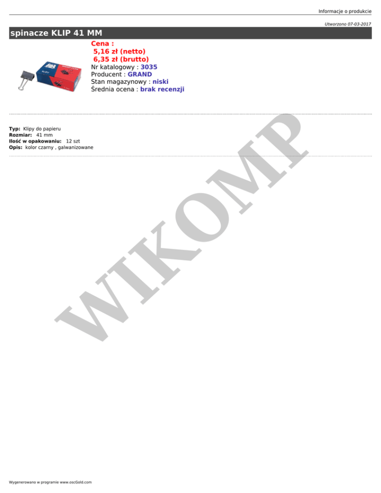Informacje o produkcie Utworzono 07-03-2017 spinacze KLIP 41 MM Cena : 5,16 zł (netto) 6,35 zł (brutto) Nr katalogowy : 3035 Producent : GRAND Stan magazynowy : niski Średnia ocena : brak recenzji W IK O M P Typ: Klipy do papieru Rozmiar: 41 mm Ilość w opakowaniu: 12 szt Opis: kolor czarny , galwanizowane Wygenerowano w programie www.oscGold.com