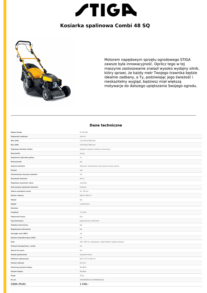 Kosiarka spalinowa Combi 48 SQ Motorem napędowym sprzętu ogrodowego STIGA zawsze była innowacyjność. Oprócz tego w tej maszynie zastosowanie znalazł wysoko wydajny silnik, który sprawi, że każdy metr Twojego trawnika będzie idealnie zadbany, a Ty, podziwiając jego świeżość i nieskazitelny wygląd, będziesz miał większą motywacje do dalszego upiększania Swojego ogrodu. Dane techniczne Powered by TCPDF (www.tcpdf.org) Model silnika ST 45 OHV Pojemność skokowa 140 cm³ Moc (kW) 2,22 kW @ 2900 rpm Moc (KM) 3,02 KM @ 2900 rpm Regulacja obrotów silnika dźwignia regulacji obrotów na kierownicy Rozrusznik ręczny Pojemność zbiornika paliwa 1L Mulczowanie tak System koszenia zbieranie, mulczowanie, tylny wyrzut, boczny wyrzut Korpus stal Galwanizacja (korpusy stalowe) nie Szerokość koszenia 46 cm Regulacja wysokości cięcia centralna Ilość pozycji wysokości koszenia 6 pozycji Zakres wysokości cięcia 25 - 90 mm Obszar roboczy 900 do 1600 m² Napęd tak Napęd na koła tylne Wariator - Prędkość 3,7 km/h Pojemność kosza 60 L Typ kierownicy ergonomiczna z klamrami Składana kierownica tak Regulowana kierownica tak Sprzęgło noża (BBC) nie System antywibracyjny (AVS) nie Koła 200 / 280 mm, plastikowe, miękki bieżnik, łożyska kulkowe Uchwyt transportowy - przód nie Złącze do mycia tak Rodzaj opakowania wszystkie kolory Wielkość opakowania 925 X 575 X 490 mm Poziom wibracji 5,6 m/s² Zmierzony poziom hałasu 96 dB(A) Poziom hałasu 96 dB(A) Waga 33 kg Nr art. 299486848/S14 299486848/S16 CENA (PLN): 1 549,-