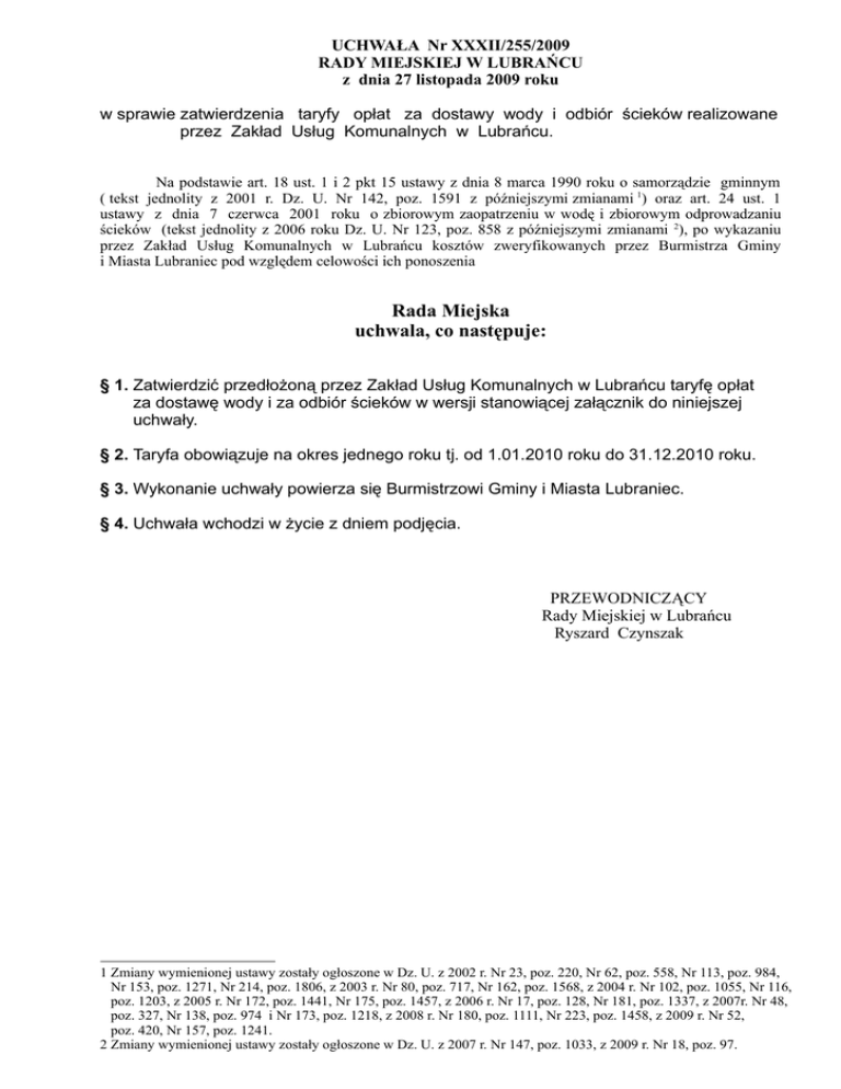 UCHWAŁA Nr XXXII/255/2009 RADY MIEJSKIEJ W LUBRAŃCU z dnia 27 listopada 2009 roku w sprawie zatwierdzenia taryfy opłat za dostawy wody i odbiór ścieków realizowane przez Zakład Usług Komunalnych w Lubrańcu. Na podstawie art. 18 ust. 1 i 2 pkt 15 ustawy z dnia 8 marca 1990 roku o samorządzie gminnym ( tekst jednolity z 2001 r. Dz. U. Nr 142, poz. 1591 z późniejszymi zmianami 1) oraz art. 24 ust. 1 ustawy z dnia 7 czerwca 2001 roku o zbiorowym zaopatrzeniu w wodę i zbiorowym odprowadzaniu ścieków (tekst jednolity z 2006 roku Dz. U. Nr 123, poz. 858 z późniejszymi zmianami 2), po wykazaniu przez Zakład Usług Komunalnych w Lubrańcu kosztów zweryfikowanych przez Burmistrza Gminy i Miasta Lubraniec pod względem celowości ich ponoszenia Rada Miejska uchwala, co następuje: § 1. Zatwierdzić przedłożoną przez Zakład Usług Komunalnych w Lubrańcu taryfę opłat za dostawę wody i za odbiór ścieków w wersji stanowiącej załącznik do niniejszej uchwały. § 2. Taryfa obowiązuje na okres jednego roku tj. od 1.01.2010 roku do 31.12.2010 roku. § 3. Wykonanie uchwały powierza się Burmistrzowi Gminy i Miasta Lubraniec. § 4. Uchwała wchodzi w życie z dniem podjęcia. PRZEWODNICZĄCY Rady Miejskiej w Lubrańcu Ryszard Czynszak 1 Zmiany wymienionej ustawy zostały ogłoszone w Dz. U. z 2002 r. Nr 23, poz. 220, Nr 62, poz. 558, Nr 113, poz. 984, Nr 153, poz. 1271, Nr 214, poz. 1806, z 2003 r. Nr 80, poz. 717, Nr 162, poz. 1568, z 2004 r. Nr 102, poz. 1055, Nr 116, poz. 1203, z 2005 r. Nr 172, poz. 1441, Nr 175, poz. 1457, z 2006 r. Nr 17, poz. 128, Nr 181, poz. 1337, z 2007r. Nr 48, poz. 327, Nr 138, poz. 974 i Nr 173, poz. 1218, z 2008 r. Nr 180, poz. 1111, Nr 223, poz. 1458, z 2009 r. Nr 52, poz. 420, Nr 157, poz. 1241. 2 Zmiany wymienionej ustawy zostały ogłoszone w Dz. U. z 2007 r. Nr 147, poz. 1033, z 2009 r. Nr 18, poz. 97. UZASADNIENIE DO UCHWAŁY ZATWIERDZAJĄCEJ TARYFĘ DLA ZBIOROWEGO ZAOPATRZENIA W WODĘ I ZBIOROWEGO ODPROWADZANIA ŚCIEKÓW Ustawa z dnia 7 czerwca 2001 roku o zbiorowym zaopatrzeniu w wodę i zbiorowym odprowadzaniu ścieków nałożyła na przedsiębiorstwa zajmujące się sprzedażą wody i oczyszczaniem ścieków obowiązek opracowania taryf dla zbiorowego zaopatrzenia w wodę i zbiorowego odprowadzania ścieków. Taryfa podlega zatwierdzeniu w formie uchwały przez radę gminy. W dniu 12 października 2009 roku Zakład Usług Komunalnych w Lubrańcu złożył wniosek o zatwierdzenie taryfy na wodę i ścieki Gminy Lubraniec. Do wniosku załączone zostały tabele, przedstawiające poniesione koszty na poszczególnych działalnościach objętych taryfą w roku obrachunkowym, obejmującym pełnych dwanaście miesięcy przed złożeniem wniosku oraz planowane do poniesienia koszty i planowane przychody na przedmiotowych działalnościach w okresie obowiązywania taryfy. Tabele zostały opracowane zgodnie z rozporządzeniem Ministra Budownictwa z dnia 28 czerwca 2006 roku w sprawie określenia taryf, wzoru wniosku o zatwierdzenie taryf oraz warunków rozliczeń za zbiorowe zaopatrzenie w wodę i zbiorowe odprowadzanie ścieków. Planowane koszty na działalności zbiorowego zaopatrzenia w wodę i zbiorowego odprowadzania ścieków obejmują koszty utrzymania i eksploatacji ujęć wody i sieci wodociągowej. W skład tych kosztów wchodzą płace obsługi ujęć wody i brygady remontowej usuwającej awarie, koszty energii elektrycznej, koszty materiałów i środków chemicznych, koszty ogólnozakładowe, koszty opłat środowiskowych. Planowane koszty określone przez Zakład Usług Komunalnych w Lubrańcu nie zawierają kosztów modernizacji ujęć i sieci wodociągowej oraz kanalizacyjnej. W planie kosztów przyjęto wymianę zasobów oraz zasuw, naprawę pomp, wymianę hydrantów i usuwanie bieżących awarii na sieciach wodociągowych. Nie przyjęto w kosztach - budowy urządzeń wodociągowych i kanalizacyjnych. Koszty nie zawierają marży zysku. Przy opracowaniu taryfy zachowano należytą staranność zmierzającą do ochrony interesów odbiorców i minimalizacji kosztów uzasadnionych tj. kosztów bieżącej eksploatacji niezbędnych do wykonania zadań wynikających z ustawy. Do chwili obecnej cena 1m3 wody wynosiła 1,67 zł. dla odbiorców z terenu Gminy Lubraniec i Gminy Boniewo i 2,72 zł. dla odbiorcy jakim jest Gmina Brześć Kujawski oraz stawkę opłaty abonamentowej w wysokości 3,10 zł./ miesięcznie dla Gminy Lubraniec i Gminy Boniewo, a dla Gminy Brześć Kujawski w wysokości 50,00 zł./ miesięcznie. Powyższe ceny nie zawierały podatku VAT. W zaproponowanej taryfie cena za 1 m 3 wody wynosi 1,77 zł. dla odbiorców z terenu Gminy Lubraniec oraz Gminy Boniewo i 2,80 zł. dla odbiorców z terenu Gminy Brześć Kujawski, oraz stawkę opłaty abonamentowej w wysokości 3,10 zł./ miesięcznie dla Gminy Lubraniec i Gminy Boniewo, a dla Gminy Brześć Kujawski w wysokości 50,00 zł./ miesięcznie. Powyższe ceny nie zawierają podatku VAT . W chwili obecnej cena 1 m 3 ścieków wynosi 2,68 zł., co z dotacją gminy w wysokości 0,19 zł. netto do 1 m3 ścieków dawało cenę dla mieszkańców w wysokości 2,49 zł./m3. W zaproponowanej taryfie cena 1 m3 ścieków kształtować się będzie w wysokości 2,80 zł./m3 Powyższe ceny nie zawierają podatku VAT. Mając powyższe na uwadze, proszę Wysoką Radę o przyjęcie uchwały w proponowanym brzmieniu. PRZEWODNICZĄCY Rady Miejskiej w Lubrańcu Ryszard Czynszak Załącznik do uchwały Nr XXXII/255/2009 Rady Miejskiej w Lubrańcu z dnia 27 listopada 2009 roku Zakład Usług Komunalnych w Lubrańcu TARYFA DLA ZBIOROWEGO ZAOPATRZENIA W WODĘ I ZBIOROWEGO ODPROWADZANIA ŚCIEKÓW Rok 2010 Lubraniec, 2010 rok Część I Objaśnienia pojęć i skrótów 1. 2. 3. 4. 5. 6. 7. 8. 9. 10. 11. 12. 13. 14. 15. ustawa - ustawa z dnia 7 czerwca 2001 roku o zbiorowym zaopatrzeniu w wodę i zbiorowym odprowadzaniu ścieków ( Dz. U. z 2006 roku Nr 123, poz. 858 ze zm. ), rozporządzen
