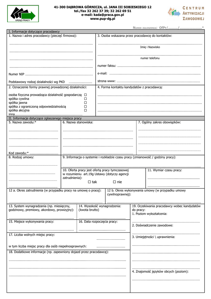 41-300 DĄBROWA GÓRNICZA, ul. JANA III SOBIESKIEGO 12 tel./fax 32 262 37 39; 32 262 69 51 e-mail: [email protected] www.pup-dg.pl NUMER ZGŁOSZENIA: OfPr/………/…………………* I. Informacje dotyczące pracodawcy 1. Nazwa i adres pracodawcy (pieczęć firmowa): 3. Osoba wskazana przez pracodawcę do kontaktów: …………………………………………………………………………………… ………………………………………………………………………………………………………… Imię i Nazwisko …………………………………………………………………………………… ………………………………………………………………………………………………………… numer telefonu …………………………………………………………………………………… …………………………………………………………………………………… numer faksu: …………………………………………………………………………………… Numer NIP …………………………………………………………………… e-mail: …………………………………………………………………………………………… Podstawowy rodzaj działalności wg PKD strona www: …………………………………………………………………………………… ……………………… 2. Oznaczenie formy prawnej prowadzonej działalności: 4. Forma kontaktu kandydatów z pracodawcą: osoba fizyczna prowadząca działalność gospodarczą spółka cywilna spółka jawna spółka z ograniczoną odpowiedzialnością spółka akcyjna inna…………………………………………………………………… II. Informacje dotyczące zgłaszanego miejsca pracy 6. Nazwa stanowiska: 5. Nazwa zawodu:* ………………………………………………………………………………………………………… ………………………………………………………………………………………………………… ………………………………………………………………………………………………………… 7. Ogólny zakres obowiązków: ………………………………………………… ……………………………………………………………………… ……………………………………………………………………… ………………………………………………… ……………………………………………………………………… ……………………………………………………………………… ……………………………………………….... ……………………………………………………………………… Kod zawodu:* …………………………… 8. Rodzaj umowy: ……………………………………………………………………… 9. Informacja o systemie i rozkładzie czasu pracy (zmianowość / godziny pracy): ……………………………………………………… …………………………………………………………………………………………………………………………………………… 10. Oferta pracy jest ofertą pracy tymczasowej 11. Wymiar czasu pracy: w rozumieniu art.19g Ustawy (dotyczy agencji zatrudnienia): …………………………………………………… ……………………………………………………………………… ……………………………………………………………………… …………………………………………………… ……………………………………………………... tak nie …………………………………………………… ……………………………………………………… 12 a. Okres zatrudnienia (w przypadku pracy na umowę o pracę): 12 b. Okres wykonywania umowy (w przypadku umowy cywilnoprawnej): ……………………………………………………………………………………………… ……………………………………………………………………………………………… 14. Wysokość wynagrodzenia: 19. Oczekiwania pracodawcy wobec kandydatów 13. System wynagradzania (np. miesięczny, godzinowy, premiowy, akordowy, prowizyjny): (kwota brutto) do pracy: 1. Poziom wykształcenia: ………………………………………………………………… ……………………………………………… …………………………………………………………………… 15. Miejsce wykonywania pracy: 16. Data rozpoczęcia pracy: 2. Doświadczenie zawodowe: ………………………………………………………………… ……………………………………………… …………………………………………………………………… 17. Liczba wolnych miejsc pracy: 3. Umiejętności \ uprawnienia: …………………………… w tym liczba miejsc pracy dla osób niepełnosprawnych: …………………………… …………………………………………………………………… 18. Dodatkowe informacje (np. zapewniony dojazd przez pracodawcę): …………………………………………………………………… ……………………………………………………………………………………………………………………… …………………………………………………………………… ……………………………………………………………………………………………………………………… …………………………………………………………………… 4. Znajomość języków obcych (poziom): …………………………………………………………………………………