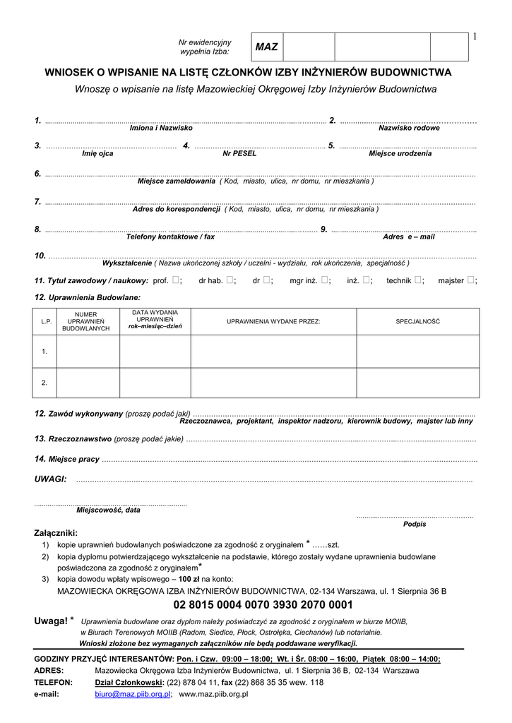 Nr ewidencyjny wypełnia Izba: 1 MAZ WNIOSEK O WPISANIE NA LISTĘ CZŁONKÓW IZBY INŻYNIERÓW BUDOWNICTWA Wnoszę o wpisanie na listę Mazowieckiej Okręgowej Izby Inżynierów Budownictwa 1. ................................................................................................................................... ……….. 2. ..................................... ….……………… Imiona i Nazwisko Nazwisko rodowe 3. ………………………………………………… 4. ………………………..……………………….. 5. ......................................... ….………………... Imię ojca Nr PESEL Miejsce urodzenia 6. ............................................................................................................................................................................................... …………………… Miejsce zameldowania ( Kod, miasto, ulica, nr domu, nr mieszkania ) 7. ............................................................................................................................................................................................... …………………… Adres do korespondencji ( Kod, miasto, ulica, nr domu, nr mieszkania ) 8. .............................................................. ......... ........................................................... ….… 9. ............................................... …...……….…….. Adres e – mail Telefony kontaktowe / fax 10. ………………………………………….………………………………………………………………………………………………………………………… Wykształcenie ( Nazwa ukończonej szkoły / uczelni - wydziału, rok ukończenia, specjalność ) 11. Tytuł zawodowy / naukowy: prof. ; dr hab. ; dr ; mgr inż. ; inż. ; technik ; majster ; 12. Uprawnienia Budowlane: L.P. NUMER UPRAWNIEŃ BUDOWLANYCH DATA WYDANIA UPRAWNIEŃ rok–miesiąc–dzień SPECJALNOŚĆ UPRAWNIENIA WYDANE PRZEZ: 1. 2. 12. Zawód wykonywany (proszę podać jaki) ……………………………..…………………………………………………………………………….. Rzeczoznawca, projektant, inspektor nadzoru, kierownik budowy, majster lub inny 13. Rzeczoznawstwo (proszę podać jakie) ……………………………………………………………..…..……………..…………………………..… 14. Miejsce pracy ………………………………………..………………………………….………………………………………..…………………………. UWAGI: ……………………………………..………………………………….………………………………………..……………………………………. ................................................................................ Miejscowość, data .............…………….……..…………….. Podpis Załączniki: * ……szt. 1) kopie uprawnień budowlanych poświadczone za zgodność z oryginałem 2) kopia dyplomu potwierdzającego wykształcenie na podstawie, którego zostały wydane uprawnienia budowlane poświadczona za zgodność z oryginałem* kopia dowodu wpłaty wpisowego – 100 zł na konto: 3) MAZOWIECKA OKRĘGOWA IZBA INŻYNIERÓW BUDOWNICTWA, 02-134 Warszawa, ul. 1 Sierpnia 36 B 02 8015 0004 0070 3930 2070 0001 Uwaga! * Uprawnienia budowlane oraz dyplom należy poświadczyć za zgodność z oryginałem w biurze MOIIB, w Biurach Terenowych MOIIB (Radom, Siedlce, Płock, Ostrołęka, Ciechanów) lub notarialnie. Wnioski złożone bez wymaganych załączników nie będą poddawane weryfikacji. GODZINY PRZYJĘĆ INTERESANTÓW: Pon. i Czw. 09:00 – 18:00; Wt. i Śr. 08:00 – 16:00, Piątek 08:00 – 14:00; ADRES: Mazowiecka Okręgowa Izba Inżynierów Budownictwa, ul. 1 Sierpnia 36 B, 02-134 Warszawa TELEFON: e-mail: Dział Członkowski: (22) 878 04 11, fax (22) 868 35 35 wew. 118 [email protected]; www.maz.piib.org.pl INFORMACJA O SKŁADKACH CZŁONKOWSKICH: 2 Opłaty poszczególnych składek należy wnosić po nadaniu numeru członkowskiego: MAZ/.../…..../.... oraz indywidualnych numerów kont bankowych w MOIIB i PIIB. 1. MAZOWIECKA OKRĘGOWA IZBA INŻYNIERÓW BUDOWNICTWA ul. 1 Sierpnia 36 B, 02-134 Warszawa - roczna składka członkowska na MOIIB, płatna za 12 m-cy – 348 zł lub w dwóch ratach po 174 zł Składkę należy wpłacić na indywidualne konto bankowe przyznane każdemu członkowi MOIIB. 2. POLSKA IZBA INŻYNIERÓW BUDOWNICTWA ul. Mazowiecka 6/8, 00-048 Warszawa - roczna składka członkowska na działalność Krajowej Rady – 72 zł oraz roczna składka na ubezpieczenie OC – 70 zł, Płatne łącznie za cały rok w kwocie 142 zł Składkę należy wpłacić na indywidualne konto bankowe PIIB przyznane każdemu członkowi izby. Uwaga: Na drukach przelewów należy podać swój numer członkowski: MAZ/…../…..…../…. Informacja o przyznanym numerze członkowskim oraz indywidualnych numerach kont bankowych zostanie wysłana pocztą, listem zwykłym, natomiast powiadomienie o wpisie na listę członków wraz z zaświadczeniem potwierdzającym członkostwo zostanie wysłane pocztą, listem poleconym za zwrotnym potwierdzeniem odbioru po podjęciu stosownej uchwały. Numer członkowski oraz numery kont bankowych będzie można uzyskać również w biurze MOIIB oraz na stronie internetowej www.maz.piib.org.pl pod wskazanym linkiem http://www.maz.piib.org.pl/index.php/dc Członkostwo w MOIIB zgodnie z art. 41 pkt 4 ustawy z dnia 15 grudnia 2000 r. o samorządach zawodowych architektów, inżynierów budownictwa oraz urbanistów, jak również Statutem PIIB §17, pkt 4 wiąże się z obowiązkiem opłacania składek i ubezpieczenia OC. Pragniemy zaznaczyć, iż członkostwo i ubezpieczenie OC będą ważne, o ile za dany okres zostaną opłacone dwie składki. Warunkiem wydania zaświadczenia jest wpływ składek n