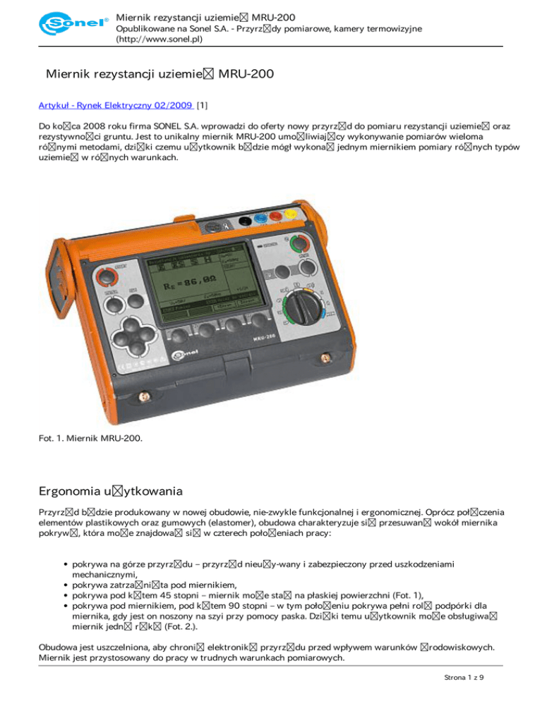 Miernik rezystancji uziemie MRU-200 Opublikowane na Sonel S.A. - Przyrz (http://www.sonel.pl) Miernik rezystancji uziemie dy pomiarowe, kamery termowizyjne MRU-200 Artykuł - Rynek Elektryczny 02/2009 [1] Do ko ca 2008 roku firma SONEL S.A. wprowadzi do oferty nowy przyrz d do pomiaru rezystancji uziemie oraz rezystywno ci gruntu. Jest to unikalny miernik MRU-200 umo liwiaj cy wykonywanie pomiarów wieloma ró nymi metodami, dzi ki czemu u ytkownik b dzie mógł wykona jednym miernikiem pomiary ró nych typów uziemie w ró nych warunkach. Fot. 1. Miernik MRU-200. Ergonomia u ytkowania Przyrz d b dzie produkowany w nowej obudowie, nie-zwykle funkcjonalnej i ergonomicznej. Oprócz poł czenia elementów plastikowych oraz gumowych (elastomer), obudowa charakteryzuje si przesuwan wokół miernika pokryw , która mo e znajdowa si w czterech poło eniach pracy: pokrywa na górze przyrz du ‒ przyrz d nieu y-wany i zabezpieczony przed uszkodzeniami mechanicznymi, pokrywa zatrza ni ta pod miernikiem, pokrywa pod k tem 45 stopni ‒ miernik mo e sta na płaskiej powierzchni (Fot. 1), pokrywa pod miernikiem, pod k tem 90 stopni ‒ w tym poło eniu pokrywa pełni rol podpórki dla miernika, gdy jest on noszony na szyi przy pomocy paska. Dzi ki temu u ytkownik mo e obsługiwa miernik jedn r k (Fot. 2.). Obudowa jest uszczelniona, aby chroni elektronik przyrz du przed wpływem warunków Miernik jest przystosowany do pracy w trudnych warunkach pomiarowych. rodowiskowych. Strona 1 z 9 Miernik rezystancji uziemie MRU-200 Opublikowane na Sonel S.A. - Przyrz (http://www.sonel.pl) dy pomiarowe, kamery termowizyjne Fot. 2. Miernik w pozycji roboczej. MRU-200 wyposa ony jest w du y, czytelny wy wietlacz graficzny, który mo e zosta pod wietlony. Na wy wietlaczu prezentowane s szczegółowe dane pomiarowe. Dzi ki temu u ytkownik ma mo liwo dokładnej oceny pomiaru. Pomiary rezystancji uziemie oraz rezystywno ci gruntu mo na wpisa do pami ci o pojemno ci 1000 pomiarów. Zgromadzone dane mo na przesła do komputera przy pomocy standardowego przewodu USB lub za po rednictwem interfejsu bezprzewodowego, w który wyposa ony jest MRU-200. Przyrz d zasilany jest z wysokowydajnych akumulatorów, które umo liwiaj wykonanie do kilkuset pomiarów w zale no ci od wybranej metody pomiarowej. Istnieje równie mo liwo zasilania miernika ze standardowych baterii alkalicznych typu LR14 (rozmiar C). Dzi ki temu w sytuacjach awaryjnych, u ytkownik nie traci mo liwo ci wykonywania pomiarów. Dodatkow zalet jest mo liwo ładowania akumulatorów miernika z gniazdka zapalniczki samochodowej o napi ciu 12V. Przy tych wszystkich mo liwo ciach, MRU-200 wraz z pakietem akumulatorów wa przekłada si na komfort u ytkowania. y zaledwie 2 kg, co wydatnie Metody pomiarowe Jak wspomniano we wst pie, MRU-200 posiada mo -liwo pomiarów rezystancji uziemie ró nymi metodami: dwuprzewodow , trzyprzewodow bez dodatkach c gów oraz z c gami, czteroprzewodow , dwuc gow bez pomocniczych sond wbijanych w grunt, udarow . Dodatkowo mo na wykona instalacji uziemiaj cych. pomiary rezystywno ci gruntu oraz mierzy pr dy upływowe lub uszkodzeniowe Strona 2 z 9 Miernik rezystancji uziemie MRU-200 Opublikowane na Sonel S.A. - Przyrz (http://www.sonel.pl) dy pomiarowe, kamery termowizyjne Przed wykonaniem pomiaru, miernik sprawdza, czy w badanym obiekcie nie wyst puje zbyt wysokie napi cie zakłócaj ce. Mo liwy jest pomiar przy napi ciu zakłócaj cym AC+DC do 24V. Powy ej tej warto ci pomiary s blokowane. Aby wyeliminowa zakłócenia o cz stotliwo ciach sieciowych, cz stotliwo napi cia oraz pr du pomiarowego wynosi 125Hz dla sieci 16 2/3Hz, 50Hz oraz 400Hz. Dla sieci 60Hz cz stotliwo pr du pomiarowego wynosi 150Hz. U ytkownik mo e sam okre li typ sieci w menu (szybsze pomiary), albo ustawi tryb automatycznego dostrajania si miernika do warunków panuj cych w badanym obiekcie (pomiary wolniejsze). Nale y zaznaczy , e MRU-200 generuje napi cie i pr d pomiarowy sinusoidalny, zalecany przez normy. Inne mierniki najcz ciej wykonuj pomiary pr dem przemiennym o kształcie prostok tnym. Dwuprzewodowy pomiar rezystancji Przyrz d posiada mo liwo pomiaru rezystancji do 20kΩ z maks. rozdzielczo ci 0,01Ω (Rys.1). Aby wyeliminowa wpływ rezystancji przewodów pomiarowych na wynik pomiaru, przyrz d potrafi zapami ta rezystancj oraz odj j od wyniku pomiaru (funkcja Auto-Zero). Rys. 1. Pomiar rezystancji metod dwuprzewodow ich . Trzy- i czteroprzewodowy pomiar rezystancji uziemie Zastosowany pomiar rezystancji uziemienia oparty jest na metodzie technicznej z wykorzystaniem dwóch elektrod pomocniczych wbijanych w grunt: pr dowej i napi ciowej. W czasie pomiaru uziemienia mierzone s równie rezystancje elektrod pomocniczych, a ich warto ci s podawane wraz z ostatecznym wynikiem rezystancji uziemienia. Zakres pomiarowy wynosi do 20kΩ, maks. rozdzielczo 0,01Ω. Miernik automatycznie wybiera jeden z pi ciu podzakresów pomiarowych. W przypadku pomiarów uziemie o małych warto ciach rezystancji (poni ej 1Ω), mo na wykona pomiar rezystancji z wykorzystaniem dodatkowego czwartego przewodu (linia przerywana na Rys.2). Powoduje to wyeliminowanie rezystancji przewodów pomiarowych. Strona 3 z 9 Miernik rezystancji uziemie MRU-200 Opublikowane na Sonel S.A. - Przyrz (http://www.sonel.pl) Rys. 2. Pomiar rezystancji uziemienia metod Pomiar rezystancji uziemie dy pomiarowe, kamery termowizyjne trój- i czteroprzewodow wielokrotnych z u . yciem dodatkowych c gów Miernik MRU-200 posiada bardzo po yteczn funkcj , pozwalaj c na szybkie i proste wykonanie pomiarów uziemie wielokrotnych bez rozpinania zł cza kontrolnego mierzonego uziomu. Na Rys. 3 pokazano schemat poł czenia. Nale y zaznaczy , e pomiar ten nadal jest zgodny z zalecan przez norm metod techniczn spadku napi cia. C gi pr dowe słu do pomiaru tylko tej cz ci pr du, która płynie przez badany uziom. Dzi temu nie ma potrzeby rozł czania zł cza kontrolnego. Rys. 3. Pomiar rezystancji uziemienia z dodatkowymi c gami 