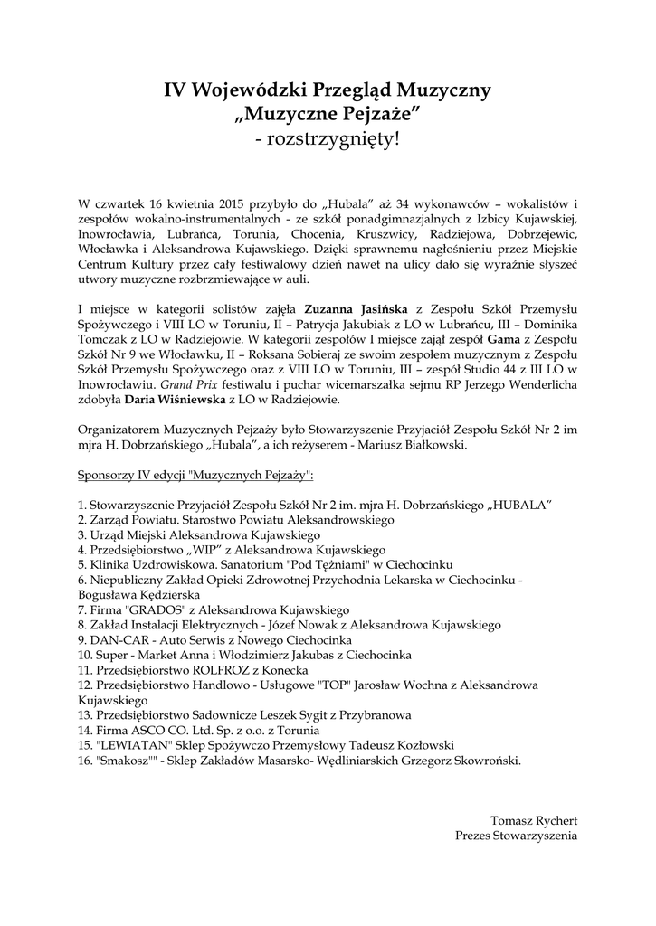 IV Wojewódzki Przegląd Muzyczny „Muzyczne Pejzaże” - rozstrzygnięty! W czwartek 16 kwietnia 2015 przybyło do „Hubala” aż 34 wykonawców – wokalistów i zespołów wokalno-instrumentalnych - ze szkół ponadgimnazjalnych z Izbicy Kujawskiej, Inowrocławia, Lubrańca, Torunia, Chocenia, Kruszwicy, Radziejowa, Dobrzejewic, Włocławka i Aleksandrowa Kujawskiego. Dzięki sprawnemu nagłośnieniu przez Miejskie Centrum Kultury przez cały festiwalowy dzień nawet na ulicy dało się wyraźnie słyszeć utwory muzyczne rozbrzmiewające w auli. I miejsce w kategorii solistów zajęła Zuzanna Jasińska z Zespołu Szkół Przemysłu Spożywczego i VIII LO w Toruniu, II – Patrycja Jakubiak z LO w Lubrańcu, III – Dominika Tomczak z LO w Radziejowie. W kategorii zespołów I miejsce zajął zespół Gama z Zespołu Szkół Nr 9 we Włocławku, II – Roksana Sobieraj ze swoim zespołem muzycznym z Zespołu Szkół Przemysłu Spożywczego oraz z VIII LO w Toruniu, III – zespół Studio 44 z III LO w Inowrocławiu. Grand Prix festiwalu i puchar wicemarszałka sejmu RP Jerzego Wenderlicha zdobyła Daria Wiśniewska z LO w Radziejowie. Organizatorem Muzycznych Pejzaży było Stowarzyszenie Przyjaciół Zespołu Szkół Nr 2 im mjra H. Dobrzańskiego „Hubala”, a ich reżyserem - Mariusz Białkowski. Sponsorzy IV edycji "Muzycznych Pejzaży": 1. Stowarzyszenie Przyjaciół Zespołu Szkół Nr 2 im. mjra H. Dobrzańskiego „HUBALA” 2. Zarząd Powiatu. Starostwo Powiatu Aleksandrowskiego 3. Urząd Miejski Aleksandrowa Kujawskiego 4. Przedsiębiorstwo „WIP” z Aleksandrowa Kujawskiego 5. Klinika Uzdrowiskowa. Sanatorium "Pod Tężniami" w Ciechocinku 6. Niepubliczny Zakład Opieki Zdrowotnej Przychodnia Lekarska w Ciechocinku Bogusława Kędzierska 7. Firma "GRADOS" z Aleksandrowa Kujawskiego 8. Zakład Instalacji Elektrycznych - Józef Nowak z Aleksandrowa Kujawskiego 9. DAN-CAR - Auto Serwis z Nowego Ciechocinka 10. Super - Market Anna i Włodzimierz Jakubas z Ciechocinka 11. Przedsiębiorstwo ROLFROZ z Konecka 12. Przedsiębiorstwo Handlowo - Usługowe "TOP" Jarosław Wochna z Aleksandrowa Kujawskiego 13. Przedsiębiorstwo Sadownicze Leszek Sygit z Przybranowa 14. Firma ASCO CO. Ltd. Sp. z o.o. z Torunia 15. "LEWIATAN" Sklep Spożywczo Przemysłowy Tadeusz Kozłowski 16. "Smakosz"" - Sklep Zakładów Masarsko- Wędliniarskich Grzegorz Skowroński. Tomasz Rychert Prezes Stowarzyszenia