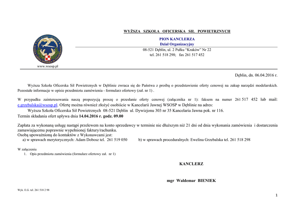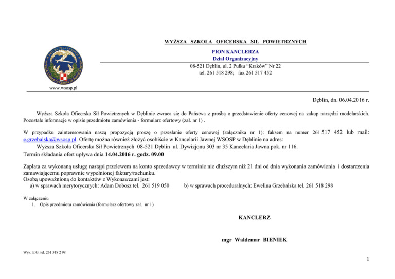 WYŻSZA SZKOŁA OFICERSKA SIŁ POWIETRZNYCH PION KANCLERZA Dział Organizacyjny 08-521 Dęblin, ul. 2 Pułku “Kraków” Nr 22 tel. 261 518 298; fax 261 517 452 www.wsosp.pl Dęblin, dn. 06.04.2016 r. Wyższa Szkoła Oficerska Sił Powietrznych w Dęblinie zwraca się do Państwa z prośbą o przedstawienie oferty cenowej na zakup narzędzi modelarskich. Pozostałe informacje w opisie przedmiotu zamówienia - formularz ofertowy (zał. nr 1) . W przypadku zainteresowania naszą propozycją proszę o przesłanie oferty cenowej (załącznika nr 1): faksem na numer 261 517 452 lub mail: [email protected]. Ofertę można również złożyć osobiście w Kancelarii Jawnej WSOSP w Dęblinie na adres: Wyższa Szkoła Oficerska Sił Powietrznych 08-521 Dęblin ul. Dywizjonu 303 nr 35 Kancelaria Jawna pok. nr 116. Termin składania ofert upływa dnia 14.04.2016 r. godz. 09.00 Zapłata za wykonaną usługę nastąpi przelewem na konto sprzedawcy w terminie nie dłuższym niż 21 dni od dnia wykonania zamówienia i dostarczenia zamawiającemu poprawnie wypełnionej faktury/rachunku. Osobą upoważnioną do kontaktów z Wykonawcami jest: a) w sprawach merytorycznych: Adam Dobosz tel. 261 519 050 b) w sprawach proceduralnych: Ewelina Grzebalska tel. 261 518 298 W załączeniu 1. Opis przedmiotu zamówienia (formularz ofertowy zał. nr 1) KANCLERZ mgr Waldemar BIENIEK Wyk. E.G. tel. 261 518 2 98 1 Załącznik nr 1 OPIS PRZEDMIOTU ZAMÓWIENIA / FORMULARZ OFERTOWY Lp Asortyment opis 1 Programator tester serw HFP – 25: - 1szt. testowanie serw analogowych i cyfrowych, zmiana kierunków obrotów, ustawienia krańcowych wychyleń, ustawianie prędkości obrotowej, programowanie pozycji dla Fail Safe, testy automatyczne i manualne, testowanie sygnału z odbiornika i pomiar napięcia w odbiorniku 2 Obrotomierz cyfrowy: - 1szt. zakres mierzonych obrotów 0-29900 obr/min, pomiar śmigieł dwu i trzyłopatowych, cyfrowy optyczny obrotomierz, 3 Termometr bezdotykowy na podczerwień : - 1szt. szybki pojedynczy pomiar temperatury, pomiar ciągły , pomiar ciągły ze wskazaniem maksymalnej lub minimalnej temperatury 4 Rozrusznik 180 Q-MODEL do 30CC: - 1szt. elektryczny rozrusznik do silników spalinowych, przystosowany do odpalania silników o pojemności do 30 ccm, zasilanie 12V 5 6 Wartość netto ogółem zamówienia VAT % Wartość brutto ogółem zamówienia Ręczna pompka do benzyny: - 1szt. ręczna pompka paliwa przystosowana do benzyny Waga elektroniczna: - 1szt. zakres ważenia do 5kg, dokładność ważenia 1gram, minimalna waga 2 gramy, funkcja kalibracji, tarowania 2 7 8 9 10 11 12 13 14 Świeca iskrowa NGK CM-6: - 4 szt. wysokość całkowita 36mm, gwint M10, długość gwintu 8mm Balast ołowiany: - 1kg. balast ołowiany do wyważania modeli RC, Ciężarki 10g i 5g, ciężarki z taśmą samoprzylepną Wąż ochronny spiralny 15/12/1000: - 5 m.b. elastyczny wąż ochronny (spirala), średnica zewnętrzna 15mm, średnica wewnętrzna 12mm, ochrona przed przetarciem wężyków paliwowych, przewodów elektrycznych Wąż ochronny spiralny 10/8/1000: - 5 m.b. elastyczny wąż ochronny (spirala), średnica zewnętrzna 10mm, średnica wewnętrzna 8mm, ochrona przed przetarciem wężyków paliwowych, przewodów elektrycznych Wąż ochronny spiralny 6/4/1000: - 5 m.b. elastyczny wąż ochronny (spirala), średnica zewnętrzna 6mm, średnica wewnętrzna 4mm, ochrona przed przetarciem wężyków paliwowych, przewodów elektrycznych Tkanina szklana 80g/m: - 1 szt. wymiar 1000x 2000mm gramatura 80g/m2, struktura splot krzyżowy Tkanina szklana 130g/m: - 1 szt. wymiar 1000x 2000mm gramatura 130g/m2, struktura splot krzyżowy Mikro guma 10x200x300: - 2 szt. grubość 10mm wymiar 200x300mm, mikroguma materiał skutecznie izolujący drgania wywołane pracą silnika spalinowego, zabezpiecza przed uszkodzeniem odbiorniki, akumulatory 3 15 16 17 18 19 20 21 22 23 Mikro guma 5x200x300: - 2 szt. grubość 5mm, wymiar 200x300mm, mikroguma materiał skutecznie izolujący drgania wywołane pracą silnika spalinowego, zabezpiecza przed uszkodzeniem odbiorniki, akumulatory Płytka laminatowa 1x300x185: - 4 szt. grubość 1mm, wymiar 300x185mm, laminatowa formatka charakteryzująca się dużą sztywnością i łatwą obróbką, Płytka laminatowa 2,4x300x210: - 4 szt. grubość 2,4mm, wymiar 300x210mm, laminatowa formatka charakteryzująca się dużą sztywnością i łatwą obróbką Odtłuszczacz JOKER: - 3 szt. opakowanie spray 400ml preparat do czyszczenia modeli z tłuszczów, pozostałości po spalaniu paliwa oraz innych zanieczyszczeń, Klej cyjanoakrylowy JOKER rzadki: - 4 szt. klej cyjanoakrylowy rzadki, opakowanie 20g Klej cyjanoakrylowy JOKER średni: - 6 szt. klej cyjanoakrylowy średni, opakowanie 20g Aktywator do CA JOKER: - 5 szt. aktywator w sprayu do klejów cyjanoakrylowych, opakowanie 200ml, Sklejka lotnicza 3x310x1000mm: - 2 szt. grubość 3mm, wymiar 310x1000mm, wysokiej jakości wielowarstwowa sklejka lotnicza, Sklejka lotnicza 6x310x1000mm: - 1 szt. grubość 6mm, wymiar 310x1000mm, wysokiej jakości wielowarstwowa sklejka lotnicza 4 24 Folia modelarska ORACOVER STAND. Biała: - 4 m.b. kolor biały, wymiar 60x400cm 25 Folia modelarska ORACOVER STAND. Czerwona: - 2 m.b. kolor czerwony, wymiar 60x400cm, 26 Folia modelarska ORACOVER STAND. Niebieska: - 2 m.b. kolor niebieski, wymiar 60x400cm 27 28 29 30 31 32 33 34 35 36 37 38 39 Rurka węglowa 3mm: - 5 szt. średnica zewnętrzna 3mm, średnica wewnętrzna 2mm, długość 1000mm Rurka węglowa 5mm: - 5 szt. średnica zewnętrzna 5mm, średnica wewnętrzna 3mm, długość 1000mm Rurka węglowa 8mm: - 3 szt. średnica zewnętrzna 8mm, średnica wewnętrzna 7mm, długość 1000mm Pręt węglowy 1mm: - 5 szt. średnica 1mm, długość 1000mm Pręt węglowy 3mm: - 5 szt. średnica 3mm, długość 1000mm Pręt węglowy 6mm: - 3szt. średnica 6mm, długość 1000mm Pręt stalowy 1mm: - 10szt. średnica 1mm, długość 1000mm Pręt stalowy 1,5mm: - 5 szt. średnica 
