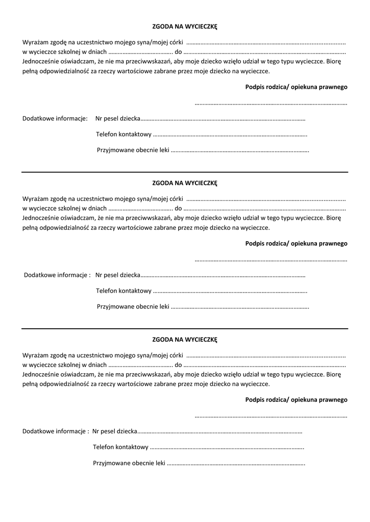 ZGODA NA WYCIECZKĘ Wyrażam zgodę na uczestnictwo mojego syna/mojej córki ………………………………………………………………........................... w wycieczce szkolnej w dniach ………………………………….. do ……………………………………………………………………………………….... Jednocześnie oświadczam, że nie ma przeciwwskazań, aby moje dziecko wzięło udział w tego typu wycieczce. Biorę pełną odpowiedzialność za rzeczy wartościowe zabrane przez moje dziecko na wycieczce. Podpis rodzica/ opiekuna prawnego ……………………………………………………………………………………. Dodatkowe informacje: Nr pesel dziecka…………………………………………………………………………………………… Telefon kontaktowy …………………………………………………………………………………….. Przyjmowane obecnie leki ……………………………………………………………………………. ZGODA NA WYCIECZKĘ Wyrażam zgodę na uczestnictwo mojego syna/mojej córki ………………………………………………………………........................... w wycieczce szkolnej w dniach ………………………………….. do ……………………………………………………………………………………….... Jednocześnie oświadczam, że nie ma przeciwwskazań, aby moje dziecko wzięło udział w tego typu wycieczce. Biorę pełną odpowiedzialność za rzeczy wartościowe zabrane przez moje dziecko na wycieczce. Podpis rodzica/ opiekuna prawnego ……………………………………………………………………………………. Dodatkowe informacje : Nr pesel dziecka…………………………………………………………………………………………… Telefon kontaktowy …………………………………………………………………………………….. Przyjmowane obecnie leki ……………………………………………………………………………. ZGODA NA WYCIECZKĘ Wyrażam zgodę na uczestnictwo mojego syna/mojej córki ………………………………………………………………........................... w wycieczce szkolnej w dniach ………………………………….. do ……………………………………………………………………………………….... Jednocześnie oświadczam, że nie ma przeciwwskazań, aby moje dziecko wzięło udział w tego typu wycieczce. Biorę pełną odpowiedzialność za rzeczy wartościowe zabrane przez moje dziecko na wycieczce. Podpis rodzica/ opiekuna prawnego ……………………………………………………………………………………. Dodatkowe informacje : Nr pesel dziecka…………………………………………………………………………………………… Telefon kontaktowy …………………………………………………………………………………….. Przyjmowane obecnie leki …………………………………………………………………………….