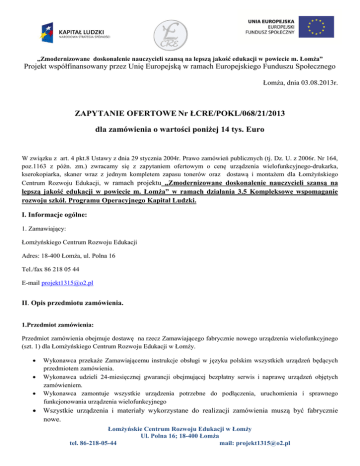 „Zmodernizowane doskonalenie nauczycieli szansą na lepszą jakość edukacji w powiecie m. Łomża” Projekt współfinansowany przez Unię Europejską w ramach Europejskiego Funduszu Społecznego Łomża, dnia 03.08.2013r. ZAPYTANIE OFERTOWE Nr ŁCRE/POKL/068/21/2013 dla zamówienia o wartości poniżej 14 tys. Euro W związku z art. 4 pkt.8 Ustawy z dnia 29 stycznia 2004r. Prawo zamówień publicznych (tj. Dz. U. z 2006r. Nr 164, poz.1163 z późn. zm.) zwracamy się z zapytaniem ofertowym o cenę urządzenia wielofunkcyjnego-drukarka, kserokopiarka, skaner wraz z jednym kompletem zapasu tonerów oraz dostawą i montażem dla Łomżyńskiego Centrum Rozwoju Edukacji, w ramach projektu „Zmodernizowane doskonalenie nauczycieli szansą na lepszą jakość edukacji w powiecie m. Łomża” w ramach działania 3.5 Kompleksowe wspomaganie rozwoju szkół. Programu Operacyjnego Kapitał Ludzki. I. Informacje ogólne: 1. Zamawiający: Łomżyńskiego Centrum Rozwoju Edukacji Adres: 18-400 Łomża, ul. Polna 16 Tel./fax 86 218 05 44 E-mail [email protected] II. Opis przedmiotu zamówienia. 1.Przedmiot zamówienia: Przedmiot zamówienia obejmuje dostawę na rzecz Zamawiającego fabrycznie nowego urządzenia wielofunkcyjnego (szt. 1) dla Łomżyńskiego Centrum Rozwoju Edukacji w Łomży. Wykonawca przekaże Zamawiającemu instrukcje obsługi w języku polskim wszystkich urządzeń będących przedmiotem zamówienia. Wykonawca udzieli 24-miesięcznej gwarancji obejmującej bezpłatny serwis i naprawę urządzeń objętych zamówieniem. Wykonawca zamontuje wszystkie urządzenia potrzebne do podłączenia, uruchomienia i sprawnego funkcjonowania urządzenia wielofunkcyjnego Wszystkie urządzenia i materiały wykorzystane do realizacji zamówienia muszą być fabrycznie nowe. Łomżyńskie Centrum Rozwoju Edukacji w Łomży Ul. Polna 16; 18-400 Łomża tel. 86-218-05-44 mail: [email protected] „Zmodernizowane doskonalenie nauczycieli szansą na lepszą jakość edukacji w powiecie m. Łomża” Projekt współfinansowany przez Unię Europejską w ramach Europejskiego Funduszu Społecznego 2. Wymagane parametry techniczne urządzenia Urządzenie wielofunkcyjne 1. 1.1 1.2 1.3 1.4 1.5 1.6 1.7 1.8 2. 2.1 2.2 2.3 2.4 2.5 2.6 3. 3.1 3.2 3.3 4. 4.1 4.2 4.3 4.4 4.5 4.6 4.8 4.9 4.10 4.11 4.12 4.13 4.14 4.15 - Prędkość kopiowania - Rozdzielczość kopiowania -Czas pierwszej kopii cz./b. -Format oryginału -Skalowanie -Pamięć ustawień zadań -Nakładki, znaki wodne, zabezpieczenie przed kopiowaniem - Wielokrotne kopiowanie Kopiarka min. 22 str/min [b&w, A4] 14 str/min w A3 min. 600 x 600 dpi Max 4,5 sekundy A5-A3 25-400% w kroku co 0,1% tak tak min. 999 Drukarka - Prędkość drukowania - Rozdzielczość drukowania - Język opisu strony - Systemy operacyjne --Nakładki, znaki wodne, zabezpieczenie przed kopiowaniem -Bezpośrednie drukowanie plików PCL, PS, TIFF, JPEG, XPS, PDF i szyfrowanych plików PDF - Prędkość skanowania - Rozdzielczość skanowania - Tryby skanowania: - Format oryginału - Format papieru - Gramatura papieru - Podajnik oryginałów - Liczba kaset - Pojemność papieru - Duplex - Czas pierwszej kopii - Panel sterowania - Kody dostępu - Pamięć kopiarki - Skalowalność - Dysk twardy -Tryby wykańczania min. 22 str/min [b&w, A4] min. 1800 x 600 dpi min. PCL6, PCL5e/c (XL3.0) min. Windows 2000/XP/Vista, Linux tak tak Skaner kolorowy Min60. skan/min (w czerni) w 600dpi min 40skan/min kolor min. 600 x 600 dpi min. PC-Twain, HDD, FTP, e-mail, USB System min. A5 - A3 min. A6 - A3 min. 60 - 210 g/m2 automatyczny min. 90 ark. min. 2 min. 1100 ark. TAK max4 sek. uchylny, dotykowy w języku polskim min. 500 min. 2 GB min. 25% - 400% min. 250 GB Przesunięcie, grupowanie, sortowanie, zszywanie, dziurkowanie, składanie na środku, broszura 5. 5.1 Zsumowana wydajność tonerów dołączonych do urządzenia (w stronach min. 140 tys. Łomżyńskie Centrum Rozwoju Edukacji w Łomży Ul. Polna 16; 18-400 Łomża tel. 86-218-05-44 mail: [email protected] „Zmodernizowane doskonalenie nauczycieli szansą na lepszą jakość edukacji w powiecie m. Łomża” Projekt współfinansowany przez Unię Europejską w ramach Europejskiego Funduszu Społecznego wydruku, przy zaczernieniu 5%) 4. 4.1 4.2 4.3 4.5 5. 5.1 5.2 Funkcje Faxu - Format papieru - Gramatura papieru - Podajnik oryginałów - Szybkość wysyłania Inne: Słuchawka telefoniczna Wydajność tonera min. A4 min. 80 g/m2 automatyczny min. 25 ark. min. 3 sekundy na stronę TAK min. 1999 stron (przy pokryciu 5%) III. Termin wykonania zamówienia. Termin realizacji zamówienia: do 28.08.2013r. IV. Opis sposobu przygotowania oferty. 1. Oferta powinna zostać przygotowana zgodnie z załącznikiem nr 1 do niniejszego zapytania i dostarczona wraz z załącznikami nr 2,3 i 4. 2. Każdy wykonawca powinien dostarczyć aktualny odpis z właściwego rejestru albo aktualne zaświadczenie o wpisie do ewidencji działalności gospodarczej (kopia poświadczona „za zgodność z oryginałem”). 3. Każdy z wykonawców biorących udział w postępowaniu może złożyć tylko jedną ofertę. Oferta powinna zostać podpisana przez osoby upoważnione do reprezentowania oferenta zgodnie z aktami statutowymi wykonawcy. 4. Ceny należy wyrazić w PLN, z dokładnością do dwóch miejsc po przecinku. 5. Rozliczenie między Zamawiającym, a Wykonawcą będą prowadzone w PLN. V. Miejsce oraz termin dostarczania ofert. 1. Oferty należy składać w terminie do dnia 14.08.2013r. do godz. 15.00 osobiście/listownie w sekretariacie: Łomżyńskie Centrum Rozwoju Edukacji w Łomży (ŁCRE) (dopuszcza się również możliwość złożenia oferty na innym druku); złożyć w zapieczętowanej kopercie z dopiskiem: Zapytanie ofertowe na dostawę urządzenia wielofunkcyjnego dla Łomżyńskiego Centrum Rozwoju Edukacji, w ramach projektu „Zmodernizowane doskonalenie nauczycieli szansą na lepszą jakość edukacji w powiecie m. Łomża” lub pocztą elektroniczn