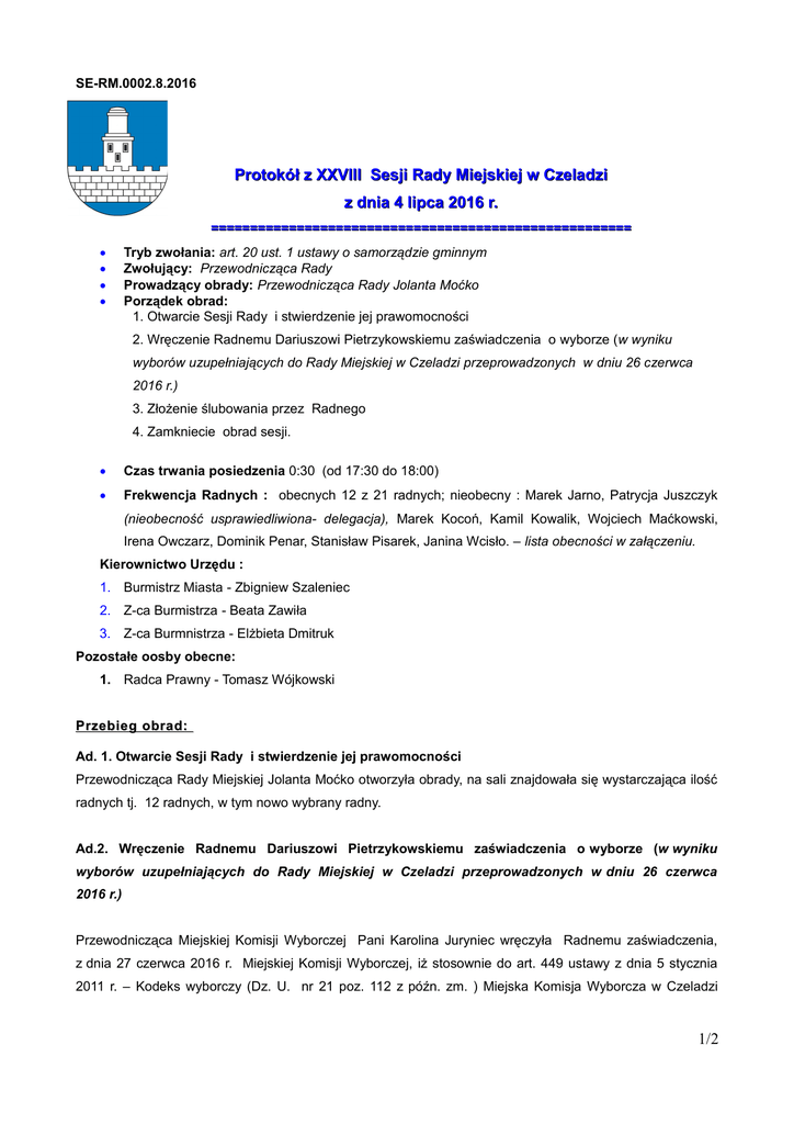 SE-RM.0002.8.2016 Protokół z XXVIII Sesji Rady Miejskiej w Czeladzi z dnia 4 lipca 2016 r. ====================================================== Tryb zwołania: art. 20 ust. 1 ustawy o samorządzie gminnym Zwołujący: Przewodnicząca Rady Prowadzący obrady: Przewodnicząca Rady Jolanta Moćko Porządek obrad: 1. Otwarcie Sesji Rady i stwierdzenie jej prawomocności 2. Wręczenie Radnemu Dariuszowi Pietrzykowskiemu zaświadczenia o wyborze (w wyniku wyborów uzupełniających do Rady Miejskiej w Czeladzi przeprowadzonych w dniu 26 czerwca 2016 r.) 3. Złożenie ślubowania przez Radnego 4. Zamkniecie obrad sesji. Czas trwania posiedzenia 0:30 (od 17:30 do 18:00) Frekwencja Radnych : obecnych 12 z 21 radnych; nieobecny : Marek Jarno, Patrycja Juszczyk (nieobecność usprawiedliwiona- delegacja), Marek Kocoń, Kamil Kowalik, Wojciech Maćkowski, Irena Owczarz, Dominik Penar, Stanisław Pisarek, Janina Wcisło. – lista obecności w załączeniu. Kierownictwo Urzędu : 1. Burmistrz Miasta - Zbigniew Szaleniec 2. Z-ca Burmistrza - Beata Zawiła 3. Z-ca Burmnistrza - Elżbieta Dmitruk Pozostałe oosby obecne: 1. Radca Prawny - Tomasz Wójkowski Przebieg obrad: Ad. 1. Otwarcie Sesji Rady i stwierdzenie jej prawomocności Przewodnicząca Rady Miejskiej Jolanta Moćko otworzyła obrady, na sali znajdowała się wystarczająca ilość radnych tj. 12 radnych, w tym nowo wybrany radny. Ad.2. Wręczenie Radnemu Dariuszowi Pietrzykowskiemu zaświadczenia o wyborze (w wyniku wyborów uzupełniających do Rady Miejskiej w Czeladzi przeprowadzonych w dniu 26 czerwca 2016 r.) Przewodnicząca Miejskiej Komisji Wyborczej Pani Karolina Juryniec wręczyła Radnemu zaświadczenia, z dnia 27 czerwca 2016 r. Miejskiej Komisji Wyborczej, iż stosownie do art. 449 ustawy z dnia 5 stycznia 2011 r. – Kodeks wyborczy (Dz. U. nr 21 poz. 112 z późn. zm. ) Miejska Komisja Wyborcza w Czeladzi 1/2 SE-RM.0002.8.2016 stwierdza, że w wyborach które odbyły się dnia 26 czerwca 2016 r. Pan Pietrzykowski Dariusz Jarosław wybrany został Radnym Rady Miejskiej w Czeladzi. Ad. 3. Złożenie ślubowania przez Radnego Przewodnicząca Rady Miejskiej Jolanta Moćko odczytała treść ślubowania: „Wierny Konstytucji i prawu Rzeczypospolitej Polskiej, ślubuję uroczyście obowiązki radnego sprawować godnie, rzetelnie i uczciwie, mając na względzie dobro mojej gminy i jej mieszkańców". Po odczytaniu roty ślubowania Radny Dariusz Pietrzykowski stojąc wypowiedział słowo "ślubuję". Burmistrz Miasta oraz Przewodnicząca Rady Miejskiej złożyli nowemu radnemu gratulacje, a radny Dariusz Pietrzykowski zadeklarował, iż będzie chciał dobrze realizować funkcję radnego dla dobra społeczności lokalnej. Ad. 4. Zamkniecie obrad sesji. Przewodnicząca Rad Jolanta Moćko po wyczerpaniu porządku obrad zamknęła obrady Rady. Prowadzący obrady : Przewodnicząca Rady Miejskiej Jolanta Moćko W załaczneniu: 1. Zawadomienie o zwołaniu sesji wraz z porządkiem obrad 2. Lista obecności. 3. Obwieszczenie Komisarza Wyborczego w Katowicach o wynikach wyborów uzupełniających do Rady miejskiej w Czeladzi przeprowadzonych w dniu 26 czerwca 2016 r. 4. Zaświadczenie o wyborze na radnego. --------------------- Protokół został napisany, dnia: 6 lipca 2016 r. Protokolant : Katarzyna Gierat Protokół, został przedstawiony Radzie na sesji, dnia 28 września 2016 r. Do protokołu nie zgłoszono uwag i wniosków o jego zmianę, wiec stwierdzono jego przyjęcie przez Radę. 2/2