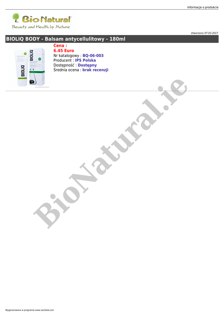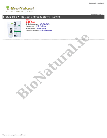 Informacje o produkcie Utworzono 07-03-2017 BIOLIQ BODY - Balsam antycellulitowy - 180ml Cena : 6.45 Euro B io N at ur al .ie Nr katalogowy : BQ-06-003 Producent : IPS Polska Dostępność : Dostępny Średnia ocena : brak recenzji Wygenerowano w programie www.oscGold.com Balsam antycellulitowy. Redukuje cellulit i tkankę tłuszczową. Wygładza i ujędrnia skórę. Bioliq BODY Balsam antycellulitowy - pobudza metabolizm tkanki tłuszczowej, redukuje cellulit, a także poprawia kondycję i wygląd skóry ud, pośladków oraz brzucha. Wyciąg owoców garcynii kambodżańskiej (Garcinia cambogia)* spowalnia syntezę kwasów tłuszczowych, redukując ilość podskórnej tkanki tłuszczowej. Balsam stymuluje mikrokrążenie, dzięki czemu ogranicza podskórne gromadzenie wody w organizmie, wpływając na redukcję widoczności tak zwanej skórki pomarańczowej". *Garcinia cambogia Garcynia kambodżańska jest wiecznie zielonym drzewem, wywodzącym się z południowo-wschodniej AZJI. Skórka owocu garcynii jest bogatym źródłem kwasu hydroksycytrynowego (HCA), ograniczającego syntezę kwasów tłuszczowych, dzięki czemu korzystnie wpływa na redukcję cellulitu. .ie Wskazania: Zalecany do redukcji cellulitu i modelowania sylwetki (uda, brzuch, pośladki). Odpowiedni również do skóry wrażliwej. Stosowanie: do codziennej pielęgnacji całego ciała Pozostałe informacje o produkcie: przechowywać w oryginalnym opakowaniu w temperaturze poniżej 25°C, nie chłodzić, nie zamrażać, przechowywać w miejscu niedostępnym dla małych dzieci, unikać kontaktu z oczami, produkt przebadany dermatologicznie. ur - al Opakowanie: 180ml O marce Bioliq N at Bioliq to innowacyjna marka dermokosmetyków przeznaczona do codziennej pielęgnacji, koncentrująca się na zaspokajaniu indywidualnych potrzeb skóry kobiet w każdym wieku. Wyjątkowa receptura marki Bioliq opiera się na naturalnych substancjach czynnych, otrzymywanych w wyniku ekstrakcji pozwalającej na skuteczne zachowanie ich unikanych właściwości. io Podstawą marki Bioliq jest wyciąg z Onopordum acanthium*, zawierający cenne dla skóry laktony seskwiterpenowe. Zastosowana metoda ekstrakcji sprawia, że zachowane są jego silne właściwości regeneracyjne, wynikające ze zdolności do pobudzania różnicowania się keratynocytów (komórek naskórka). Dzięki temu w naturalny sposób wszystkie produkty Bioliq stymulują rekonstrukcję skóry, wykazując działanie naprawcze i intensywnie odbudowujące. Każdy krem serii Bioliq, oprócz Onopordum acanthium, zawiera również naturalny wyciąg roślinny dedykowany indywidualnym potrzebom skóry w różnym wieku, wzmacniający i uzupełniający jego działanie. B *Onopordium acanthium Roślina należąca do rodziny astrowatych. Zawarte w wyciągu składniki aktywne pobudzają różnicowanie się keratynocytów (komórek skóry), dzięki czemu ma on silne właściwości regenerujące. strona www produktu: www.bioliq.pl Informacje dodatkowe: - Pochodzenie: Polska Najlepsze przed: 30/06/2015