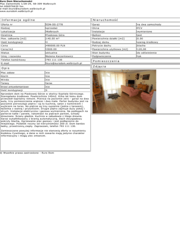 Euro Dom Nieruchomości Plac Zamenhofa 1/28-29, 58-309 Wałbrzych tel.606976630 fax. e-mail:[email protected] www.eurodom.walbrzych.pl Informacje ogólne Nieruchomość Oferta nr EDN-DS-2778 Garaż na dwa samochody Rodzaj sprzedaż Okna PCV Lokalizacja Wałbrzych Instalacje wymienione Dzielnica Piaskowa Góra Balkon jest Pow. całkowita [m2] 140.00 m² Powierzchnia działki [m2] 0.00 Ilość kondygnacji 3 Rodzaj domu szereg środkowy Cena 490000.00 PLN Pokrycie dachu blacha Cena/m2 3500.00 Powierzchnia użytkowa [m2] 120,00 Status aktualna Stan budynku do odświeżenia Imię i nazwisko Bożena Kaczorkiewicz Podpiwniczenie tak Telefon komórkowy 793 111 130 E-mail [email protected] Pomieszczenia Zdjęcia Opis Plac zabaw nie Alarm nie Winda nie Tarasy taras Drzwi antywłamaniowe nie Ilość kondygnacji 3 Sprzedam dom na Piaskowej Górze w okolicy Szpitala Górniczego. Szeregówka środkowa. Powierzchnia 140m2. Kilka lat temu dom przeszedł kapitalny remont. Piwnica na poziomie zero - garaż na dwa auta, trzy pomieszczenia większe i dwa małe. Parter budynku jest na poziomie pierwszego piętra i są to kuchnia, salon z kominkiem i wyjściem na taras. Na piętrze są trzy sypialnie (jedna z tarasem), łazienka z wanną i prysznicem. Drugie piętro zajmuje duży pokój i strych. Instalacje elektryczna i gazowa wymieniona. Na podłogach na parterze kafle i panele, natomiast na piętrach parkiet, schody drewniane. Ściany gładzie. Kuchnia w zabudowie z litego drewna. Garaż wykafelkowany z bramą automatyczną. Dach dwuspadowy pokryty blachą. Ogrzewanie piec gazowy i jest podłączenie do miejskiego. Podatek roczny od nieruchomości 200 zł. Dom bardzo ładny, przestronny,ciepły. Zapraszam, telefon 793 111 130. Zamieszczone powyżej informacje nie stanowią oferty w rozumieniu Kodeksu Cywilnego, a dane w nich zawarte mają jedynie charakter informacyjny i mogą ulec zmianom. © Wszelkie prawa zastrzeżone - Euro Dom