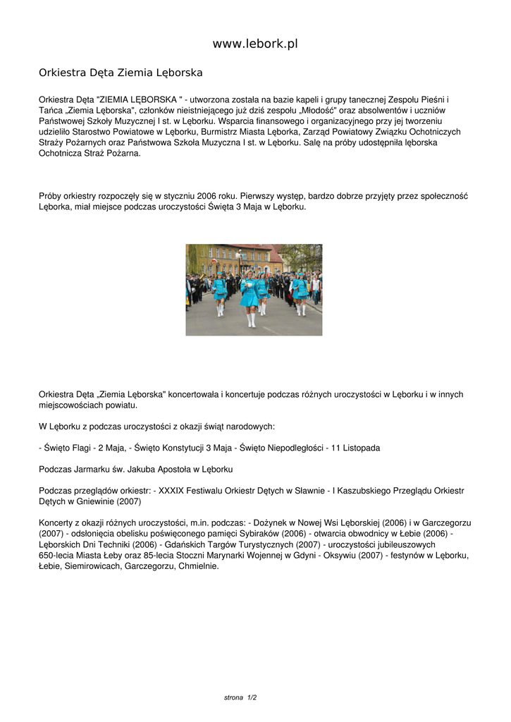 www.lebork.pl Orkiestra Dęta Ziemia Lęborska Orkiestra Dęta "ZIEMIA LĘBORSKA " - utworzona została na bazie kapeli i grupy tanecznej Zespołu Pieśni i Tańca „Ziemia Lęborska", członków nieistniejącego już dziś zespołu „Młodość" oraz absolwentów i uczniów Państwowej Szkoły Muzycznej I st. w Lęborku. Wsparcia finansowego i organizacyjnego przy jej tworzeniu udzieliło Starostwo Powiatowe w Lęborku, Burmistrz Miasta Lęborka, Zarząd Powiatowy Związku Ochotniczych Straży Pożarnych oraz Państwowa Szkoła Muzyczna I st. w Lęborku. Salę na próby udostępniła lęborska Ochotnicza Straż Pożarna. Próby orkiestry rozpoczęły się w styczniu 2006 roku. Pierwszy występ, bardzo dobrze przyjęty przez społeczność Lęborka, miał miejsce podczas uroczystości Święta 3 Maja w Lęborku. Orkiestra Dęta „Ziemia Lęborska" koncertowała i koncertuje podczas różnych uroczystości w Lęborku i w innych miejscowościach powiatu. W Lęborku z podczas uroczystości z okazji świąt narodowych: - Święto Flagi - 2 Maja, - Święto Konstytucji 3 Maja - Święto Niepodległości - 11 Listopada Podczas Jarmarku św. Jakuba Apostoła w Lęborku Podczas przeglądów orkiestr: - XXXIX Festiwalu Orkiestr Dętych w Sławnie - I Kaszubskiego Przeglądu Orkiestr Dętych w Gniewinie (2007) Koncerty z okazji różnych uroczystości, m.in. podczas: - Dożynek w Nowej Wsi Lęborskiej (2006) i w Garczegorzu (2007) - odsłonięcia obelisku poświęconego pamięci Sybiraków (2006) - otwarcia obwodnicy w Łebie (2006) Lęborskich Dni Techniki (2006) - Gdańskich Targów Turystycznych (2007) - uroczystości jubileuszowych 650-lecia Miasta Łeby oraz 85-lecia Stoczni Marynarki Wojennej w Gdyni - Oksywiu (2007) - festynów w Lęborku, Łebie, Siemirowicach, Garczegorzu, Chmielnie. strona 1/2 W programie orkiestry są marsze pochodowe i utwory koncertowe o różnym charakterze. Patronat nad orkiestrą sprawuje Lęborskie Stowarzyszenie św. Jakuba Apostoła. Kontakt: Wiesława Wojciechowicz tel. 600 274 671 strona 2/2 Powered by TCPDF (www.tcpdf.org)