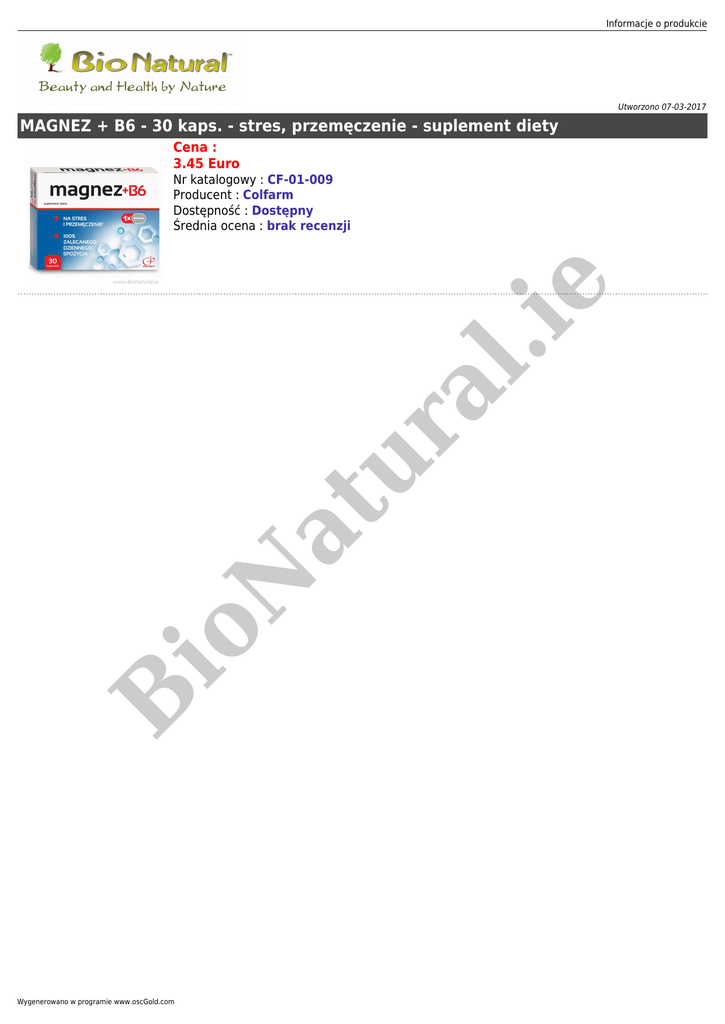 Informacje o produkcie Utworzono 07-03-2017 MAGNEZ + B6 - 30 kaps. - stres, przemęczenie - suplement diety Cena : 3.45 Euro B io N at ur al .ie Nr katalogowy : CF-01-009 Producent : Colfarm Dostępność : Dostępny Średnia ocena : brak recenzji Wygenerowano w programie www.oscGold.com Na stres i przemęczenie. 100% zalecanego dziennego spożycia. Tylko 1 kapsułka dziennie! Magnez przyczynia się do prawidłowego funkcjonowania mięśni, w tym mięśnia sercowego. Korzystnie wpływa na zachowanie równowagi elektrolitowej oraz wspomaga prawidłowe pozyskiwanie energii w procesach metabolicznych. Magnez pomaga w utrzymaniu zdrowych zębów i kości, przyczynia się również do prawidłowego przebiegu czynności psychicznych. Magnez z witaminą B6 wspomagają zmniejszenie uczucia zmęczenia znużenia. Opakowanie: 30 kapsułek Masa netto 1 kapsułki: 0,73g Składniki aktywne: w 1 kaps. % ZDS* Magnez 375 mg 100 % Witamina B6 1,4 mg 100 % .ie Składniki 1 kapsułka 1 raz dziennie, po posiłku. Przeciwwskazania: Środki bezpieczeństwa: N at Uczulenie na którykolwiek ze składników preparatu. ur Sposób użycia: al *ZDS - zalecane dzienne spożycie Przechowywać: w suchym, nienasłonecznionym miejscu, w temp. do 25°C Przechowywać w szczelnie zamkniętym opakowaniu, w miejscach niedostępnych dla dzieci. Nie przekraczać zalecanej dawki dziennej. Suplementy diety nie mogą być stosowane jako substytut zróżnicowanej diety. io Suplementy diety - preparaty zawierające niezbędne dla zdrowia i prawidłowego funkcjonowania organizmu składniki (witaminy, minerały i inne substancje egzogenne). Oferowane są w postaci skoncentrowanej - jako tabletki, kapsułki, proszek lub płyn. Nie leczą i nie zapobiegają chorobom. Jeśli zażywasz leki, zanim zaczniesz stosować suplement diety, zasięgnij porady lekarza lub farmaceuty. Niektóre połączenia mogą być bowiem niebezpieczne dla zdrowia. Firma NCI jest producentem i dystrybutorem preparatów ziołowych i kosmetyków. Nie leczymy i nie udzielamy porad medycznych. Informacje zawarte na naszej stronie internetowej mają charakter informacyjny i nie są poradami medycznymi. W razie problemów zdrowotnych należy skonsultować się z lekarzem lub farmaceutą. Nie wolno opierać się jedynie na suplementach i odrzucać klasyczne leki zalecane przez lekarzy. - B Informacje dodatkowe: Pochodzenie: Polska Najlepsze przed: 31/10/2016