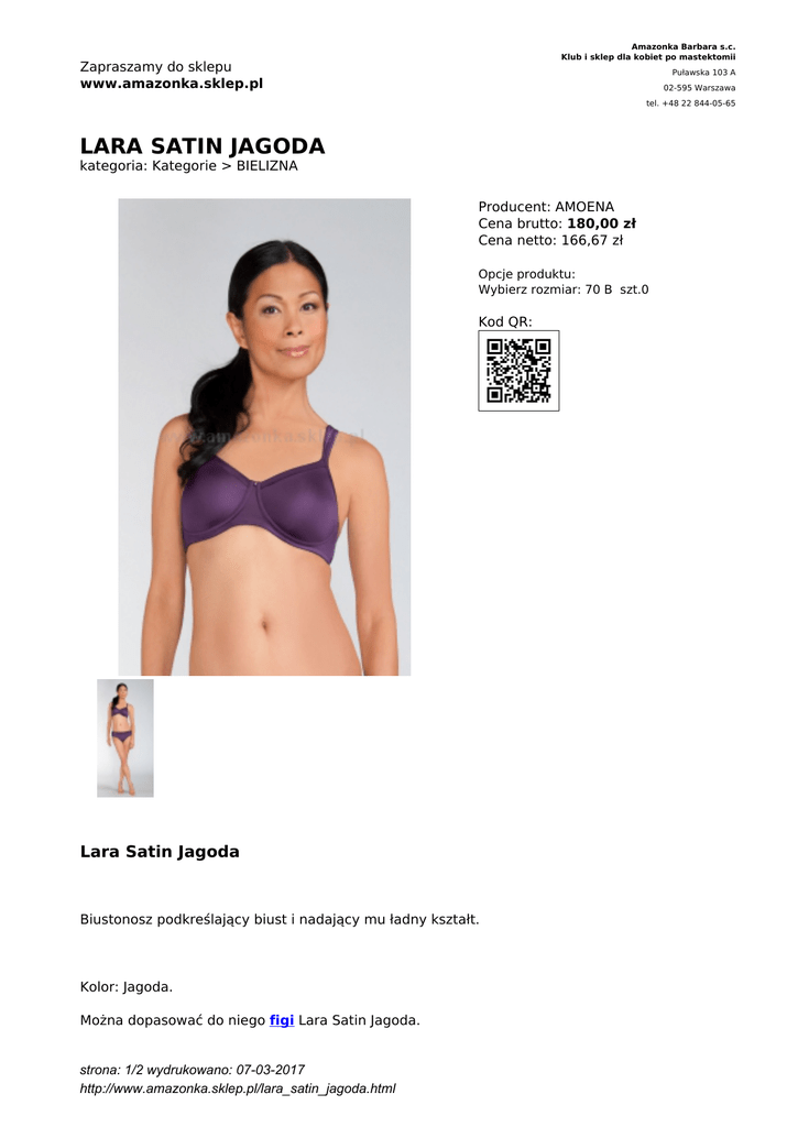 Amazonka Barbara s.c. Klub i sklep dla kobiet po mastektomii Zapraszamy do sklepu www.amazonka.sklep.pl Puławska 103 A 02-595 Warszawa tel. +48 22 844-05-65 LARA SATIN JAGODA kategoria: Kategorie > BIELIZNA Producent: AMOENA Cena brutto: 180,00 zł Cena netto: 166,67 zł Opcje produktu: Wybierz rozmiar: 70 B szt.0 Kod QR: Lara Satin Jagoda Biustonosz podkreślający biust i nadający mu ładny kształt. Kolor: Jagoda. Można dopasować do niego figi Lara Satin Jagoda. strona: 1/2 wydrukowano: 07-03-2017 http://www.amazonka.sklep.pl/lara_satin_jagoda.html - Profilowane , modelowane miseczki, - Obustronne kieszonki, - Bez fiszbin, - Ramiączka regulowane z tyłu Biustonosze z kieszonkami Amoena przywracają naturalny kształt, bezpiecznie utrzymują protezę, pomagając zaakceptować swój wygląd. Łączą dobry styl i wygodę, których oczekujesz od pięknej bielizny o przemyślanym wzornictwie zapewniającej całodzienny komfort. Wybierz biustonosz spośród niezawodnej kolekcji everyday i wspaniałych kompletów fashion. KOLEKCJA SEZONOWA - DO WYCZERPANIA ZAPASÓW ! strona: 2/2 wydrukowano: 07-03-2017 http://www.amazonka.sklep.pl/lara_satin_jagoda.html