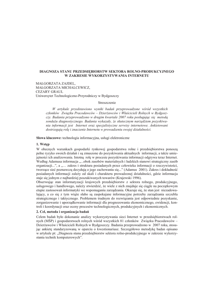 DIAGNOZA STANU PRZEDSIBIORSTW SEKTORA ROLNO-PRODUKCYJNEGO W ZAKRESIE WYKORZYSTYWANIA INTERNETU MAŁGORZATA ZAJDEL, MAŁGORZATA MICHALCEWICZ, CEZARY GRAUL Uniwersytet Technologiczno-Przyrodniczy w Bydgoszczy Streszczenie W artykule przedstawiono wyniki badaĔ przeprowadzone wĞród wszystkich członków Związku Pracodawców – DzierĪawców i WłaĞcicieli Rolnych w Bydgoszczy. Badania przeprowadzono w drugim kwartale 2007 roku posługując siĊ metodą sondaĪu diagnostycznego. Badania wykazały, Īe skutecznym narzĊdziem pozyskiwania informacji jest Internet oraz specjalistyczne serwisy internetowe. Ankietowani dostrzegają rolĊ i znaczenie Internetu w prowadzeniu swojej działalnoĞci. Słowa kluczowe: technologia informacyjna, usługi elektroniczne 1. Wstp W obecnych warunkach gospodarki rynkowej gospodarstwa rolne i przedsibiorstwa ponosz pełne ryzyko swoich działa i s zmuszone do pozyskiwania aktualnych informacji, a take umiejtnoci ich analizowania. Istotn rol w procesie pozyskiwania informacji odgrywa teraz Internet. Według Adamusa informacja „...obok zasobów materialnych i ludzkich stanowi strategiczny zasób organizacji...”, a „… zakres i struktura posiadanych przez człowieka informacji o rzeczywistoci, tworzce sie poznawcz decyduj o jego zachowaniu si...” (Adamus 2001). Zakres i dokładno posiadanych informacji zaley od skali i charakteru prowadzonej działalnoci, gdzie informacja staje si jednym z najbardziej poszukiwanych towarów (Krajewski 1996). Obserwujc stan informatyzacji krajowych przedsibiorstw z sektora rolnego, produkcyjnego, usługowego i handlowego, naley stwierdzi, e wiele z nich znajduje si cigle na pocztkowym etapie zastosowa informatyki we wspomaganiu zarzdzania. Okazuje si, e stan jest niezadowalajcy, a co si z tym wie słabo s zaspokajane informacyjne potrzeby zarzdzania szczebla strategicznego i taktycznego. Problemem trudnym do rozwizania jest odpowiednie pozyskanie, zorganizowanie i uporzdkowanie informacji dla prognozowania ekonomicznego, ewidencji, kontroli i koordynacji oraz oceny procesów technologicznych, produkcyjnych i ekonomicznych. 2. Cel, metoda i organizacja bada Celem bada było dokonanie analizy wykorzystywania sieci Internet w przedsibiorstwach rolnych (M P) i gospodarstwach rolnych wród wszystkich 81 członków Zwizku Pracodawców – Dzierawców i Włacicieli Rolnych w Bydgoszczy. Badania przeprowadzono w 2007 roku, stosujc ankiet standaryzowan w oparciu o kwestionariusz. Szczegółowo metodyk badan opisano w artykule pt: „Diagnoza stanu przedsibiorstw sektora rolno-produkcyjnego w zakresie wykorzystania technik komputerowych”. Małgorzata Zajdel, Małgorzata Michalcewicz, Cezary Graul Diagnoza stanu przedsiĊbiorstw sektora rolno-produkcyjnego w zakresie wykorzystywania Internetu 227 3. Wyniki bada Dokonujc analizy formy prawnej ankietowanych w aspekcie wielkoci gospodarstwa okazało si, i wród badanych dominowały spółki z o.o. (28,9%) i indywidualne gospodarstwa rolne (28,9%) wród gospodarstw o powierzchni od 300 do 1000 ha. Na drugim miejscu znalazły si równie w wikszoci spółki z o.o. w przedziale powyej 1000 ha powierzchni (tab. 1). Tabela 1. Forma prawna gospodarstwa rolnego, a jego wielkoĞü Forma prawna gospodarstwa rolnego Rolnik indywidualny Spółka z o.o. Spółdzielnia Gospodarstwo pomocnicze Do 300ha 5 2 0 0 Wielko gospodarstwa 300-1000ha Powyej 1000ha 11 2 11 6 0 0 1 0 ħródło: opracowanie własne Okazało si, e dostpno łcza internetowego odnotowano wród 35 gospodarstw i przedsibiorstw, co stanowi ponad 90% badanych. Oznacza to wic, e pomimo wczeniejszych trudnoci z uzyskaniem dostpu do Internetu na obszarach wiejskich obecnie sytuacja ta uległa znaczcej poprawie. Mona wic sdzi, i sami ankietowani dostrzegaj rol i znaczenie Internetu w prowadzeniu swojej działalnoci. Badanie wykazało, e ponad 60,5% respondentów korzysta z Internetu codziennie, 23,7% kilka razy w tygodniu, a grupa 5,3% ankietowanych wcale nie korzysta z Internetu. Jeli wzi pod uwag, e 8% ankietowanych nie posiada dostpu do Internetu to w/w grupa osób moe nie korzysta z Internetu włanie z braku łcza internetowego. (rys. 1). 228 POLSKIE STOWARZYSZENIE ZARZĄDZANIA WIEDZĄ Seria: Studia i Materiały, nr 10, 2007 Intensywno wykorzystywania Internetu przez kadr zarzdzajc 5,30% wcale raz w miesicu 0% kilka razy w miesicu 0% raz w tygodniu 10,50% kilka razy w tygodniu 23,70% codziennie 60,50% 0,00% 10,00 % 20,00 % 30,00 40,00 % % 50,00 % 60,00 % 70,00 % Rysunek 1 IntensywnoĞü wykorzystania Internetu ħródło: opracowanie własne Jeli chodzi o główny cel wykorzystywania Internetu, to badani najczciej wykorzystuj Internet w celu wyszukiwania informacji – 81,6%, nastpnie do pobierania dokumentów - 73,1 %, wysyłania i odbierania korespondencji – 73,1%, do obsługi operacji bankowych 71,1% i do biecej komunikacji 21,1%. Wykorzystywanie Internetu 90,00% 80,00% 70,00% 60,00% 50,00% 40,00% 30,00% 20,00% 10,00% 0,00% 81,60% 73,70% 71,10% 73,70% 21,10% w celu wysyłania i wyszukiwania informacji odbierania korespondencji w celu biecej komunikacji za pomoc komunikatorów do obsługi bankowej do pobierania dokumentów, wniosków, formularzy Rysunek 2. Cele wykorzystywania Internetu. ħródło: opracowanie własne Małgorzata Zajdel, Małgorzata Michalcewicz, Cezary Graul Diagnoza stanu przedsiĊbiorstw sektora rolno-produkcyjnego w zakresie wykorzystywania Internetu 229 Z analizy wynika, e najwiksz rol Internet odgrywa jako ródło aktualnych informacji, zgodnie z wczeniejsz diagnoz. Idea wiadczenia usług informacyjnych dla członków Zwizku poprzez stron internetow oraz list mailingow wydaje si by trafn odpowiedzi na potrzeby przedsibiorstw i gospodarstw rolnych. (rys.2). Badani respondenci wykazali bardzo due zainteresowanie otrzymywaniem od Zwizku biecych informacji przydatnych w ich działalnoci za porednictwem poczty elektronicznej. Grupa 82% ankietowanych jest tak form usługi zainteresowana, a tylko 18% nie wyrazi