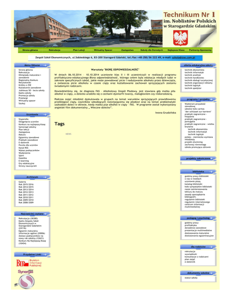 Strona główna Rekrutacja Plan Lekcji Wirtualny Spacer Zastępstwa Szkoły dla Dorosłych Najlepsza Klasa Partnerzy-Sponsorzy Zespół Szkół Ekonomicznych, ul.Sobieskiego 6, 83-200 Starogard Gdański, tel./fax +48 (58) 56 222 49, e-mail: [email protected] Menu Główne Strona główna Rekrutacja Olimpiady maturalne i zawodowe Regionalny Konkurs Recytatorski Krótko o ZSE Kształcenie zawodowe Jubileusz 50 - lecia szkoły Kadra szkoły Promocja szkoły Przetargi Wirtualny spacer Szukaj oferta edukacyjna szkoły Warsztaty "BIORĘ ODPOWIEDZIALNOŚĆ" W dniach 06.10.2014 – 10.10.2014 uczniowie klas II i III uczestniczyli w realizacji programu profilaktyczno-edukacyjnego Biorę odpowiedzialność, którego celem była edukacja młodych ludzi w zakresie specyficznych szkód, jakie może powodować picie i nadużywanie alkoholu przez dziewczęta, a zwłaszcza picie alkoholu w czasie ciąży oraz kształtowanie zachowań sprzyjających zostaniu świadomymi rodzicami. ekonomista informatyk analityk handlowiec obsługi turystycznej organizacji reklamy logistyk spedytor Dowiedzieliśmy się, że diagnoza FAS – Alkoholowy Zespół Płodowy, jest stawiana gdy matka piła alkohol w ciąży, a dziecko urodziło się z cechami dysmorfii twarzy, małogłowiem czy niskorosłością. Podczas zajęć młodzież dyskutowała w grupach na temat warunków sprzyjających prawidłowemu przebiegowi ciąży, czynników szkodzących rozwijającemu się płodowi oraz na temat problematyki uszkodzeń dzieci w okresie, kiedy matka pije alkohol w ciąży – FAS. W programie został wykorzystany angielski film dokumentalny „ Wieczne dziecko”. Iwona Grudzińska Uczniowie Stypendia Osiągnięcia uczniów Konkurs na najlepszą klasę Samorząd szkolny Plan lekcji Zastępstwa Matura Egzaminy zawodowe Praktyki zawodowe E-dziennik Poczta dla uczniów Kanał RSS Wykaz podręczników Wydarzenia Sport Gazetka E-learning Gry edukacyjne Strony nauczycieli technik technik technik technik technik technik technik technik Tags NEWS programy i projekty Wybieram przyszłość zawodową szkolne koło caritas "der schlüssel zur karriere" praktyki zagraniczne hiszpania praktyki zagraniczne portugalia praktyki zagraniczne - wielka brytania technik ekonomista technik informatyk technik logistyk polsko - niemiecka wymiana młodzieży projekt etwinning zachowaj równowagę szkoła promująca zdrowie projekty zakończone biblioteka Archiwum Galeria Rok 2015/2016 Rok 2014/2015 Rok 2013/2014 Rok 2012/2013 Rok 2011/2012 Rok 2010/2011 Rok 2009/2010 Rok 2008/2009 godziny pracy biblioteki o nas w mediach uczniowie piszą katalog biblioteki koło sympatyków biblioteki nasze zainteresowania lektury do matury zasady sporządzania bibliografii. regulamin biblioteki regulamin internetowego centrum informacji multimedialnej Najczęściej czytane Rekrutacja (38380) Kadra Zespołu Szkół Ekonomicznych w Starogardzie Gdańskim (24116) Egzamin maturalny informacje ogólne (20006) Zestaw podręczników na nowy rok szkolny (12621) Konkurs Na Najlepszą Klasę (10454) pedagog i psycholog godziny pracy profilaktyka doradztwo zawodowe prezentacje multimedialne dostosowania maturalne dostosowania egzaminacyjne dla rodziców Przydatne Linki rekrutacja wywiadówki konsultacje z rodzicami plan zajęć e-dziennik dokumenty szkolne statut szkoły liczba odwiedzin odwiedziło nas: 2676449 imieniny Flicyty, Kajetana, Pauli Do końca roku szkolnego pozostało 107 dni. przydatne linki europejski fundusz społeczny Zespół Szkół Ekonomicznych ul.Sobieskiego 6 83-200 Starogard Gdański tel./fax +48 (58) 56 222 49 e-mail: [email protected] Czas generowania strony: 0.021s.