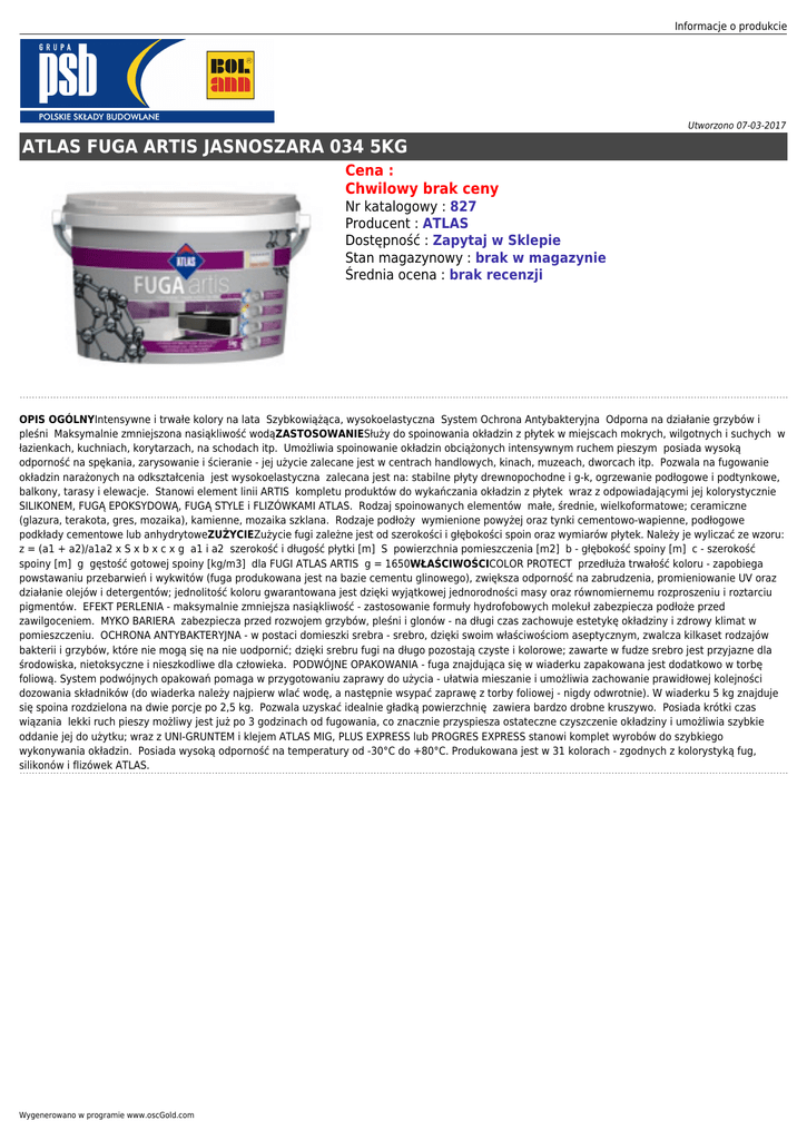 Informacje o produkcie Utworzono 07-03-2017 ATLAS FUGA ARTIS JASNOSZARA 034 5KG Cena : Chwilowy brak ceny Nr katalogowy : 827 Producent : ATLAS Dostępność : Zapytaj w Sklepie Stan magazynowy : brak w magazynie Średnia ocena : brak recenzji OPIS OGÓLNYIntensywne i trwałe kolory na lata Szybkowiążąca, wysokoelastyczna System Ochrona Antybakteryjna Odporna na działanie grzybów i pleśni Maksymalnie zmniejszona nasiąkliwość wodąZASTOSOWANIESłuży do spoinowania okładzin z płytek w miejscach mokrych, wilgotnych i suchych w łazienkach, kuchniach, korytarzach, na schodach itp. Umożliwia spoinowanie okładzin obciążonych intensywnym ruchem pieszym posiada wysoką odporność na spękania, zarysowanie i ścieranie - jej użycie zalecane jest w centrach handlowych, kinach, muzeach, dworcach itp. Pozwala na fugowanie okładzin narażonych na odkształcenia jest wysokoelastyczna zalecana jest na: stabilne płyty drewnopochodne i g-k, ogrzewanie podłogowe i podtynkowe, balkony, tarasy i elewacje. Stanowi element linii ARTIS kompletu produktów do wykańczania okładzin z płytek wraz z odpowiadającymi jej kolorystycznie SILIKONEM, FUGĄ EPOKSYDOWĄ, FUGĄ STYLE i FLIZÓWKAMI ATLAS. Rodzaj spoinowanych elementów małe, średnie, wielkoformatowe; ceramiczne (glazura, terakota, gres, mozaika), kamienne, mozaika szklana. Rodzaje podłoży wymienione powyżej oraz tynki cementowo-wapienne, podłogowe podkłady cementowe lub anhydrytoweZUŻYCIEZużycie fugi zależne jest od szerokości i głębokości spoin oraz wymiarów płytek. Należy je wyliczać ze wzoru: z = (a1 + a2)/a1a2 x S x b x c x g a1 i a2 szerokość i długość płytki [m] S powierzchnia pomieszczenia [m2] b - głębokość spoiny [m] c - szerokość spoiny [m] g gęstość gotowej spoiny [kg/m3] dla FUGI ATLAS ARTIS g = 1650WŁAŚCIWOŚCICOLOR PROTECT przedłuża trwałość koloru - zapobiega powstawaniu przebarwień i wykwitów (fuga produkowana jest na bazie cementu glinowego), zwiększa odporność na zabrudzenia, promieniowanie UV oraz działanie olejów i detergentów; jednolitość koloru gwarantowana jest dzięki wyjątkowej jednorodności masy oraz równomiernemu rozproszeniu i roztarciu pigmentów. EFEKT PERLENIA - maksymalnie zmniejsza nasiąkliwość - zastosowanie formuły hydrofobowych molekuł zabezpiecza podłoże przed zawilgoceniem. MYKO BARIERA zabezpiecza przed rozwojem grzybów, pleśni i glonów - na długi czas zachowuje estetykę okładziny i zdrowy klimat w pomieszczeniu. OCHRONA ANTYBAKTERYJNA - w postaci domieszki srebra - srebro, dzięki swoim właściwościom aseptycznym, zwalcza kilkaset rodzajów bakterii i grzybów, które nie mogą się na nie uodpornić; dzięki srebru fugi na długo pozostają czyste i kolorowe; zawarte w fudze srebro jest przyjazne dla środowiska, nietoksyczne i nieszkodliwe dla człowieka. PODWÓJNE OPAKOWANIA - fuga znajdująca się w wiaderku zapakowana jest dodatkowo w torbę foliową. System podwójnych opakowań pomaga w przygotowaniu zaprawy do użycia - ułatwia mieszanie i umożliwia zachowanie prawidłowej kolejności dozowania składników (do wiaderka należy najpierw wlać wodę, a następnie wsypać zaprawę z torby foliowej - nigdy odwrotnie). W wiaderku 5 kg znajduje się spoina rozdzielona na dwie porcje po 2,5 kg. Pozwala uzyskać idealnie gładką powierzchnię zawiera bardzo drobne kruszywo. Posiada krótki czas wiązania lekki ruch pieszy możliwy jest już po 3 godzinach od fugowania, co znacznie przyspiesza ostateczne czyszczenie okładziny i umożliwia szybkie oddanie jej do użytku; wraz z UNI-GRUNTEM i klejem ATLAS MIG, PLUS EXPRESS lub PROGRES EXPRESS stanowi komplet wyrobów do szybkiego wykonywania okładzin. Posiada wysoką odporność na temperatury od -30°C do +80°C. Produkowana jest w 31 kolorach - zgodnych z kolorystyką fug, silikonów i flizówek ATLAS. Wygenerowano w programie www.oscGold.com