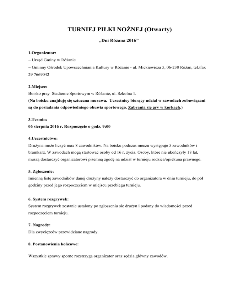TURNIEJ PIŁKI NOŻNEJ (Otwarty) „Dni Różana 2016” 1.Organizator: Urząd Gminy w Różanie Gminny Ośrodek Upowszechniania Kultury w Różanie - ul. Mickiewicza 5, 06-230 Różan, tel./fax 29 7669042 2.Miejsce: Boisko przy Stadionie Sportowym w Różanie, ul. Szkolna 1. (Na boisku znajduję się sztuczna murawa. Uczestnicy biorący udział w zawodach zobowiązani są do posiadania odpowiedniego obuwia sportowego. Zabrania się gry w korkach.) 3.Termin: 06 sierpnia 2016 r. Rozpoczęcie o godz. 9:00 4.Uczestnictwo: Drużyna może liczyć max 8 zawodników. Na boisku podczas meczu występuje 5 zawodników i bramkarz. W zawodach mogą startować osoby od 16 r. życia. Osoby, które nie ukończyły 18 lat, muszą dostarczyć organizatorowi pisemną zgodę na udział w turnieju rodzica/opiekuna prawnego. 5. Zgłoszenie: Imienną listę zawodników danej drużyny należy dostarczyć do organizatora w dniu turnieju, do pół godziny przed jego rozpoczęciem w miejscu przebiegu turnieju. 6. System rozgrywek: System rozgrywek zostanie ustalony po zgłoszeniu się drużyn i podany do wiadomości przed rozpoczęciem turnieju. 7. Nagrody: Dla zwycięzców przewidziane nagrody. 8. Postanowienia końcowe: Wszystkie sprawy sporne rozstrzyga organizator oraz sędzia główny zawodów. Otwarty Turniej Piłki Nożnej o Puchar Burmistrza Gminy Różan. Karta uczestnictwa Nazwa drużyny: Lp. Nazwisko i Imię Data urodzenia Podpis 1. 2. 3. 4. 5. 6. 7. 8. Własnoręcznymi podpisami oświadczamy, że nie mamy żadnych przeciwwskazań zdrowotnych do OTWARTEGO TURNIEJU PIŁKI NOŻNEJ rozgrywanego w ramach „Dni Różana 2016”, akceptujemy i zobowiązujemy się przestrzegać regulaminu turnieju. OTWARTY TURNIEJ PIŁKI NOŻNEJ o Puchar Burmistrza Gminy Różan. Oświadczenie rodziców/opiekunów prawnych zawodników uczestniczących w otwartym turnieju piłki nożnej Jako rodzic/opiekun prawny zawodnika uczestniczącego w Otwartym Turnieju Piłki Nożnej rozgrywanym w ramach „Dni Różana 2016” w dniu 06.08.2016r.: oświadczam, że znane są mi warunki uczestnictwa oraz zasady jego rozgrywania. Po zapoznaniu się z nimi wyrażam zgodę na uczestnictwo mojego dziecka/podopiecznego, który nie ma przeciwwskazań zdrowotnych do udziału w tego typu imprezie. Lp. Nazwisko i Imię rodzica/opiekuna prawnego Nr. dowodu osobistego Podpis 1.