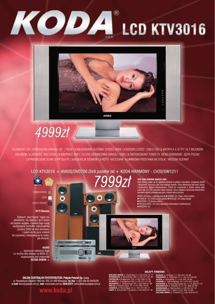 TELEWIZOR LCD m PRZEKĄTNA EKRANU: 30” / 76CM m WBUDOWANE GŁOŚNIKI: STEREO 2X6W m ROZDZIELCZOŚĆ: 1280 X 768 m MATRYCA A-SI TFT 16.7 MILIONÓW KOLORÓW m JASNOŚĆ: 550 CD/M2 m KONTRAST: 600:1 m CZAS ODŚWIEŻANIA OBRAZU: 16MS m ZINTEGROWANY TUNER TV MENU EKRANOWE: JĘZYK POLSKI m PROGRESSIVE SCAN m PIP DLA PC m REDUKCJA SZUMÓW m HDTV AKCESORIA: ALUMINIOWA PODSTAWA NA STOLIK / WIESZAK ŚCIENNY CIEMNA WIŚNIA KLON ORZECH RÓŻANY TEST KINO DOMOWE MARZEC 2005 Koda dobrze nadaje się do oglądania telewizji w polskich warunkach. Urządzenie potrafi „zatuszować” znaczną część wad słabego sygnału. Obraz telewizyjny jest dość spójny i pozbawiony istotnej pikselowatości. Trzeba też wspomnieć o bardzo dobrej głębi czerni (jak na LCD] i szerokim kącie widzenia. Obraz oglądany nawet pod ekstremalnie szerokimi kątami prezentowany jest z równie dobrą jakością. OBRAZ 4/5 Dobry, z głęboką czernią l DŹWIĘK 2/5 Płaski, mało czytelny l FUNKCJE 4/5 Zadowalający zestaw l WYGLĄD 5/5 Udany design l BUDOWA 5/5 Bardzo solidna l OPŁACALNOŚĆ 5/5 Cena odpowiada oferowanym możliwościom l WERDYKT 4/5 HI-FI Muzyka Żadnych „best bajów” nigdy nic dawaliśmy, nie dajemy i tym razem nie będzie wyjątku. Zamiast tego użyję następującej formułki- najrozsądniej wydane 5000 na kino domowe, z jakim do tej pory miałem do czynienia.! interpretujcie to sobie, jak chcecie. AUDIO „... wyznacza maximum tego co można dziś zdobyć za 8000 zł... wyposażenie jest znakomite OCENA DOBRA + SKLEPY FIRMOWE: SALON CENTRALNY/DYSTRYBUTOR: Polpak Poland Sp. z o.o. ul. Powstańcow Śląskich 106D lok. 203, 01-466 Warszawa, tel./fax: (+22) 436-02-04/05/06 e-mail: [email protected], web: www.koda.com.pl, DEALERZY: www.dealerzy.polpak.com.pl www.koda.pl BIELSKO-BIAŁA ul. Cyniarska 4 (+33) 816-75-75 BYDGOSZCZ ul. Fordońska 16B (+52) 371-84-22 CHORZÓW ul.Katowicka 154 (+32) 246-01-56 GLIWICE ul. Zwycięstwa 52A (+32) 231-27-89 KATOWICE ul. Słowackiego 39 (+32) 206-81-99 KIELCE ul.Sienkiewicza 44 (+41) 368-19-03 LEGNICA ul.Piłsudskiego 44 (+76) 721-05-11 ŁÓDŹ al. Kościuszki 1 (I piętro) (+42) 630-57-18 OLKUSZ ul. Krzywa 1 (+32) 641-24-80 PABIANICE ul. Zamkowa 37 (+42) 213-00-06 PŁOCK ul. Kolegialna 1 (+24) 262-78-95 POZNAŃ ul. Dąbrowskiego 40 (+61) 847-26-63 RZESZÓW al. Krzyżanowskiego 6c (+17) 858-61-47 WAŁBRZYCH ul. Główna 10 (+74) 666-20-66 WARSZAWA ul. Bartnicza 4 (+22) 814-37-10 WROCŁAW Plac 1 Maja (+71) 344-12-00 ZIELONA GÓRA ul. Chopina 7 (+68) 453-23-07
