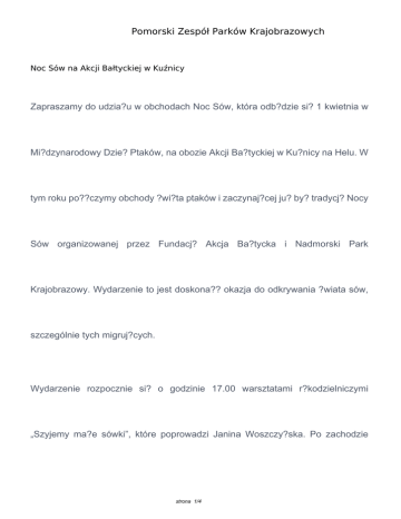 Pomorski Zespół Parków Krajobrazowych Noc Sów na Akcji Bałtyckiej w Kuźnicy Zapraszamy do udzia?u w obchodach Noc Sów, która odb?dzie si? 1 kwietnia w Mi?dzynarodowy Dzie? Ptaków, na obozie Akcji Ba?tyckiej w Ku?nicy na Helu. W tym roku po??czymy obchody ?wi?ta ptaków i zaczynaj?cej ju? by? tradycj? Nocy Sów organizowanej przez Fundacj? Akcja Ba?tycka i Nadmorski Park Krajobrazowy. Wydarzenie to jest doskona?? okazja do odkrywania ?wiata sów, szczególnie tych migruj?cych. Wydarzenie rozpocznie si? o godzinie 17.00 warsztatami r?kodzielniczymi „Szyjemy ma?e sówki”, które poprowadzi Janina Woszczy?ska. Po zachodzie strona 1/4 s?o?ca rozpoczniemy wspólne kontrolowanie sowich sieci (od 20:00 do 5:00), natomiast pomi?dzy obchodami zasi?dziemy przy ognisku, by pos?ucha? opowie?ci o migracji tych nocnych ptaków i o metodach ich bada?. O godzinie 21.30 zapraszamy na le?ny pokaz filmu pt. „P?omykówka – sowa z s?siedztwa”. Poka?emy Wam sowie pióra i na ich podstawie nauczymy Was odró?nia? poszczególne gatunki. W Nocy Sów mo?na wzi?? udzia? o dowolnej godzinie. Nale?y zabra? ze sob? latarki – najlepiej czo?ówki, w?asny prowiant na ognisko i dobry humor. strona 2/4 Polecamy równie? zabranie w?asnych karimat do siedzenia przy ognisku. Uwaga! Ka?dy kto zawita w naszym obozie w sowiej masce lub przebraniu otrzyma od nas ma?y upominek :) Zg?oszenia na wydarzenie prosimy wysy?a? na adres [email protected], liczba miejsc jest ograniczona. Osoba do kontaktów: Justyna Szulc, tel. 792 932 820 strona 3/4 e-mail: strona 4/4 Powered by TCPDF (www.tcpdf.org)