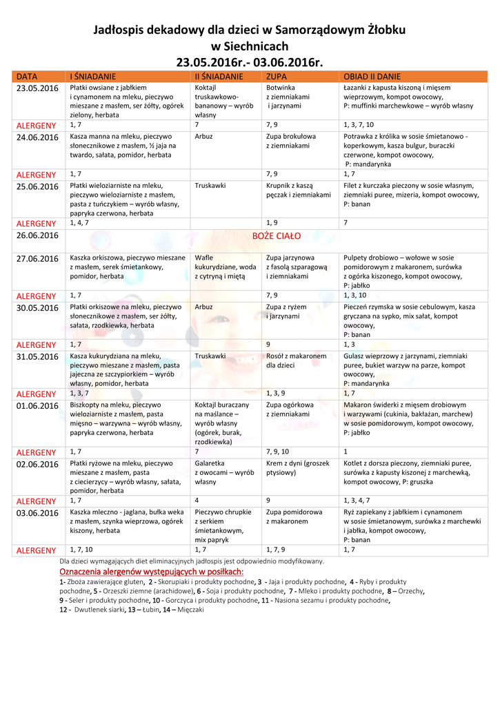 Jadłospis dekadowy dla dzieci w Samorządowym Żłobku w Siechnicach 23.05.2016r.- 03.06.2016r. DATA 23.05.2016 ALERGENY 24.06.2016 ALERGENY 25.06.2016 ALERGENY 26.06.2016 I ŚNIADANIE II ŚNIADANIE ZUPA OBIAD II DANIE Płatki owsiane z jabłkiem i cynamonem na mleku, pieczywo mieszane z masłem, ser żółty, ogórek zielony, herbata 1, 7 Koktajl truskawkowobananowy – wyrób własny 7 Botwinka z ziemniakami i jarzynami Łazanki z kapusta kiszoną i mięsem wieprzowym, kompot owocowy, P: muffinki marchewkowe – wyrób własny 7, 9 1, 3, 7, 10 Kasza manna na mleku, pieczywo słonecznikowe z masłem, ½ jaja na twardo, sałata, pomidor, herbata Arbuz Zupa brokułowa z ziemniakami Potrawka z królika w sosie śmietanowo koperkowym, kasza bulgur, buraczki czerwone, kompot owocowy, P: mandarynka 1, 7 1, 7 Płatki wieloziarniste na mleku, pieczywo wieloziarniste z masłem, pasta z tuńczykiem – wyrób własny, papryka czerwona, herbata 1, 4, 7 Kaszka orkiszowa, pieczywo mieszane z masłem, serek śmietankowy, pomidor, herbata ALERGENY 30.05.2016 1, 7 ALERGENY 31.05.2016 1, 7 ALERGENY 02.06.2016 ALERGENY 03.06.2016 ALERGENY Krupnik z kaszą pęczak i ziemniakami Filet z kurczaka pieczony w sosie własnym, ziemniaki puree, mizeria, kompot owocowy, P: banan 1, 9 7 BOŻE CIAŁO 27.06.2016 ALERGENY 01.06.2016 7, 9 Truskawki Płatki orkiszowe na mleku, pieczywo słonecznikowe z masłem, ser żółty, sałata, rzodkiewka, herbata Wafle kukurydziane, woda z cytryną i miętą Zupa jarzynowa z fasolą szparagową i ziemniakami 7, 9 Arbuz Zupa z ryżem i jarzynami 9 Pieczeń rzymska w sosie cebulowym, kasza gryczana na sypko, mix sałat, kompot owocowy, P: banan 1, 3 Kasza kukurydziana na mleku, pieczywo mieszane z masłem, pasta jajeczna ze szczypiorkiem – wyrób własny, pomidor, herbata 1, 3, 7 Truskawki Biszkopty na mleku, pieczywo wieloziarniste z masłem, pasta mięsno – warzywna – wyrób własny, papryka czerwona, herbata Koktajl buraczany na maślance – wyrób własny (ogórek, burak, rzodkiewka) 7 Zupa ogórkowa z ziemniakami Makaron świderki z mięsem drobiowym i warzywami (cukinia, bakłażan, marchew) w sosie pomidorowym, kompot owocowy, P: jabłko 7, 9, 10 1 Płatki ryżowe na mleku, pieczywo mieszane z masłem, pasta z ciecierzycy – wyrób własny, sałata, pomidor, herbata 1, 7 Galaretka z owocami – wyrób własny Krem z dyni (groszek ptysiowy) Kotlet z dorsza pieczony, ziemniaki puree, surówka z kapusty kiszonej z marchewką, kompot owocowy, P: gruszka 4 9 1, 3, 4, 7 Kaszka mleczno - jaglana, bułka weka z masłem, szynka wieprzowa, ogórek kiszony, herbata Pieczywo chrupkie z serkiem śmietankowym, mix papryk 1, 7 Zupa pomidorowa z makaronem Ryż zapiekany z jabłkiem i cynamonem w sosie śmietanowym, surówka z marchewki i jabłka, kompot owocowy, P: banan 1, 7 1, 7 1, 7, 10 Rosół z makaronem dla dzieci Pulpety drobiowo – wołowe w sosie pomidorowym z makaronem, surówka z ogórka kiszonego, kompot owocowy, P: jabłko 1, 3, 10 1, 3, 9 1, 7, 9 Gulasz wieprzowy z jarzynami, ziemniaki puree, bukiet warzyw na parze, kompot owocowy, P: mandarynka 1, 7 Dla dzieci wymagających diet eliminacyjnych jadłospis jest odpowiednio modyfikowany. Oznaczenia alergenów występujących w posiłkach: 1- Zboża zawierające gluten, 2 - Skorupiaki i produkty pochodne, 3 - Jaja i produkty pochodne, 4 - Ryby i produkty pochodne, 5 - Orzeszki ziemne (arachidowe), 6 - Soja i produkty pochodne, 7 - Mleko i produkty pochodne, 8 – Orzechy, 9 - Seler i produkty pochodne, 10 - Gorczyca i produkty pochodne, 11 - Nasiona sezamu i produkty pochodne, 12 - Dwutlenek siarki, 13 – Łubin, 14 – Mięczaki