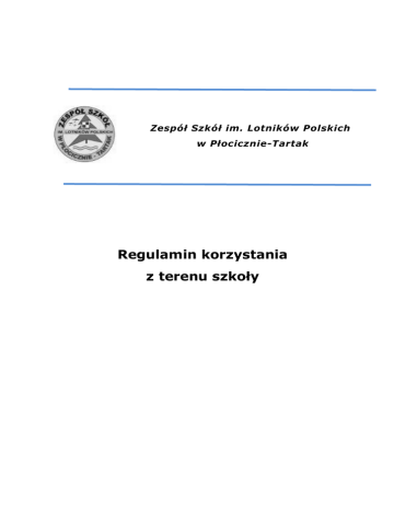 Zespół Szkół im. Lotników Polskich w Płocicznie-Tartak Regulamin korzystania z terenu szkoły 1. Teren szkoły obejmuje boisko szkolne, plac zabaw, siłownię zewnętrzną, teren przyszkolny i jest objęty monitoringiem wizyjnym 2. Przed rozpoczęciem zajęć lekcyjnych i po ich zakończeniu szkoła nie ponosi odpowiedzialności za bezpieczeństwo uczniów znajdujących się na terenie szkoły. Po zakończeniu zajęć przebywający na boisku szkolnym i korzystający z siłowni zewnętrznej czynią to na własną odpowiedzialność i własne ryzyko. 3. Za bezpieczeństwo uczniów podczas przerw odpowiadają nauczyciele dyżurujący. 4. Podczas zajęć szkolnych w tym świetlicy (w godzinach od 6.30 do 15.30) boisko i teren szkoły przeznaczone są wyłącznie dla uczniów korzystających z zajęć szkolnych pod opieką nauczycieli. Pozostałe osoby mogą przebywać na terenie przyszkolnym wyłącznie za zgodą dyrekcji szkoły. 5. Korzystanie z obiektów na terenie szkoły dla osób postronnych możliwe jest wyłącznie po uprzednim uzgodnieniu z dyrekcją szkoły. 6. Dzieci do lat 12 mogą przebywać na boisku szkolnym, siłowni zewnętrznej wyłącznie pod opieką osób dorosłych. 7. Na terenie szkoły zabrania się: a) wprowadzania osób trzecich, b) wprowadzania psów, kotów i innych zwierząt, c) przebywania osobom pod wpływem alkoholu lub pod działaniem innych środków odurzających, d) stwarzania sytuacji zagrażających zdrowiu i życiu, palenia papierosów, spożywania napojów alkoholowych, e) palenia ognisk bez zezwolenia dyrektora, f) niszczenia mienia szkoły (za wszelkie uszkodzenia odpowiada materialnie osoba, która wyrządziła szkodę lub jej prawni opiekunowie), g) niszczenia zieleni i zaśmiecania terenu, h) wulgarnego zachowania, i) jakichkolwiek transakcji handlowych między uczniami, j) przynoszenia niebezpiecznych przedmiotów np. petard, ostrych narzędzi, laserów, k) fotografowania i nagrywania pracowników oraz uczniów bez ich wyraźnej zgody, l) wjeżdżania na boisko tartanowe pojazdami zmechanizowanymi (rowery, skutery, kłady itp.). 8. Dyrektor szkoły nie odpowiada za wypadki osób, które korzystają z terenu szkoły w dniach wolnych od zajęć szkolnych (wakacje, ferie, przerwy świąteczne, dni wolne od zajęć szkolnych ) i poza godzinami otwarcia placówki. 9. Osoby przebywające na terenie szkoły zobowiązane są do zachowania porządku przestrzegania powyższego regulaminu. W przypadku naruszania jego postanowień będą pociągnięci do odpowiedzialności prawno - administracyjnej. Regulamin wchodzi w życie z dniem 1 września 2016 roku