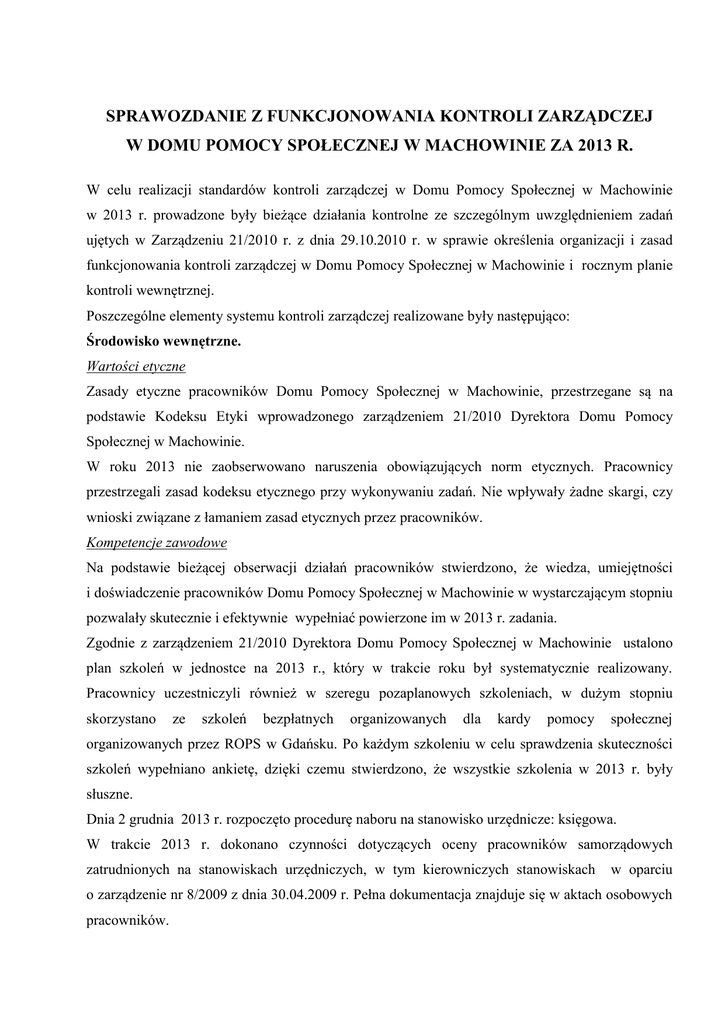 SPRAWOZDANIE Z FUNKCJONOWANIA KONTROLI ZARZĄDCZEJ W DOMU POMOCY SPOŁECZNEJ W MACHOWINIE ZA 2013 R. W celu realizacji standardów kontroli zarządczej w Domu Pomocy Społecznej w Machowinie w 2013 r. prowadzone były bieżące działania kontrolne ze szczególnym uwzględnieniem zadań ujętych w Zarządzeniu 21/2010 r. z dnia 29.10.2010 r. w sprawie określenia organizacji i zasad funkcjonowania kontroli zarządczej w Domu Pomocy Społecznej w Machowinie i rocznym planie kontroli wewnętrznej. Poszczególne elementy systemu kontroli zarządczej realizowane były następująco: Środowisko wewnętrzne. Wartości etyczne Zasady etyczne pracowników Domu Pomocy Społecznej w Machowinie, przestrzegane są na podstawie Kodeksu Etyki wprowadzonego zarządzeniem 21/2010 Dyrektora Domu Pomocy Społecznej w Machowinie. W roku 2013 nie zaobserwowano naruszenia obowiązujących norm etycznych. Pracownicy przestrzegali zasad kodeksu etycznego przy wykonywaniu zadań. Nie wpływały żadne skargi, czy wnioski związane z łamaniem zasad etycznych przez pracowników. Kompetencje zawodowe Na podstawie bieżącej obserwacji działań pracowników stwierdzono, że wiedza, umiejętności i doświadczenie pracowników Domu Pomocy Społecznej w Machowinie w wystarczającym stopniu pozwalały skutecznie i efektywnie wypełniać powierzone im w 2013 r. zadania. Zgodnie z zarządzeniem 21/2010 Dyrektora Domu Pomocy Społecznej w Machowinie ustalono plan szkoleń w jednostce na 2013 r., który w trakcie roku był systematycznie realizowany. Pracownicy uczestniczyli również w szeregu pozaplanowych szkoleniach, w dużym stopniu skorzystano ze szkoleń bezpłatnych organizowanych dla kardy pomocy społecznej organizowanych przez ROPS w Gdańsku. Po każdym szkoleniu w celu sprawdzenia skuteczności szkoleń wypełniano ankietę, dzięki czemu stwierdzono, że wszystkie szkolenia w 2013 r. były słuszne. Dnia 2 grudnia 2013 r. rozpoczęto procedurę naboru na stanowisko urzędnicze: księgowa. W trakcie 2013 r. dokonano czynności dotyczących oceny pracowników samorządowych zatrudnionych na stanowiskach urzędniczych, w tym kierowniczych stanowiskach w oparciu o zarządzenie nr 8/2009 z dnia 30.04.2009 r. Pełna dokumentacja znajduje się w aktach osobowych pracowników. Struktura organizacyjna i delegowanie uprawnień Struktura organizacyjna jest dostosowana do aktualnych zadań jednostki, zakresy znajdują się w aktach osobowych pracowników. Powierzenie uprawnień i odpowiedzialności dokonywane jest w formie pisemnej i potwierdzone podpisem pracownika. W okresie sprawozdawczym Dyrektor Domu Pomocy Społecznej w Machowinie wydał 20 upoważnień w tym 10 upoważnień do przeprowadzenia kontroli wewnętrznych w jednostce pozostałe dotyczyły m.in. ochrony danych osobowych. Cele i zarządzanie ryzykiem Misja jednostek, określenie celów i zadań, monitorowanie i ocena ich realizacji Cele i zadania określone są w Regulaminie Organizacyjnym jednostki oraz wyszczególnione w zarządzeniu nr 21/2010 Dyrektora Domu Pomocy Społecznej w Machowinie. Realizacja zadań znajduje odzwierciedlenie w sprawozdawczości budżetowej, finansowej oraz opisowej z działalności jednostki. W celu zapewnienia realizacji zadań w sposób zgodny z prawem, efektywny i terminowy w Domu Pomocy Społecznej w Machowinie w 2013 r. prowadzone były bieżące działania kontrolne określone w rocznym planie kontroli wewnętrznej wprowadzonej zarządzeniem nr 35/2012 Dyrektora Domu Pomocy Społecznej w Machowinie. Identyfikacja i analiza ryzyka Harmonogram ryzyka w DPS w Machowinie określa zarządzenie nr 21/2010 z dnia 29.10.2010 r. w sprawie określenia organizacji i zasad funkcjonowania kontroli zarządczej w Domu Pomocy Społecznej w Machowinie. Przy identyfikacji ryzyka w 2013 r. w DPS w Machowinie były czynniki sprzyjające wystąpieniu ryzyka o charakterze organizacyjnym związane z warunkami atmosferycznymi i ekonomiczne, na 14 czynników ryzyka wskazanych w w/w dokumencie wystąpiło 6 ryzyk. Analiza i ocena ryzyka dokonana została przez pełnomocnika ds. zarządzania ryzykiem poprzez wypełnienie dokumentu pn. harmonogram ryzyka. Nie wystąpiła potrzeba podejmowania dodatkowych działań w celu zmniejszenia ryzyka gdyż te co wystąpiły były związane z warunkami atmosferycznymi nie zależnymi od jednostki i osób w niej pracujących. Mechanizmy kontroli Dokumentowanie kontroli zarządczej. Dokumentacja systemu kontroli zarządczej obejmuje wszystkie procedury, instrukcje, zakresy obowiązków, a także inne dokumenty. Prowadzony jest bieżący nadzór nad wykonaniem zadań jednostki w celu ich oszczędnej, efektywnej i skutecznej realizacji. Zarządzeniem nr 35/2012 r. wprowadzono harmonogram kontroli wewnętrznych w Domu Pomocy Społecznej w Machowinie, który w trakcie roku był systematycznie realizowany. W 2013 roku zrealizowano ogółem 11 kontroli wewnętrznych w tym 10 problemowych i 1 bieżąca. Nadzór, ciągłość działania i ochrona zasobów W 2013 roku podejmowane były działania zmierzające do zapewnienia ciągłości działalności w szczególności poprzez: a) zapewnienie bezpiecznych warunków na stanowisku pracy, b) ochronę dostępu do systemów informatycznych, c) ochronę mienia i jego wykorzystanie zgodnie z zasadami prawidłowej gospodarki, d) zabezpieczenie środków finansowych dla prawidłowej działalności jednostki Nie stwierdzono zaniedbań ze strony pracodawcy w zapewnieniu bezpieczeństwa warunków na stanowiskach pracy. W celu ochrony dostępu do systemów informatycznych oraz ochrony mienia wprowadzono w 2013 r. zarządzeniem nr 3/2013 Politykę Bezpieczeństwa Informacji i Instrukcję Zarządzania Systemem Informatycznym. Bieżący nadzór nad wykonywaniem zadań w wystarczającym stopniu zapewniał prowadzenie skutecznej działalności. Mechanizmy kontroli operacji finansowych i gospodarczych Szczegółowe zasady dotyczące prowadzenia, zatwierdzania, rejestrowania i sprawdzani