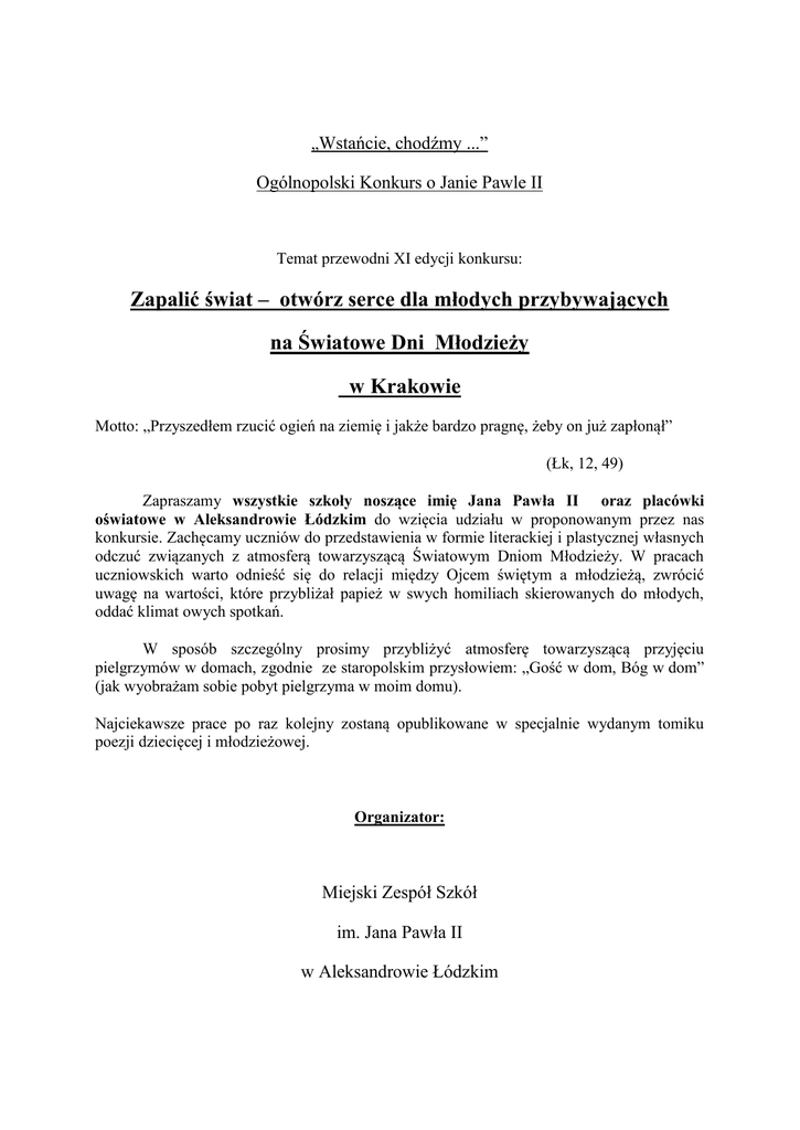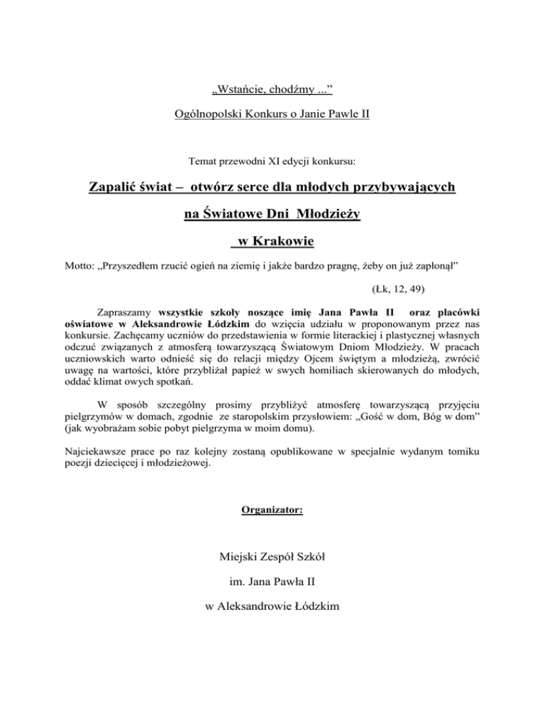 „Wstańcie, chodźmy ...” Ogólnopolski Konkurs o Janie Pawle II Temat przewodni XI edycji konkursu: Zapalić świat – otwórz serce dla młodych przybywających na Światowe Dni Młodzieży w Krakowie Motto: „Przyszedłem rzucić ogień na ziemię i jakże bardzo pragnę, żeby on już zapłonął” (Łk, 12, 49) Zapraszamy wszystkie szkoły noszące imię Jana Pawła II oraz placówki oświatowe w Aleksandrowie Łódzkim do wzięcia udziału w proponowanym przez nas konkursie. Zachęcamy uczniów do przedstawienia w formie literackiej i plastycznej własnych odczuć związanych z atmosferą towarzyszącą Światowym Dniom Młodzieży. W pracach uczniowskich warto odnieść się do relacji między Ojcem świętym a młodzieżą, zwrócić uwagę na wartości, które przybliżał papież w swych homiliach skierowanych do młodych, oddać klimat owych spotkań. W sposób szczególny prosimy przybliżyć atmosferę towarzyszącą przyjęciu pielgrzymów w domach, zgodnie ze staropolskim przysłowiem: „Gość w dom, Bóg w dom” (jak wyobrażam sobie pobyt pielgrzyma w moim domu). Najciekawsze prace po raz kolejny zostaną opublikowane w specjalnie wydanym tomiku poezji dziecięcej i młodzieżowej. Organizator: Miejski Zespół Szkół im. Jana Pawła II w Aleksandrowie Łódzkim Cele konkursu: wdrażanie w życie nauczania Jan Pawła II rozbudzanie aktywności twórczej u dzieci i młodzieży konfrontacja twórczości literackiej i plastycznej młodych doskonalenie umiejętności warsztatowych młodych uwrażliwianie na odbiór otaczającego świata Adresat konkursu: klasy IV – VI szkoły podstawowej klasy I – III gimnazjum szkoły ponadgimnazjalne Regulamin konkursu: konkurs przeprowadzony jest w dwóch kategoriach: literackiej i plastycznej zadaniem uczestnika jest stworzenie pracy związanej z tematem praca literacka może mieć formę wiersza lub krótkiej pracy prozatorskiej (kartka z pamiętnika, fragment opowiadania, listu) wypowiedź stylistyczna nie powinna przekraczać dwóch stron A4 praca plastyczna dla szkoły podstawowej: format pracy: A4 lub A3; dla gimnazjum: format A3 lub A2 technika pracy dowolna, bez wykorzystania materiałów sypkich praca nie powinna być wcześniej publikowana i udostępniana w danej kategorii można nadesłać trzy prace z jednej szkoły do wersji pisemnej w części literackiej należy dołączyć elektroniczną formę zapisu (płyta lub przesłanie pracy na adres szkoły w wersji elektronicznej); w przypadku pracy plastycznej wskazane jest przesłanie pracy w formie oryginalnej prace należy opisać: podać nazwę szkoły, imię i nazwisko ucznia, wiek, klasę, imię i nazwisko nauczyciela opiekuna wraz ze zgłoszeniem należy nadesłać zgodę na ewentualną publikację pracy lub jej fragmentów i udostępnienie danych osobowych ucznia na stronie internetowej organizatora konkursu (załącznik 1) prace należy przysłać na adres: Miejski Zespół Szkół im. Jana Pawła II ul. Waryńskiego 22/26 95-070 Aleksandrów Łódzki termin nadesłania prac: 15 kwietnia 2016 roku wyniki konkursu zostaną ogłoszone na stronie internetowej szkoły do końca kwietnia uroczyste podsumowanie konkursu nastąpi w maja w placówce organizatora. O szczegółowym podsumowaniu powiadomimy zainteresowane szkoły. Kryteria oceny prac stylistycznych i poetyckich: zawartość treściowa pracy i związek z tematem konkursu oryginalność przedstawienia problemu kompozycja kultura słowa wyraz artystyczny Kryteria oceny prac plastycznych: oryginalność ujęcia tematu estetyka wykonania Załącznik 1 Wyrażam zgodę na publikację pracy lub jej fragmentów oraz przetwarzanie i upublicznianie na stronie internetowej Miejskiego Zespołu Szkół im. Jana Pawła II w Aleksandrowie Łódzkim danych osobowych mojego dziecka ……………………………………………………………………………………. imię i nazwisko dziecka niezbędnych do organizacji i przeprowadzenia Ogólnopolskiego Konkursu o Janie Pawle II „Wstańcie, chodźmy…” w roku szkolnym 2015/2016. …………………………… data …………………………………….. czytelny podpis rodzica