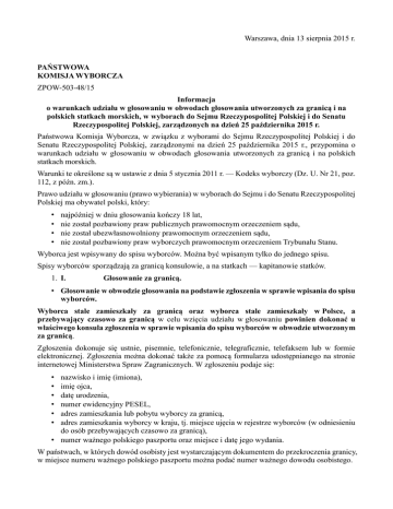 Warszawa, dnia 13 sierpnia 2015 r. PAŃSTWOWA KOMISJA WYBORCZA ZPOW-503-48/15 Informacja o warunkach udziału w głosowaniu w obwodach głosowania utworzonych za granicą i na polskich statkach morskich, w wyborach do Sejmu Rzeczypospolitej Polskiej i do Senatu Rzeczypospolitej Polskiej, zarządzonych na dzień 25 października 2015 r. Państwowa Komisja Wyborcza, w związku z wyborami do Sejmu Rzeczypospolitej Polskiej i do Senatu Rzeczypospolitej Polskiej, zarządzonymi na dzień 25 października 2015 r., przypomina o warunkach udziału w głosowaniu w obwodach głosowania utworzonych za granicą i na polskich statkach morskich. Warunki te określone są w ustawie z dnia 5 stycznia 2011 r. — Kodeks wyborczy (Dz. U. Nr 21, poz. 112, z późn. zm.). Prawo udziału w głosowaniu (prawo wybierania) w wyborach do Sejmu i do Senatu Rzeczypospolitej Polskiej ma obywatel polski, który: • • • • najpóźniej w dniu głosowania kończy 18 lat, nie został pozbawiony praw publicznych prawomocnym orzeczeniem sądu, nie został ubezwłasnowolniony prawomocnym orzeczeniem sądu, nie został pozbawiony praw wyborczych prawomocnym orzeczeniem Trybunału Stanu. Wyborca jest wpisywany do spisu wyborców. Można być wpisanym tylko do jednego spisu. Spisy wyborców sporządzają za granicą konsulowie, a na statkach — kapitanowie statków. 1. I. Głosowanie za granicą. • Głosowanie w obwodzie głosowania na podstawie zgłoszenia w sprawie wpisania do spisu wyborców. Wyborca stale zamieszkały za granicą oraz wyborca stale zamieszkały w Polsce, a przebywający czasowo za granicą w celu wzięcia udziału w głosowaniu powinien dokonać u właściwego konsula zgłoszenia w sprawie wpisania do spisu wyborców w obwodzie utworzonym za granicą. Zgłoszenia dokonuje się ustnie, pisemnie, telefonicznie, telegraficznie, telefaksem lub w formie elektronicznej. Zgłoszenia można dokonać także za pomocą formularza udostępnianego na stronie internetowej Ministerstwa Spraw Zagranicznych. W zgłoszeniu podaje się: • • • • • • nazwisko i imię (imiona), imię ojca, datę urodzenia, numer ewidencyjny PESEL, adres zamieszkania lub pobytu wyborcy za granicą, adres zamieszkania wyborcy w kraju, tj. miejsce ujęcia w rejestrze wyborców (w odniesieniu do osób przebywających czasowo za granicą), • numer ważnego polskiego paszportu oraz miejsce i datę jego wydania. W państwach, w których dowód osobisty jest wystarczającym dokumentem do przekroczenia granicy, w miejsce numeru ważnego polskiego paszportu można podać numer ważnego dowodu osobistego. Zgłoszenia dokonuje się najpóźniej w 3. dniu przed dniem wyborów, tj. do dnia 22 października 2015 r. Obwody głosowania za granicą tworzy Minister Spraw Zagranicznych w drodze rozporządzenia. Wykaz tych obwodów będzie dostępny we wszystkich polskich placówkach konsularnych, delegaturach Krajowego Biura Wyborczego oraz na stronie internetowej Państwowej Komisji Wyborczej http://parlament2015.pkw.gov.pl. • Głosowanie korespondencyjne Wyborca stale zamieszkały za granicą oraz wyborca stale zamieszkały w Polsce, a przebywający czasowo za granicą może głosować korespondencyjnie. W tym celu powinien dokonać u właściwego konsula zgłoszenia zamiaru głosowania korespondencyjnego. Zamiar głosowania korespondencyjnego powinien być zgłoszony przez wyborcę, najpóźniej w 18. dniu przed dniem wyborów, tj. do dnia 7 października 2015 r. Zgłoszenie może być dokonane ustnie, pisemnie, telefaksem lub w formie elektronicznej. W zgłoszeniu podaje się: • • • • • • • oznaczenie wyborów, których dotyczy zgłoszenie, nazwisko i imię (imiona), imię ojca, datę urodzenia, numer ewidencyjny PESEL, adres zamieszkania lub pobytu wyborcy za granicą, adres zamieszkania wyborcy w kraju, tj. miejsce ujęcia w rejestrze wyborców (w odniesieniu do osób przebywających czasowo za granicą), • numer ważnego polskiego paszportu oraz miejsce i datę jego wydania. W państwach, w których dowód osobisty jest wystarczającym dokumentem do przekroczenia granicy, w miejsce numeru ważnego polskiego paszportu można podać numer ważnego dowodu osobistego, • adres, pod który ma zostać wysłany przez konsula pakiet wyborczy zawierający karty do głosowania, albo deklarację osobistego odbioru pakietu wyborczego u konsula. W przypadku gdy wyborca zgłosił zamiar głosowania korespondencyjnego za granicą, wyborcy temu zaświadczenia o prawie do głosowania w miejscu pobytu w dniu wyborów nie wydaje się po wysłaniu do wyborcy pakietu wyborczego, chyba że zwrócił on pakiet wyborczy w stanie nienaruszonym. • Głosowanie na podstawie zaświadczenia o prawie do głosowania. · Wyborca stale zamieszkały w kraju zamierzający głosować za granicą może otrzymać zaświadczenie o prawie do głosowania. Z zaświadczeniem takim można głosować w dowolnym obwodzie głosowania w kraju, za granicą lub na polskim statku morskim. Wniosek o wydanie zaświadczenia o prawie do głosowania składa się w urzędzie gminy, w której wyborca będzie ujęty w spisie wyborców, najpóźniej w 2. dniu przed dniem wyborów, tj. do dnia 23 października 2015 r. Wniosek o wydanie zaświadczenia o prawie do głosowania może zostać złożony pisemnie, telefaksem lub w formie elektronicznej (nie jest wymagane posiadanie profilu zaufanego lub kwalifikowanego podpisu elektronicznego). Wniosek może być zatem złożony za pośrednictwem poczty elektronicznej (e-mail). Do odbioru zaświadczenia wyborca może upoważnić inną osobę. Wówczas wyborca sporządza wniosek o wydanie zaświadczenia i upoważnienie (może to być jeden dokument), w którym wskazuje swoje imię (imiona) i nazwisko oraz numer PESEL, a także dane osoby upoważnionej do odebrania zaświadczenia. Wniosek i upoważnienie do odbioru zaświadczenia mogą być przekazane na piśmie (np. za pośrednictwem innej osoby, poczty, kuriera lub złożone w bi