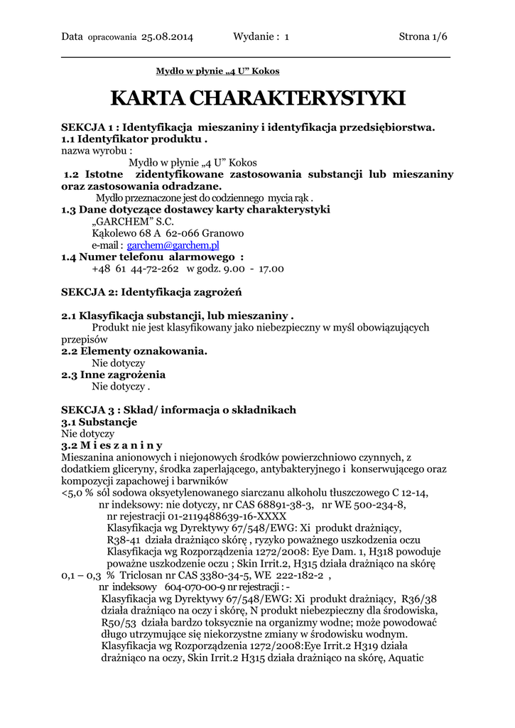 Data opracowania 25.08.2014 Wydanie : 1 Strona 1/6 Mydło w płynie „4 U” Kokos KARTA CHARAKTERYSTYKI SEKCJA 1 : Identyfikacja mieszaniny i identyfikacja przedsiębiorstwa. 1.1 Identyfikator produktu . nazwa wyrobu : Mydło w płynie „4 U” Kokos 1.2 Istotne zidentyfikowane zastosowania substancji lub mieszaniny oraz zastosowania odradzane. Mydło przeznaczone jest do codziennego mycia rąk . 1.3 Dane dotyczące dostawcy karty charakterystyki „GARCHEM” S.C. Kąkolewo 68 A 62-066 Granowo e-mail : [email protected] 1.4 Numer telefonu alarmowego : +48 61 44-72-262 w godz. 9.00 - 17.00 SEKCJA 2: Identyfikacja zagrożeń 2.1 Klasyfikacja substancji, lub mieszaniny . Produkt nie jest klasyfikowany jako niebezpieczny w myśl obowiązujących przepisów 2.2 Elementy oznakowania. Nie dotyczy 2.3 Inne zagrożenia Nie dotyczy . SEKCJA 3 : Skład/ informacja o składnikach 3.1 Substancje Nie dotyczy 3.2 M i es z a n i n y Mieszanina anionowych i niejonowych środków powierzchniowo czynnych, z dodatkiem gliceryny, środka zaperlającego, antybakteryjnego i konserwującego oraz kompozycji zapachowej i barwników <5,0 % sól sodowa oksyetylenowanego siarczanu alkoholu tłuszczowego C 12-14, nr indeksowy: nie dotyczy, nr CAS 68891-38-3, nr WE 500-234-8, nr rejestracji 01-2119488639-16-XXXX Klasyfikacja wg Dyrektywy 67/548/EWG: Xi produkt drażniący, R38-41 działa drażniąco skórę , ryzyko poważnego uszkodzenia oczu Klasyfikacja wg Rozporządzenia 1272/2008: Eye Dam. 1, H318 powoduje poważne uszkodzenie oczu ; Skin Irrit.2, H315 działa drażniąco na skórę 0,1 – 0,3 % Triclosan nr CAS 3380-34-5, WE 222-182-2 , nr indeksowy 604-070-00-9 nr rejestracji : Klasyfikacja wg Dyrektywy 67/548/EWG: Xi produkt drażniący, R36/38 działa drażniąco na oczy i skórę, N produkt niebezpieczny dla środowiska, R50/53 działa bardzo toksycznie na organizmy wodne; może powodować długo utrzymujące się niekorzystne zmiany w środowisku wodnym. Klasyfikacja wg Rozporządzenia 1272/2008:Eye Irrit.2 H319 działa drażniąco na oczy, Skin Irrit.2 H315 działa drażniąco na skórę, Aquatic Data opracowania 25.08.2014 Wydanie : 1 Strona 2/6 Mydło w płynie „4 U” Kokos Acute1 H400 działa bardzo toksycznie na organizmy wodne, Aquatic Chronic 1 H410 działa bardzo toksycznie na organizmy wodne, powodując długotrwałe skutki SEKCJA 4. Środki pierwszej pomocy 4.1 Opis środków pierwszej pomocy Drogi oddechowe: Nie występuje. Oczy: Przepłukać oczy wodą . W przypadku wystąpienia podrażnienia skontaktować się z lekarzem. Skóra: Nie występuje. Połknięcie: Brak 4.2 Najważniejsze ostre i opóźnione objawy oraz skutki narażenia Brak 4.3 Wskazania dotyczące wszelkiej natychmiastowej pomocy lekarskiej i szczegółowego postępowania z poszkodowanym Brak SEKCJA 5. Postępowanie w przypadku pożaru 5.1 Środki gaśnicze: Produkt niepalny . Pożary w obecności produktu gasić środkami właściwymi dla palących się materiałów . 5.2 Szczegółowe zagrożenia związane z substancją lub mieszaniną Brak 5.3 Informacje dla straży pożarnej Zbiorniki narażone na działanie wysokiej temperatury chłodzić wodą z bezpiecznej odległości. O ile to możliwe usunąć produkt z obszaru zagrożenia. Środki ochrony dróg oddechowych, ubranie i rękawice ługoodporne SEKCJA 6. Postępowanie w przypadku niezamierzonego uwolnienia do środowiska 6.1 Indywidualne środki ostrożności, wyposażenie ochronne i procedury w sytuacjach awaryjnych Odzież ochronna , rękawice ochronne z tworzywa sztucznego 6.2 Środki ostrożności w zakresie ochrony środowiska O ile to możliwe zlikwidować wyciek. Nie dopuścić do przedostania się do wód gruntowych, zbiorników wodnych i kanalizacji 6.3 Metody i materiały zapobiegające rozprzestrzenianiu się skażenia i służące do usuwania skażenia Przy dużych wyciekach miejsce gromadzenia się cieczy obwałować , zebraną ciecz odpompować. Małe ilości cieczy przysypać niepalnym materiałem chłonnym , zebrać do zamykanego pojemnika i skierować do utylizacji , a zanieczyszczoną powierzchnię spłukać obficie wodą . 6.4 Odniesienia do innych sekcji Informacje dotyczące odpowiedniego sprzętu ochrony osobistej podano w sekcji 8 Data opracowania 25.08.2014 Wydanie : 1 Strona 3/6 Mydło w płynie „4 U” Kokos Usuwać zgodnie z zaleceniami przedstawionymi w sekcji 13 SEKCJA 7. Postępowanie z substancjami i mieszaninami oraz ich magazynowanie 7.1 Środki ostrożności dotyczące bezpiecznego postępowania Postępować zgodnie z ogólnie przyjętymi zasadami bezpieczeństwa . 7.2 Warunki bezpiecznego magazynowania łącznie z informacjami dotyczącymi wszelkich wzajemnych niezgodności Przechowywać w szczelnie zamkniętych pojemnikach nie narażonych na działanie promieni słonecznych , w wydzielonym pomieszczeniu magazynowym w temperaturze dodatniej . 7.3 Szczególne zastosowanie(-a) końcowe Nieznane SEKCJA 8. Kontrola narażenia i środki ochrony indywidualnej 8.1 Parametry dotyczące kontroli Najwyższe dopuszczalne stężenia : ( wg rozporządzenia MPiPS z dn. 29.11.2002 ; Dz.U. Nr 217 poz. 1833 z pózn. zm.) NDS i NDSCh nieokreślone 8.2 Kontrola narażenia Ochrona dróg oddechowych: Nie jest wymagana Ochrona ciała: Nie jest wymagana Ochrona rąk: Nie jest wymagana Ochrona oczu: Nie jest wymagana SEKCJA 9. Własności fizyczne i chemiczne 9.1 Informacje na temat podstawowych właściwości fizycznych i chemicznych Wygląd : lepka opalizująca ciecz barwy białej Zapach : przyjemny, właściwy dla użytej kompozycji zapachowej pH : 5,50-6,00 temperatura wrzenia [°C ] : ok. 100 temperatura topnienia [°C] : ok. 0 temperatura zapłonu [°C ] : brak danych temperatura samozapłonu [°C ] : nie dotyczy dolna granica wybuchowości : nie dotyczy górna granica wybuchowości : nie dotyczy gęstość par względem powietrza : brak danych współczynnik załamania światła : brak danych współczynnik podziału n-oktanol – woda : brak dany