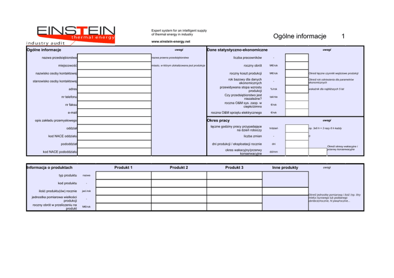 Expert system for an intelligent supply of thermal energy in industry Ogólne informacje 1 www.einstein-energy.net Ogólne informacje uwagi nazwa przedsiębiorstwa Dane statystyczno-ekonomiczne liczba pracowników nazwa prawna przedsiębiorstwa miejscowość M€/rok roczny koszt produkcji M€/rok rok bazowy dla danych ekonomicznych przewidywana stopa wzrostu produkcji Czy przedsiębiorstwo jest niezależne? roczna O&M sys. zaop. w ciepło/zimno stanowisko osoby kontaktowej adres nr telefonu nr faksu e-mail roczna O&M sprzętu elektrycznego %/rok Określ rok odniesienia dla parametrów ekonomicznych wskaźnik dla najbliższych 5 lat tak/nie €/rok €/rok uwagi oddział łączne godziny pracy przypadające na dzień roboczy kod NACE oddziału liczba zmian pododdział dni produkcji / eksploatacji rocznie kod NACE pododdziału okres wakacyjny/przerwy konserwacyjne Informacja o produktach Produkt 1 typ produktu nazwa kod produktu - jednostka pomiarowa wielkości produkcji roczny obrót w przeliczeniu na produkt - Określ łączne czynniki wejściowe produkcji Okres pracy opis zakładu przemysłowego ilość produktu(ów) rocznie - roczny obrót miasto, w którym zlokalizowana jest produkcja nazwisko osoby kontaktowej uwagi Produkt 2 Produkt 3 h/dzień dni dd/mm Inne produkty np. 3x6 h = 3 razy 6 h każdy 0 Określ okresy wakacyjne i przerwy konserwacyjne uwagi jed./rok M€/rok Określ jednostkę pomiarową i ilość (np. litry mleka (surowego lub poddanego obróbce)/rocznie, hl piwa/rocznie... Expert system for an intelligent supply of thermal energy in industry Zużycie paliwa i koszt 2 www.einstein-energy.net Zużycie paliwa i koszt 1 Stosowane paliwa 2 3 4 5 6 jednostka roczne zużycie Jeśli to możliwe, przedstaw dane miesięczne w oddzielanym arkuszu i/lub rachunki za paliwo. Określ ekwiwalent energetyczny w bazie LCV (niższa wartość opałowa) jed./rok MWh / rok(LCV) cena paliwa €/kWh LCV roczny koszt energii Określ wydatki bez VAT €/rok Łączny koszt Zużycie energii elektrycznej i koszt Taryfa roczne zużycie Szczyt Poza szczytem samogeneracja (CHP) Razem sprzedaż do sieci (CHP) MWh / rok moc zakontraktowana - Określ wydatki bez VAT € / kW miesiąc taryfa za zużycie Stały koszt zaopatrzenia €/MWh łączny koszt roczny energii Dane mies. i/lub rach. za paliwo wpisz w oddz. arkusz Określ zużycie w różnych okresach generacji (CHP), podaj dane o łącznej prod. en. ele. i sprzedaży do sieci kW typ taryfy / klasa taryfa mocy zainstalowanej Standard Koszt zużycia bez kosztów stałych €/rok Łączny koszt / łączna sprzedaż (łącznie z dodatkami) En. ele. do celów cieplnych En. ele. dla celów nie cieplnych Zużycie en. ele. wg. zastosowania Chłodnictwo Klimatyzacja Inne cele Silniki i maszyny pr. elektrochemiczne Produkt 1 Produkt 2 Produkt 3 Inne Usługi dodat. Oświetlenie Jeśli są inne cele, określ je w oddzielnym arkuszu MWh / rok Zużycie energii wg produktu/usługi Łączne zużycie paliwa Zużycie energii MWh / rok (LCV) MWh / rok % % kosztów za en. ele. w kosztach produkcji: Jeśli to możliwe, określ zużycie energii różnych linii produkcyjnych Expert system for an intelligent supply of thermal energy in industry Opis procesów 3 www.einstein-energy.net Opis procesów 1 2 3 Przedstaw schemat organizacyjny procesu produkcji (np. przepływ surowego mleka w produkcji sera lub przepływ karoserii w przemyśle samochodowym) skrótowiec procesu - opis procesu - Przedstaw krótki opis procesu lub operacji jednostkowej typ procesu ciągły/seryjny Określ typ operacji jednostkowej (klasyfikacja EINSTEIN) typ operacji jednostkowej - Określ czy jest to proces ciągły lub seryjny produkt lub medium procesu (woda, olej, powietrze, ...) typowa (ostateczna) temp. medium procesowego podczas działania wejściowa temp. medium procesowego (przed odzyskiem ciepła) temp. rozruchu medium procesowego (po przerwach) - Medium, które jest w bezpośrednim kontakcie z obrabianym produktem, np. powietrze do suszenia, ług lub woda do mycia, itp. dzienny wpływ medium procesowego ilość medium w urządzeniach oraz zmagazynowanego Procesowe zapotrzebowanie na moc w trakcie działania °C Podaj temperaturę medium procesowego a nie medium doprowadzającego ciepło °C Temperatura wejściowa medium procesowego (przed odzyskiem ciepła) ºC Temperatura sprzętu procesowego przed podgrzaniem w trakcie rozruchu procesu m³ Proces ciągły: Tempo przepływu cieczy godziny obiegu. Proces seryjny z wymianą cieczy: wielkość numer serii m³ np. objętość cieczy w butelce do czyszczenia kW Zapotrzebowanie mocy w czasie operacji w stanie obecnym (straty cieplne, wyparowanie, endogeniczne reakcje chemiczne; bez ogrzewania cieczy cyrkulacyjnej) Odzysk ciepła odpadowego dla tego procesu Czy istnieje ciepło z odzysku ciepła dla procesu? źródło ciepła odpadowego wejściowa temperatura medium procesowego (po odzysku ciepła) (tak/nie) °C Ciepło odpadowe (dostępne do odzysku ciepła) medium wylotowego ciepła odpadowego temperatura wylotowego ciepła (odpadowego) jednostkowa entalpia dla wylotowego ciepła (odpadowego) końcowa temperatura wylotowego ciepła (odpadowego) dzienny wypływ medium procesowego czy ciepło można odzyskać z wypływającego medium? - Jeśli tak, przedstaw krótki opis systemu odzysku ciepła Określ źródło ciepła odpadowego (np. ciepło stracone w trakcie procesu X, gazy spalinowe z kotła Y, itp.) Temperatura wejściowa (w kierunku systemu) medium procesowego po odzysku ciepła uwagi Określ media wypływów ciepła odpadowego (do 3) °C Temperatura wypływu ciepła odpadowego (np. wody lub gorącej pary przy wylocie procesu osuszania) °C Entalpia wylotu ciepła odpadowego (np. wody lub gorącej pary przy wylocie procesu osuszania) ºC Min. temp. dop. schłodzenia wylot. ciepła odp. Jeżeli brak wart. gran. wpisz 0. m³ Może różnić się od wpływu, jeśli np. następuje wyparowanie lub jakaś reakcja chemiczna. (tak/nie) Jeśli
