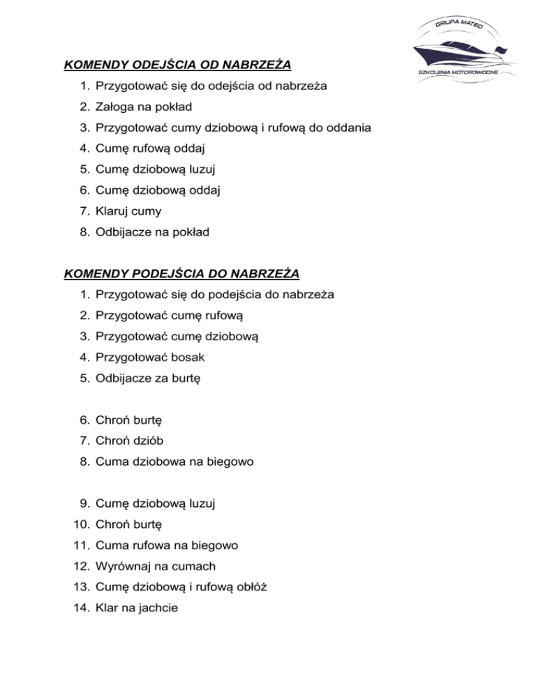 KOMENDY ODEJŚCIA OD NABRZEŻA 1. Przygotować się do odejścia od nabrzeża 2. Załoga na pokład 3. Przygotować cumy dziobową i rufową do oddania 4. Cumę rufową oddaj 5. Cumę dziobową luzuj 6. Cumę dziobową oddaj 7. Klaruj cumy 8. Odbijacze na pokład KOMENDY PODEJŚCIA DO NABRZEŻA 1. Przygotować się do podejścia do nabrzeża 2. Przygotować cumę rufową 3. Przygotować cumę dziobową 4. Przygotować bosak 5. Odbijacze za burtę 6. Chroń burtę 7. Chroń dziób 8. Cuma dziobowa na biegowo 9. Cumę dziobową luzuj 10. Chroń burtę 11. Cuma rufowa na biegowo 12. Wyrównaj na cumach 13. Cumę dziobową i rufową obłóż 14. Klar na jachcie